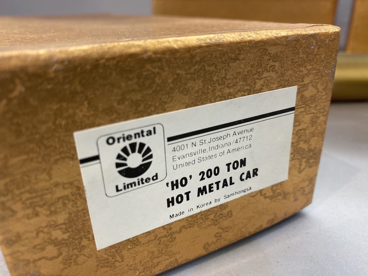 Oriental Limited HO 200 ton hot metal car three pieces. Made in Korea by Samhongsa. With original boxes.