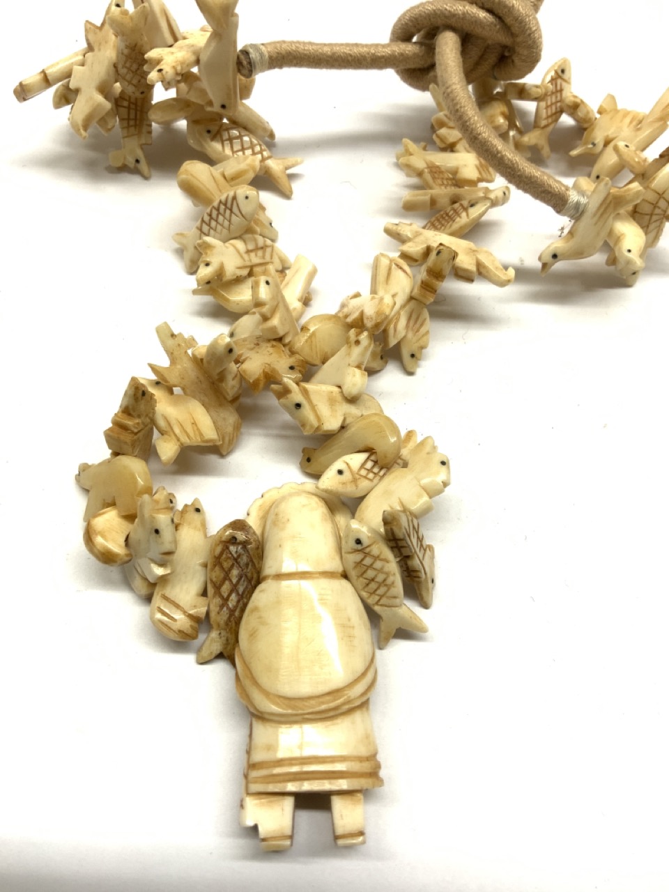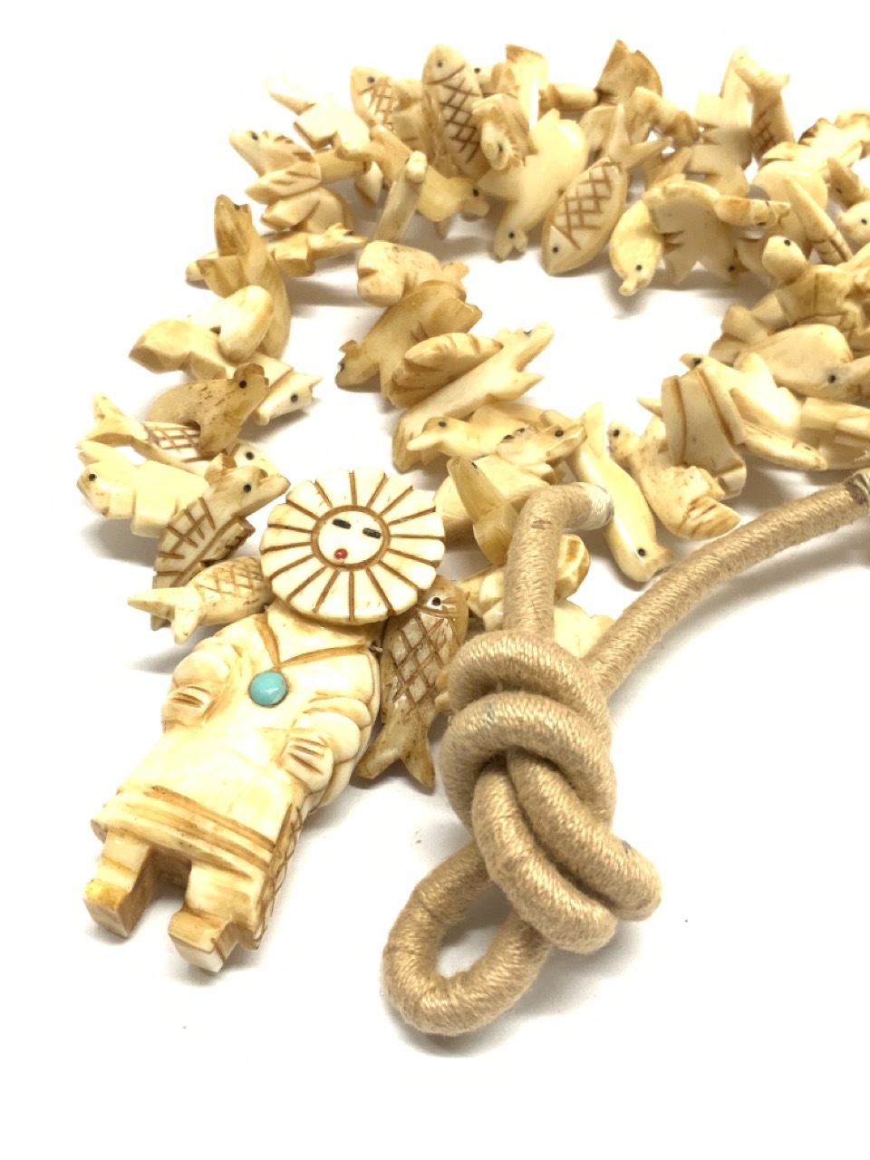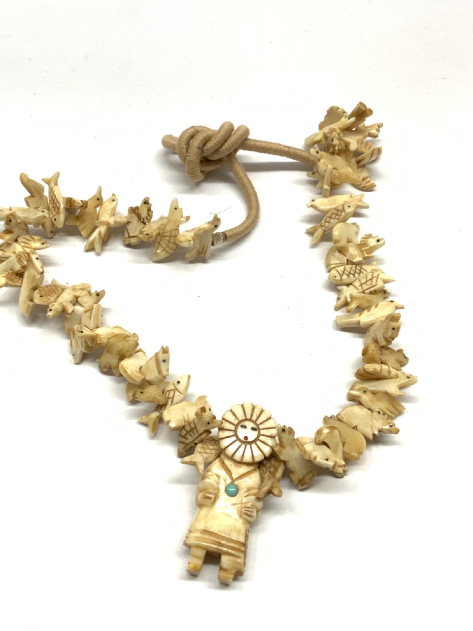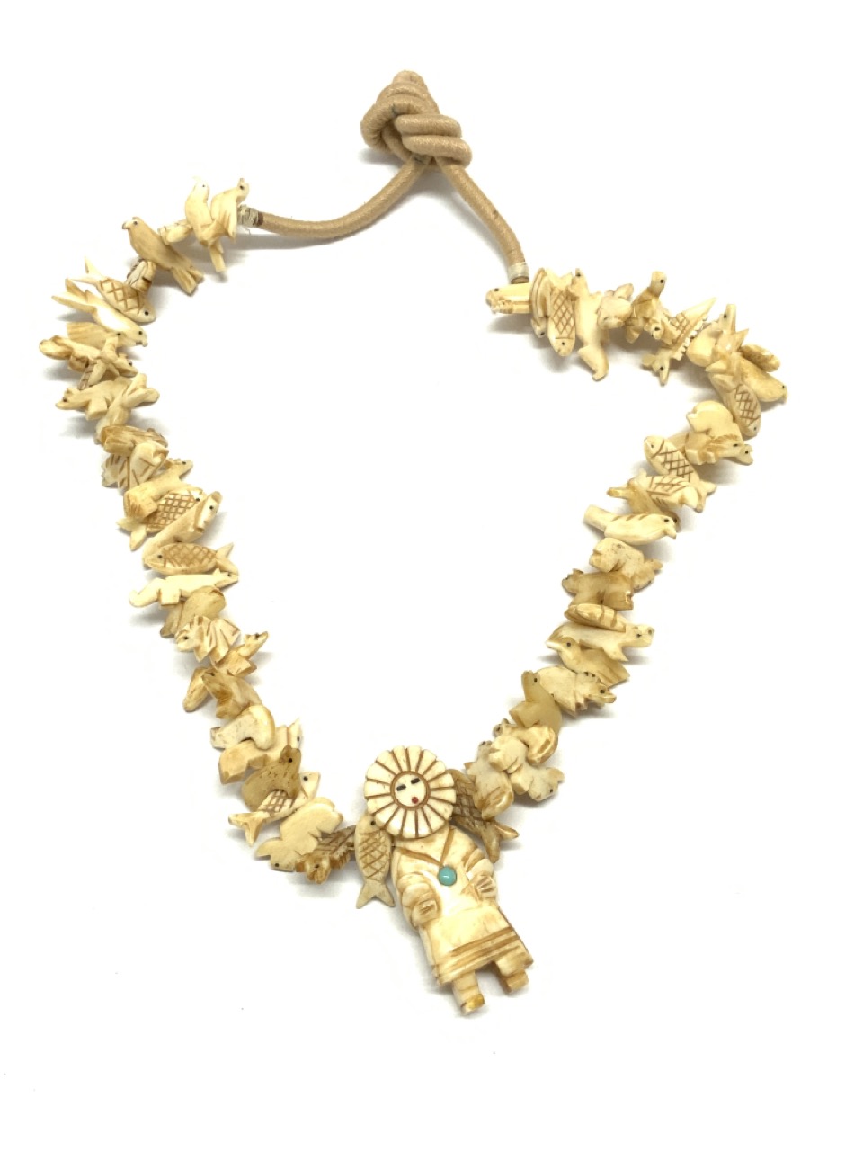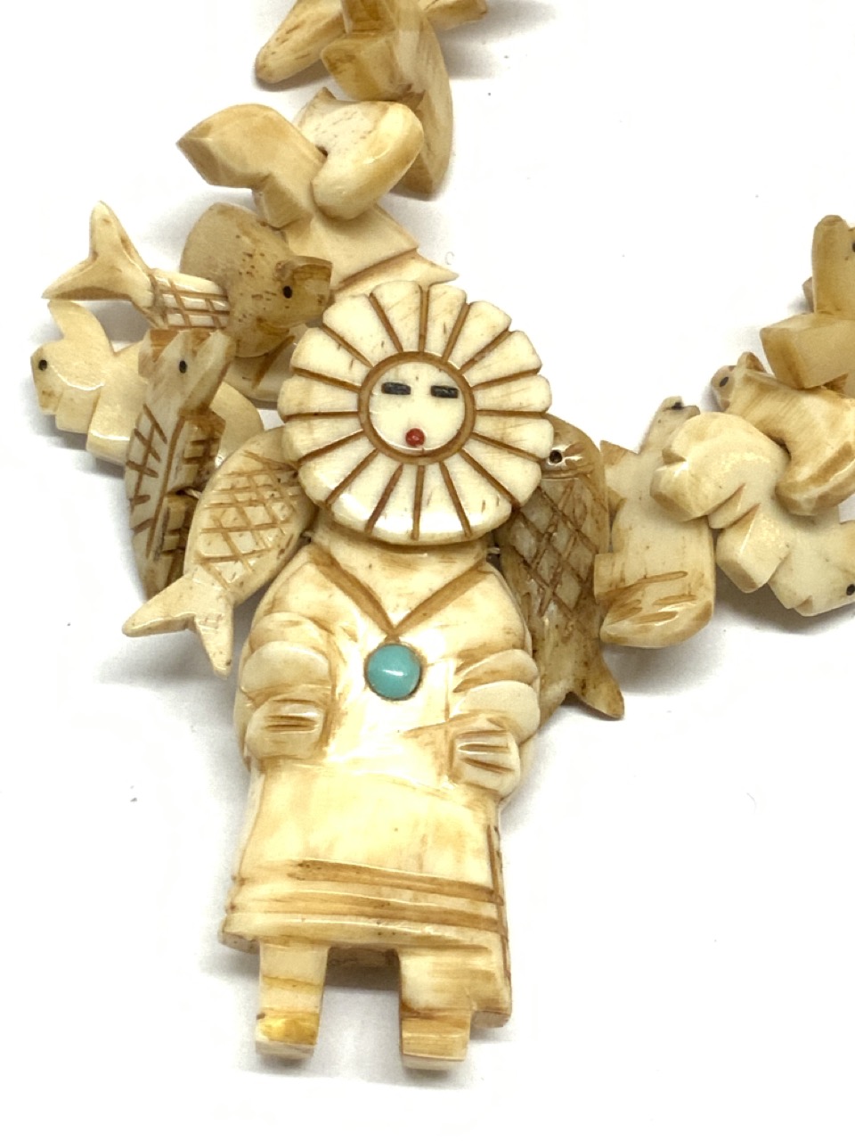 An American Indian Zuni Tribe carved bone necklace with Sun Kachina figure.