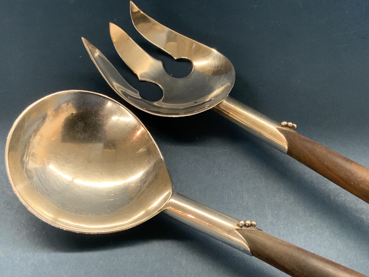Mexican sterling silver and wood salad serving set. Spoon and fork measuring 12" length and 2 1/14" width.