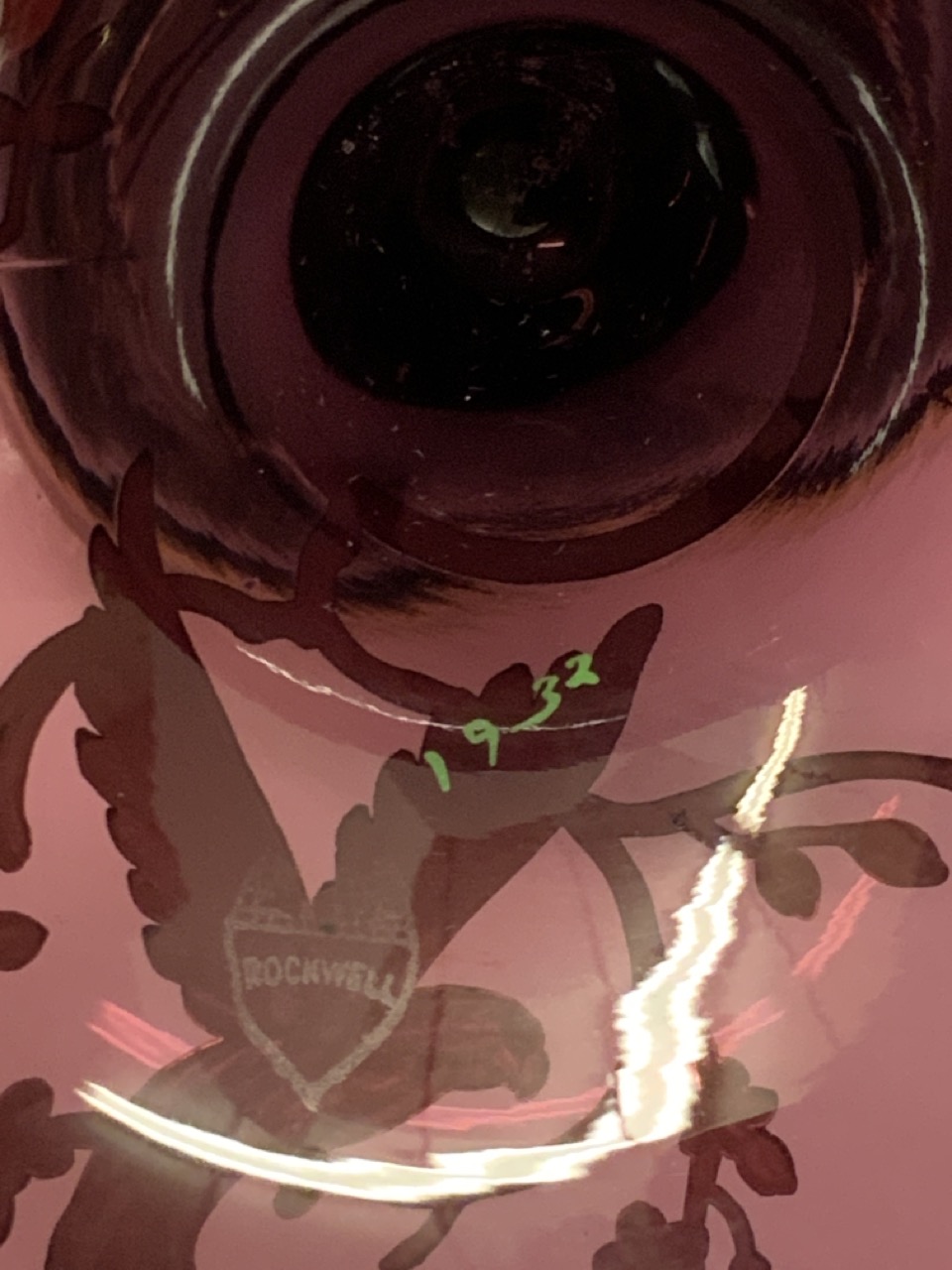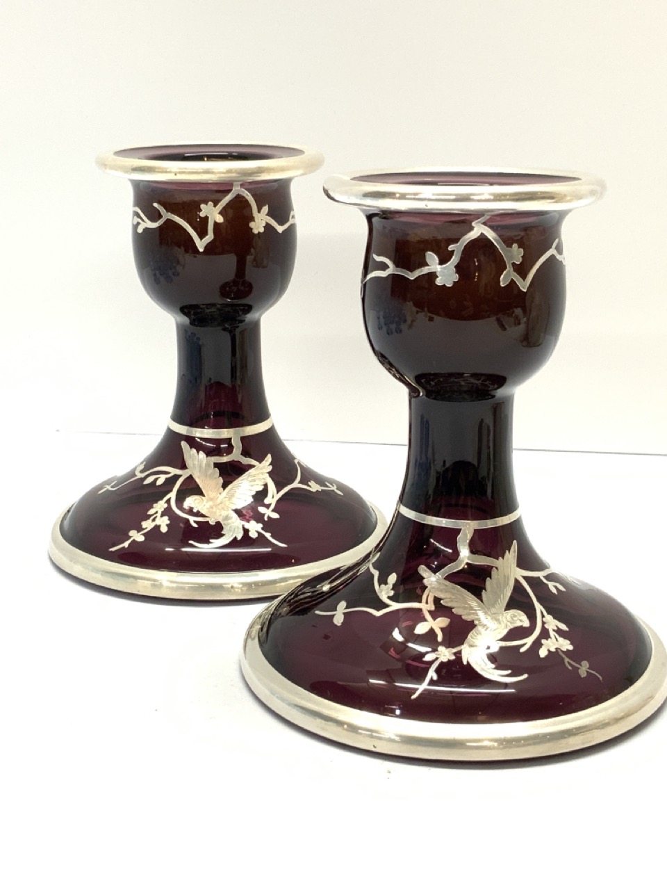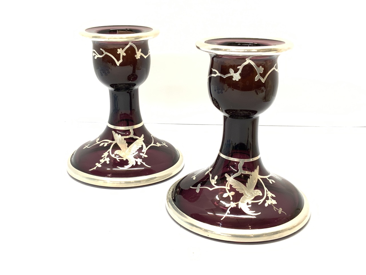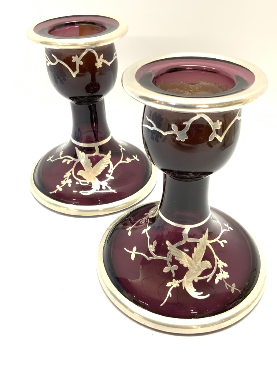 Rockwell Amethyst Glass With Sterling Silver Overlay. Condition is near pristine. Candle wax present in holders. Signed at base.