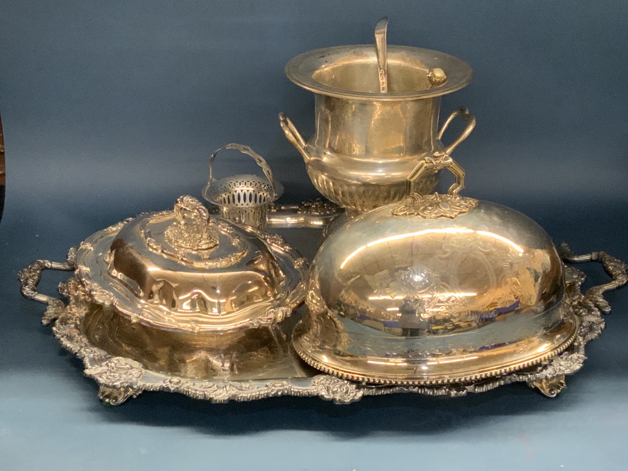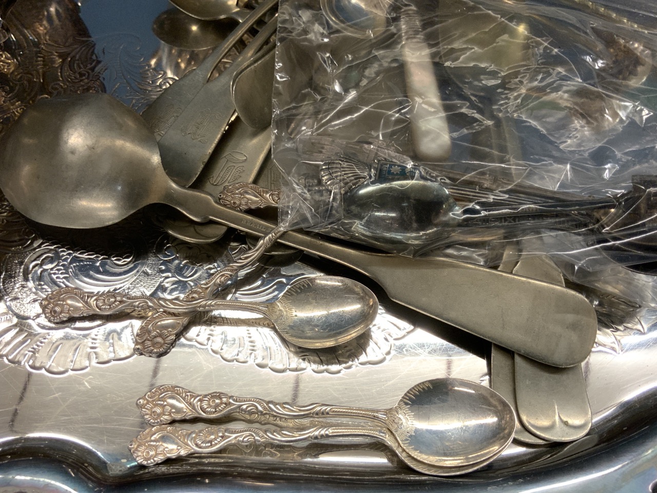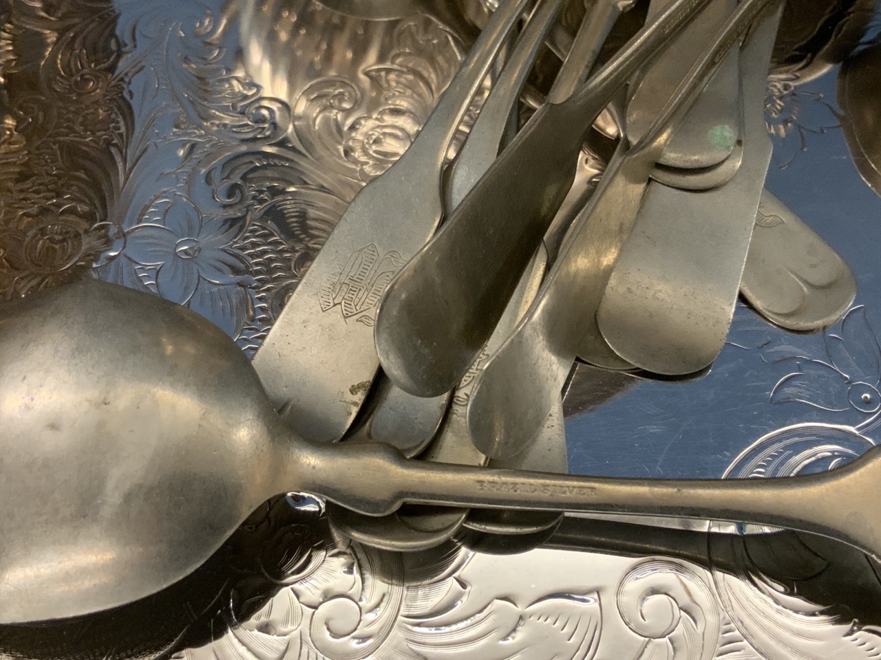 Assorted silver plated flatware. champagne bucket, tray, dome top lid, covered warming dish, flatware, Brazilian Silver, Souvenir spoons, flatware etc. As seen in photograph preview.