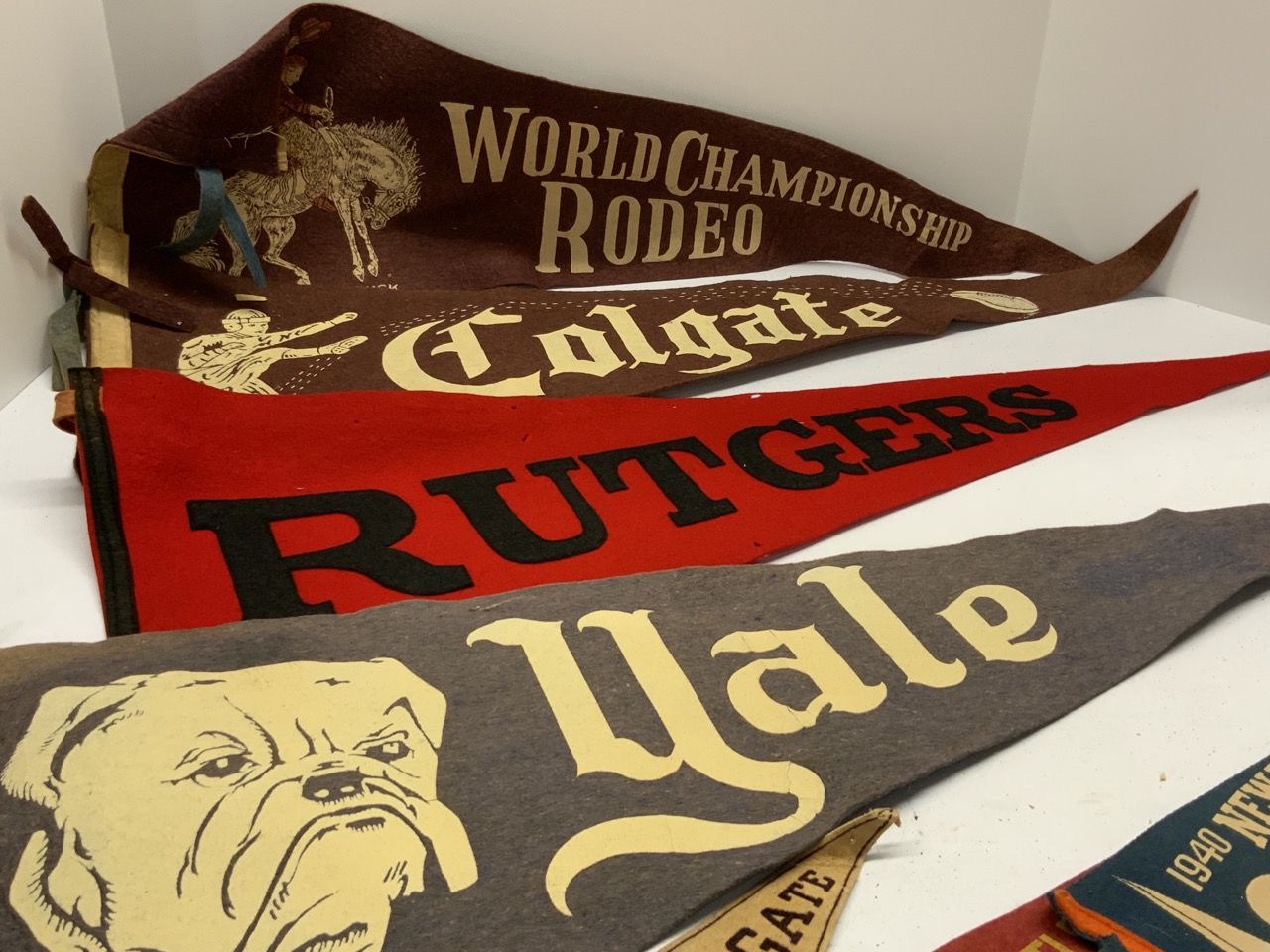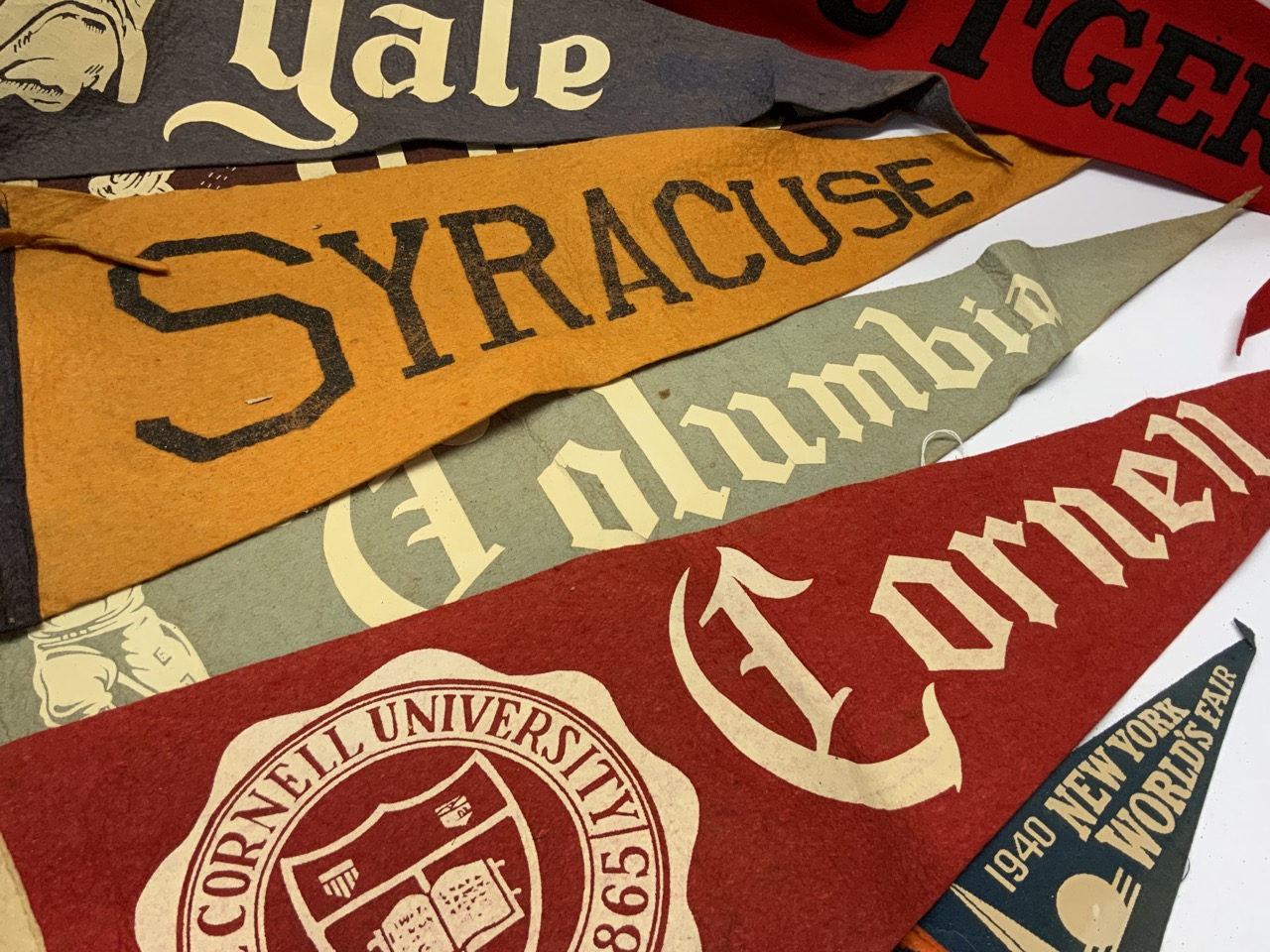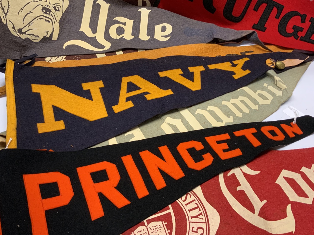 A lot of vintage pennants. Colgate, Syracuse, New Rochelle, Yale, Princeton, Cornell, Navy, Columbia, Rutgers, Notre Dame, Harvard, Pennsylvania, Rutgers and miniature N.Y. World's Fair. Some holes noted. Please see photograph preview.