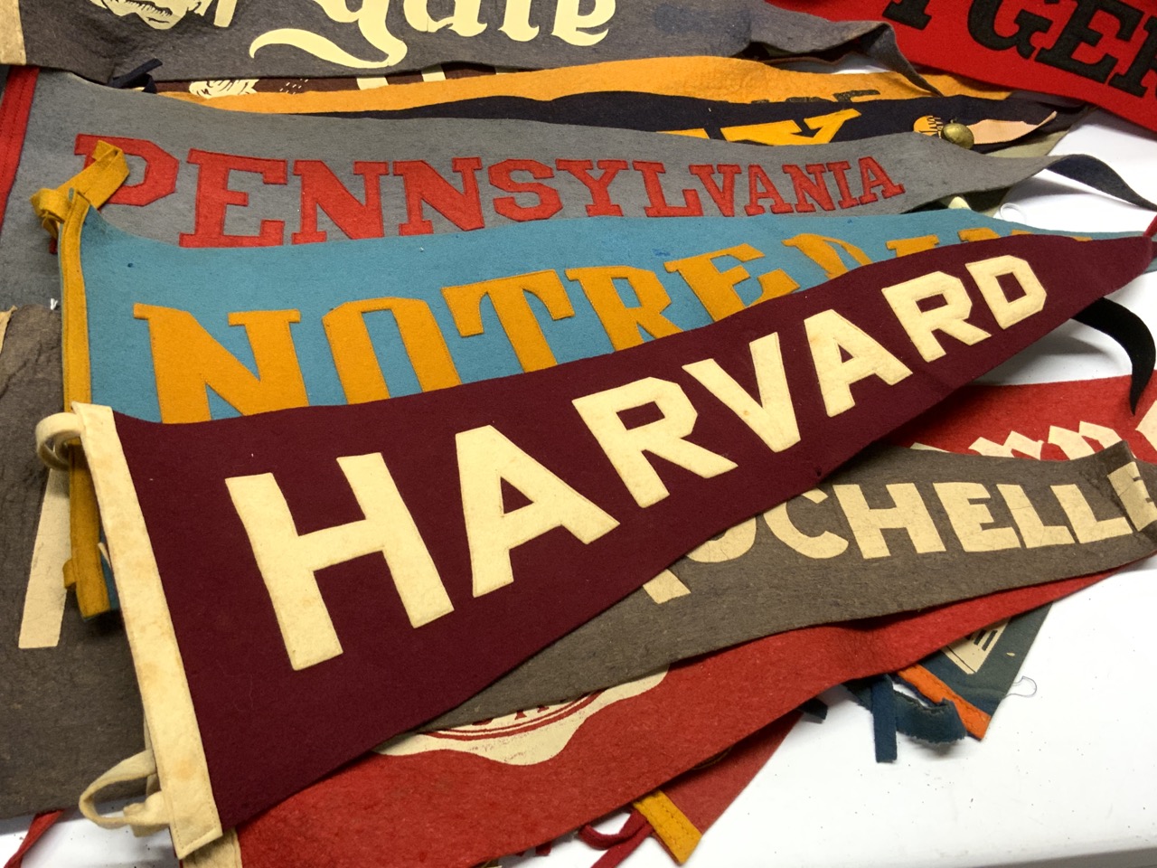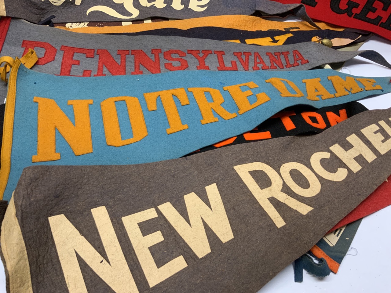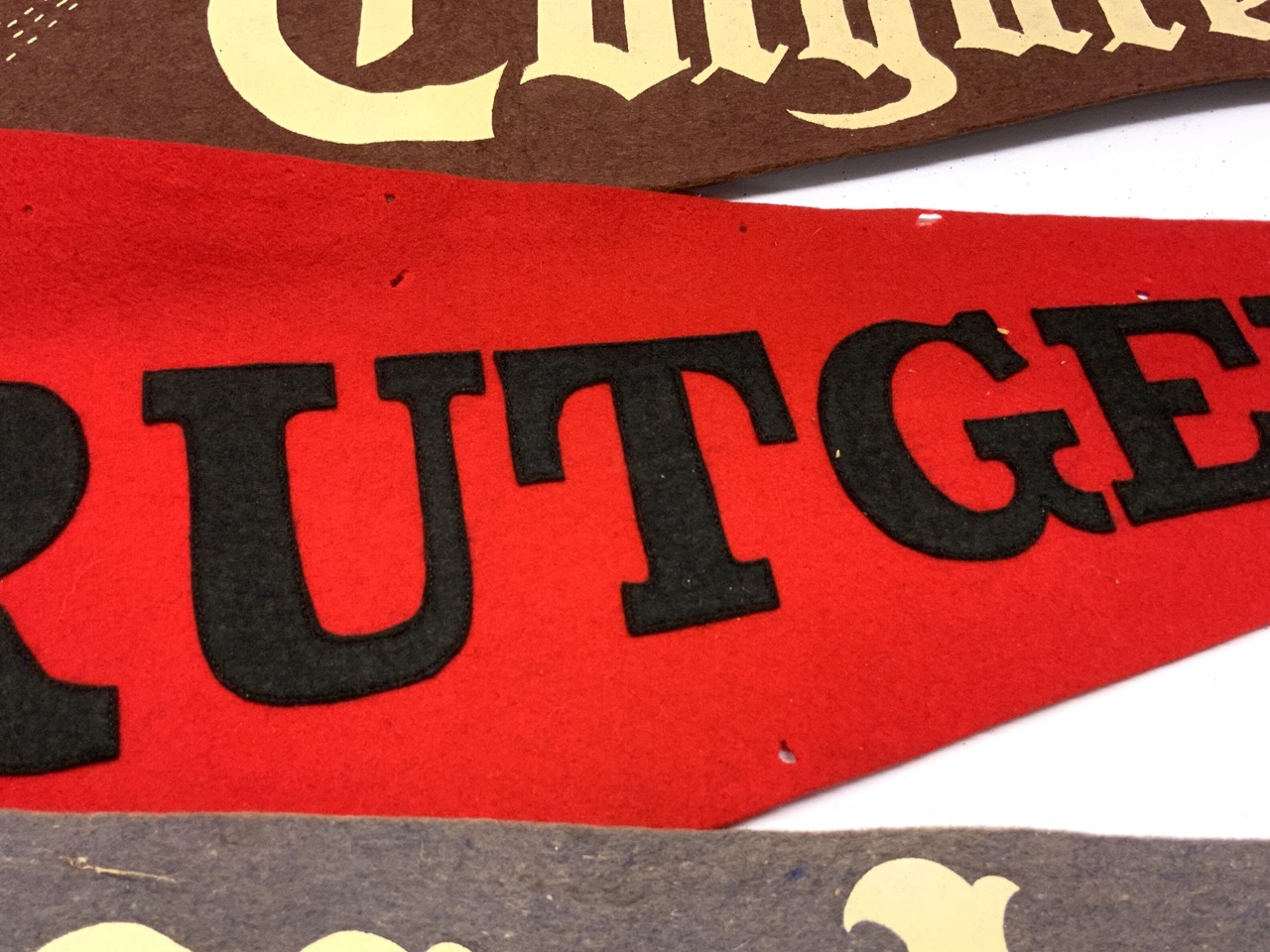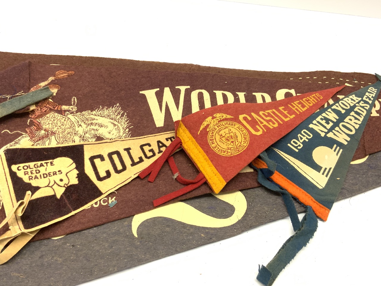 A lot of vintage pennants. Colgate, Syracuse, New Rochelle, Yale, Princeton, Cornell, Navy, Columbia, Rutgers, Notre Dame, Harvard, Pennsylvania, Rutgers and miniature N.Y. World's Fair. Some holes noted. Please see photograph preview.