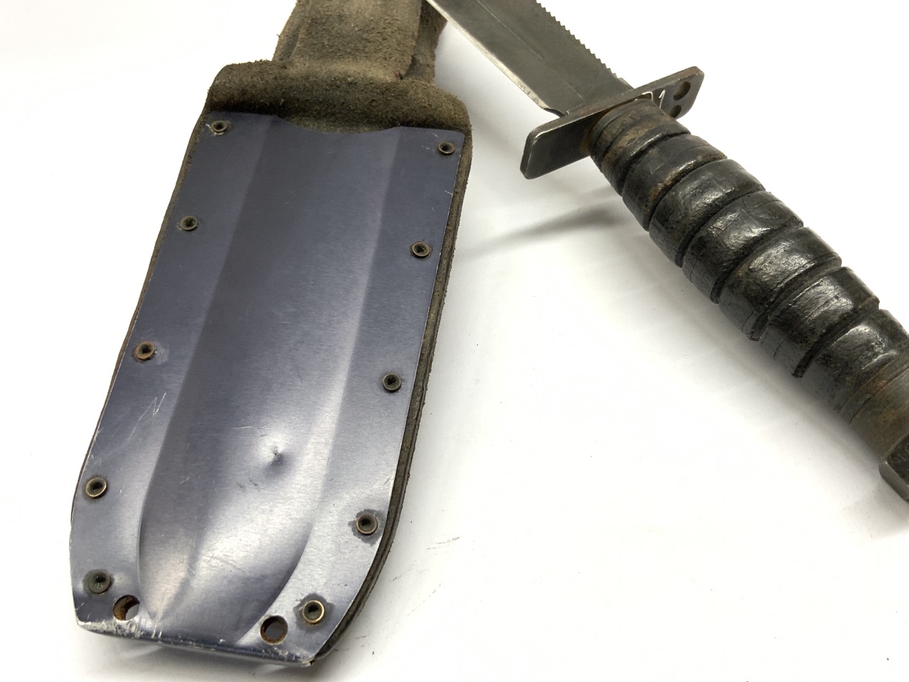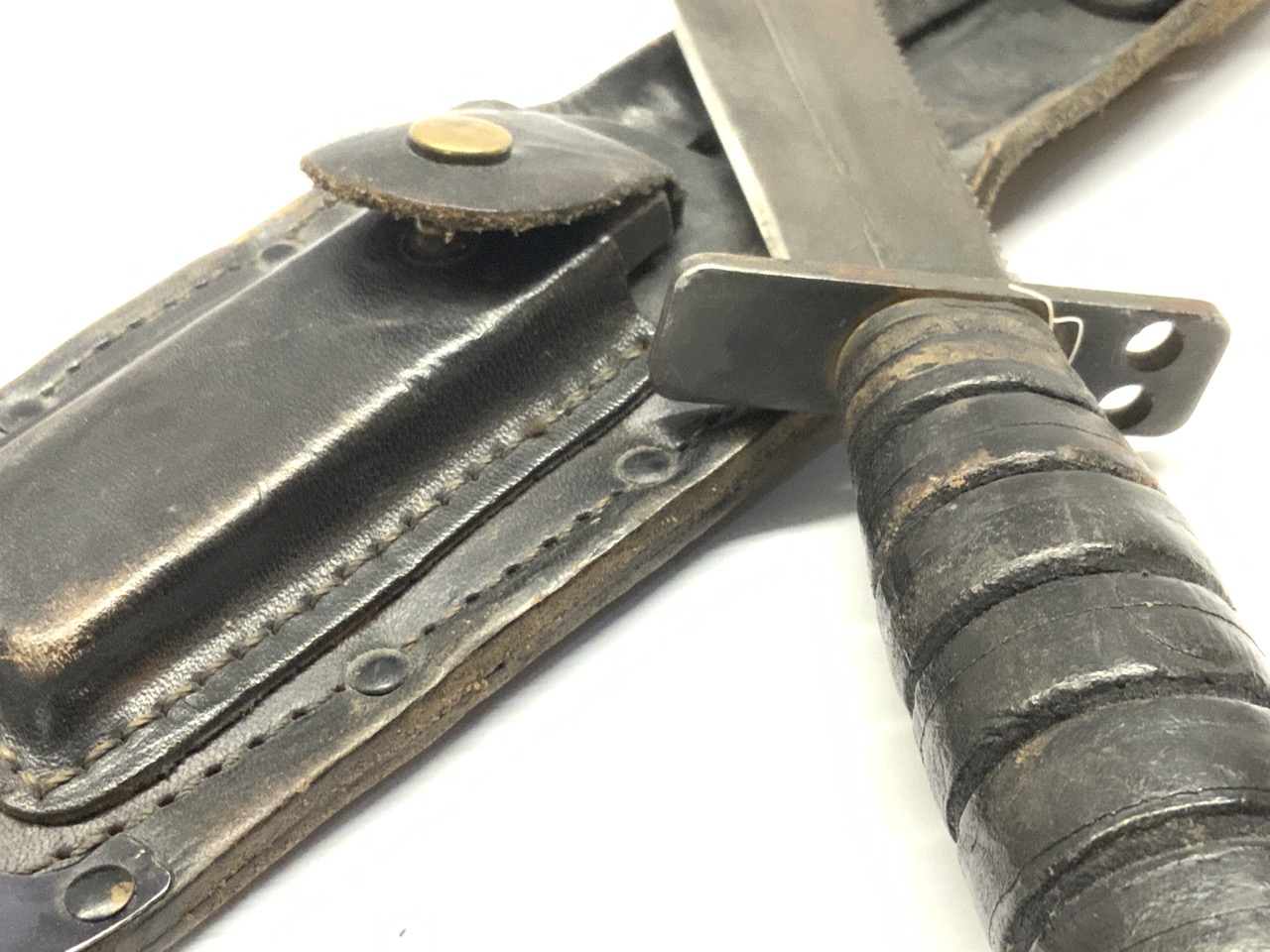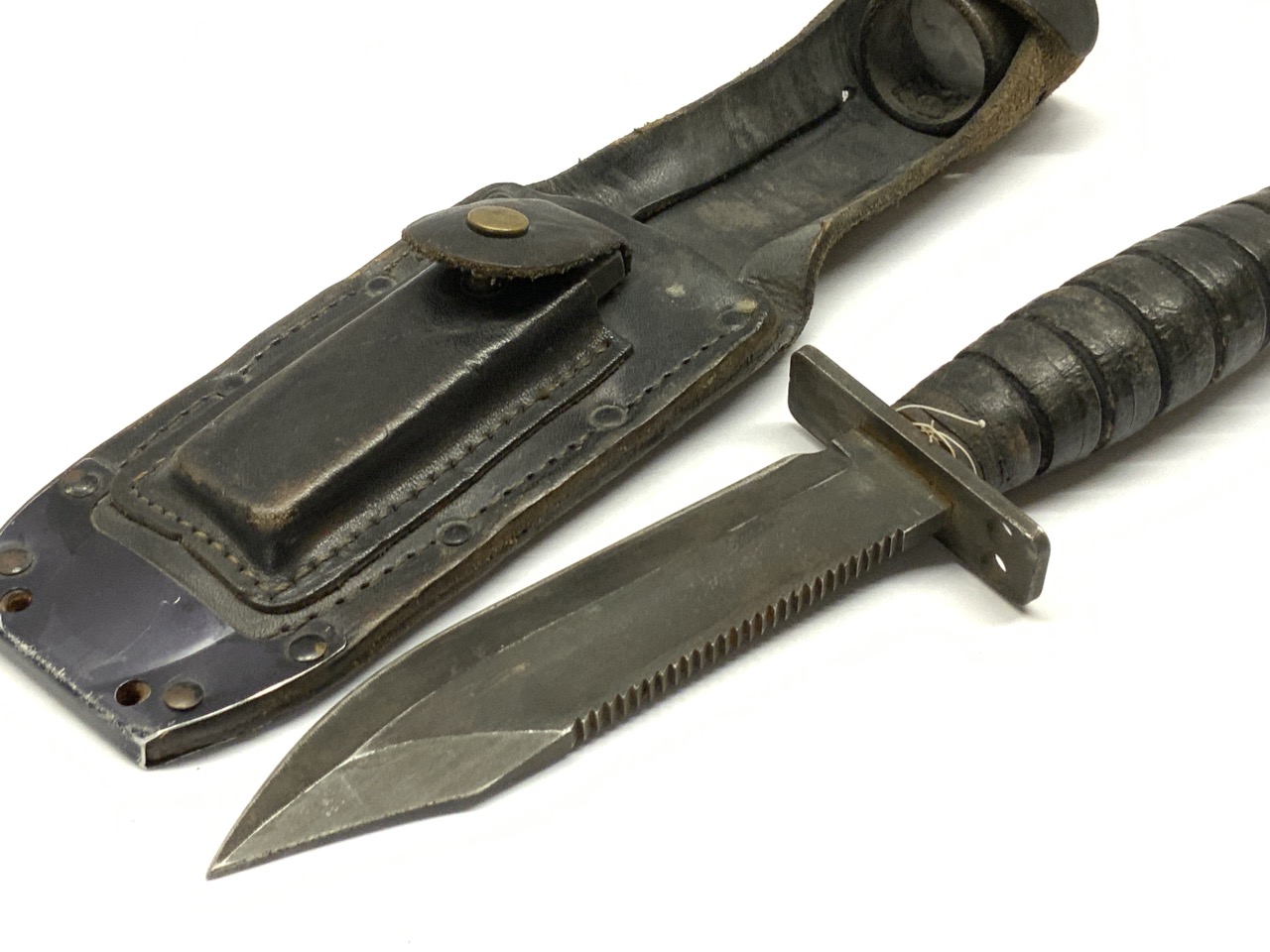 Vietnam Marine combat knife with leather sheath and sharpener.