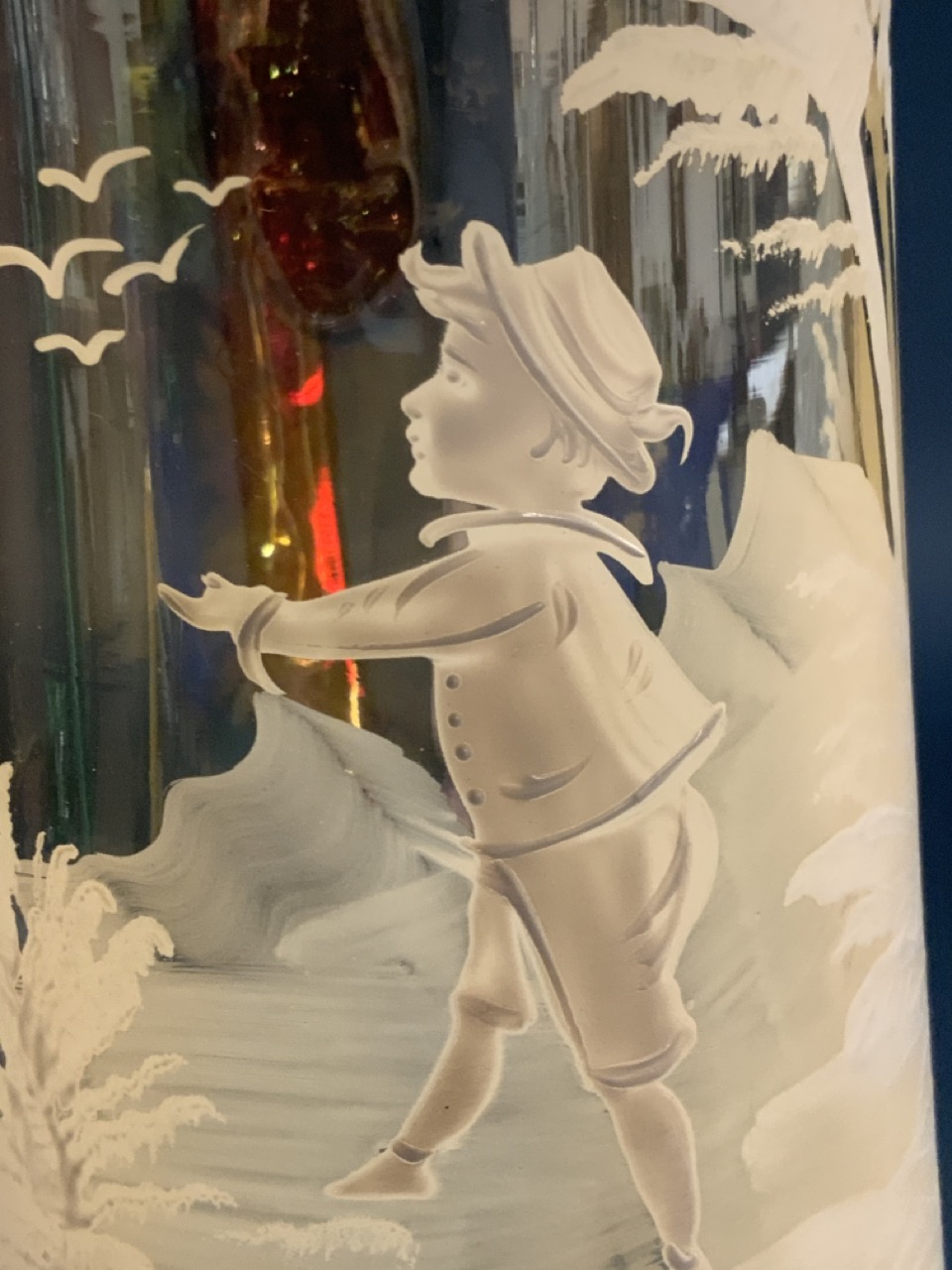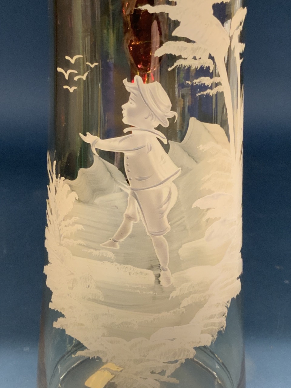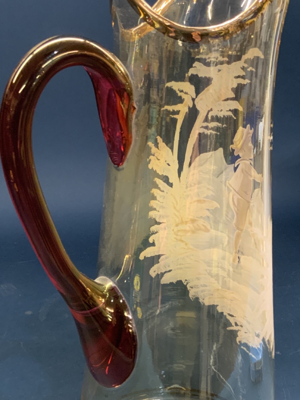 Mary Gregory decorated glass pitcher with boy. Unusual pale light amber glass with cranberry colored glass applied handle.
