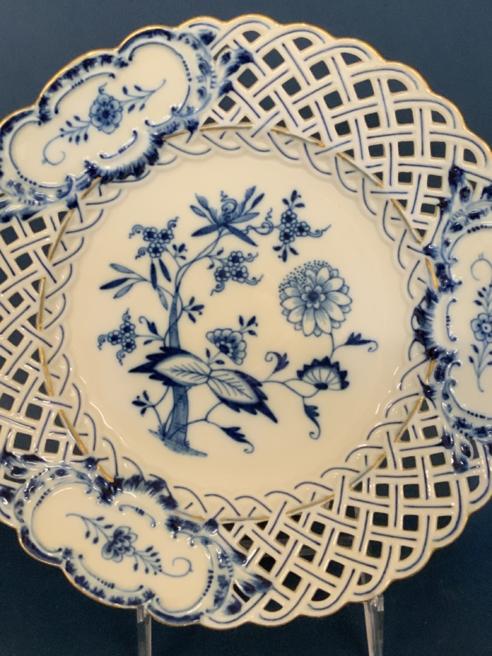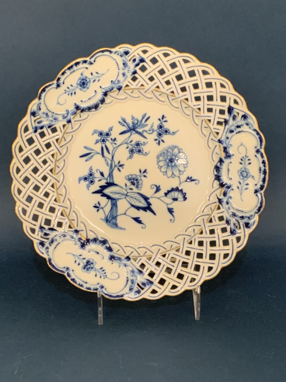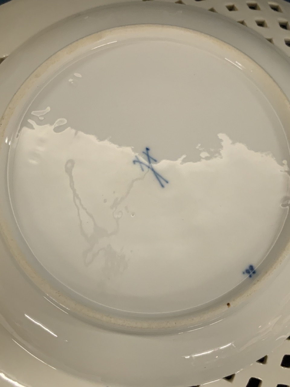 Meisson blue and white reticulated plate. Cross swords in blue at base.