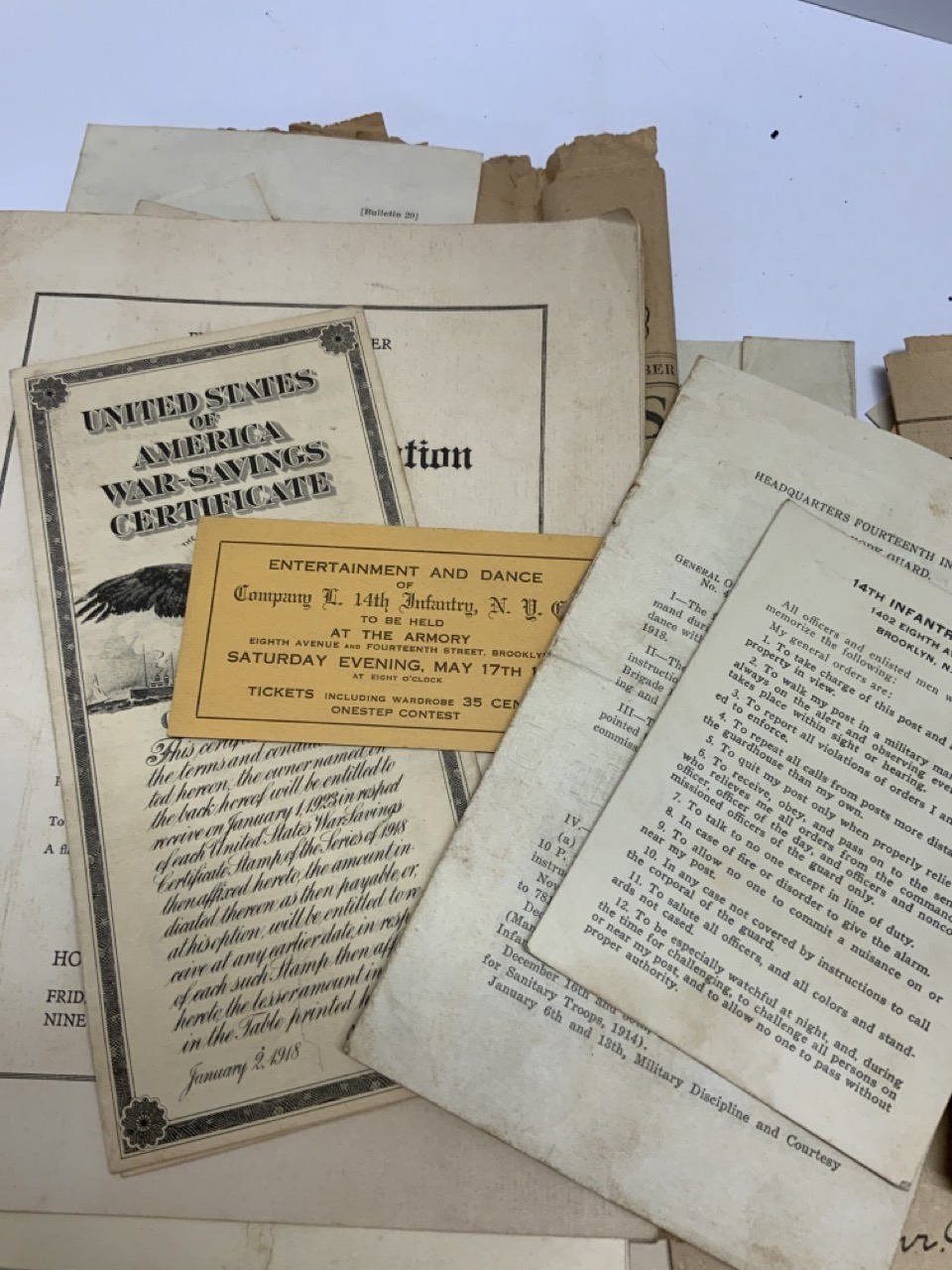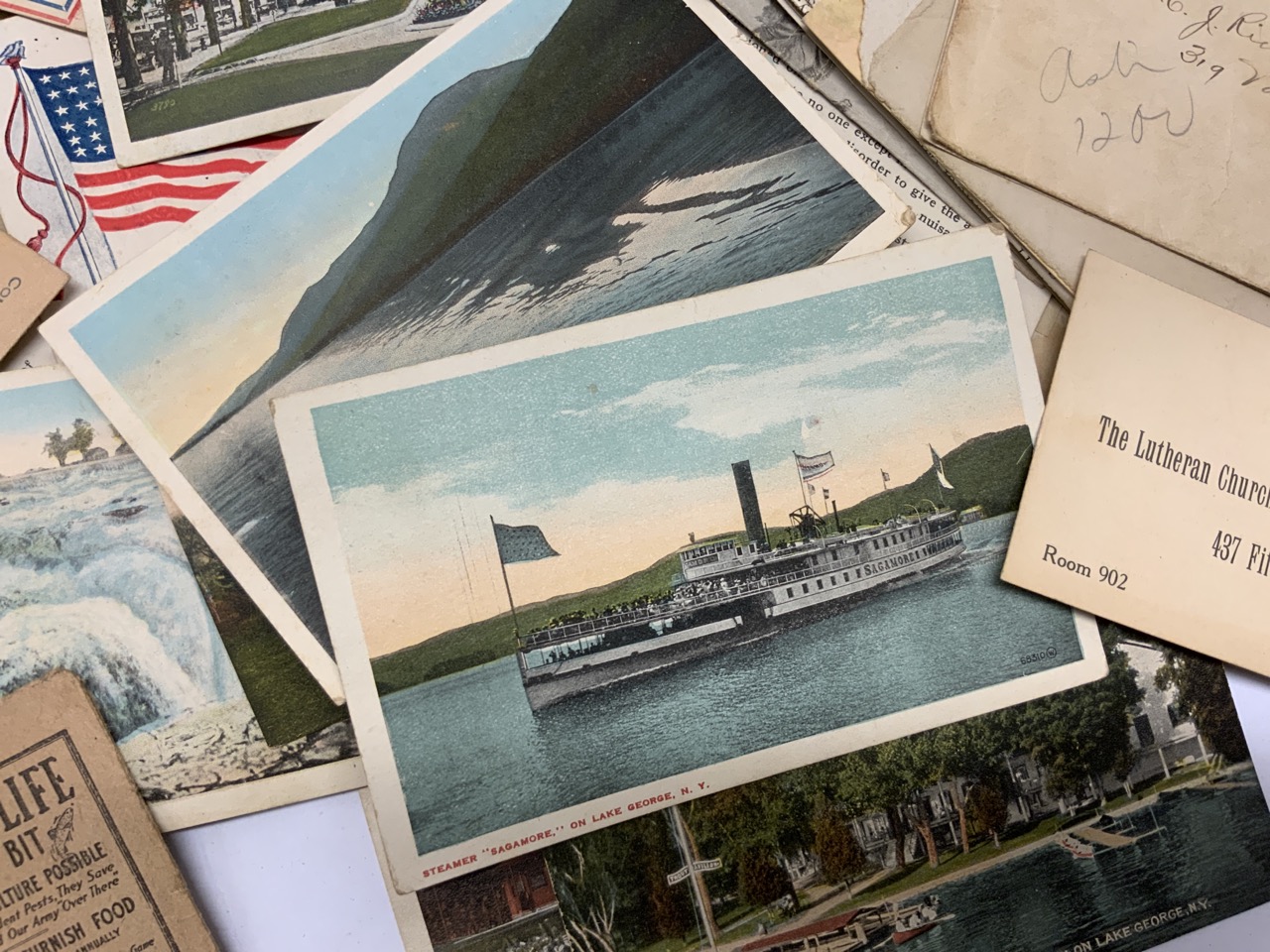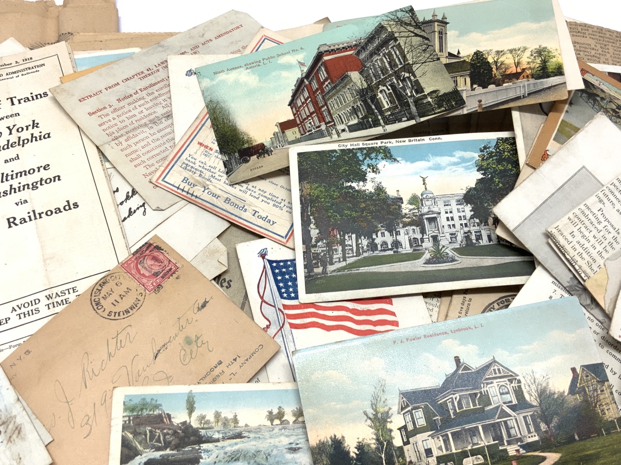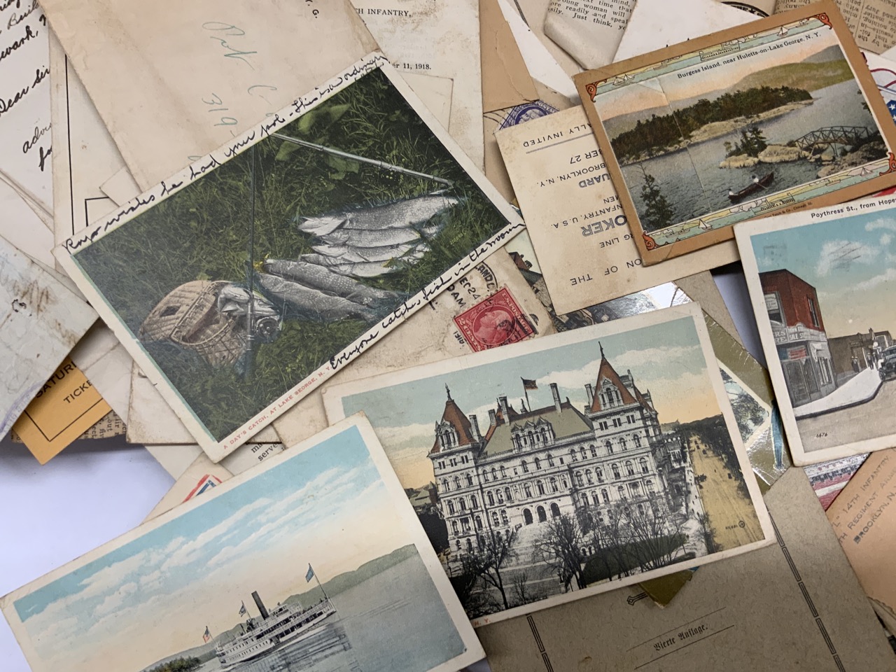 Time capsule found of ephemera most all dating the years 1918-19. Lake George, NY Postcards, Saratoga, Albany, War Bonds Related, WWI orders etc.
