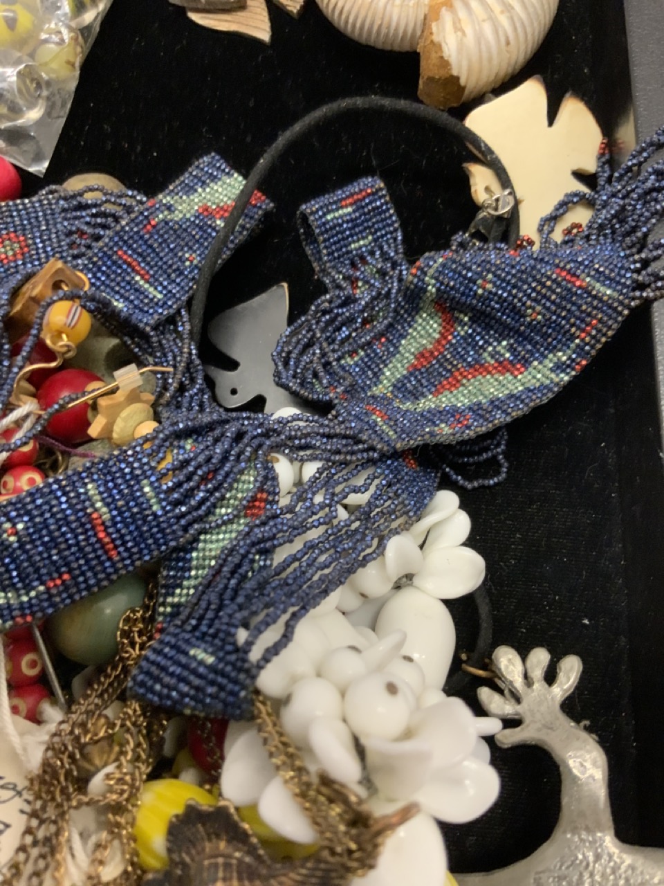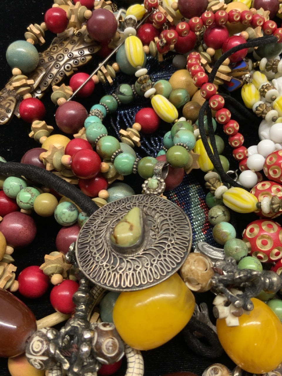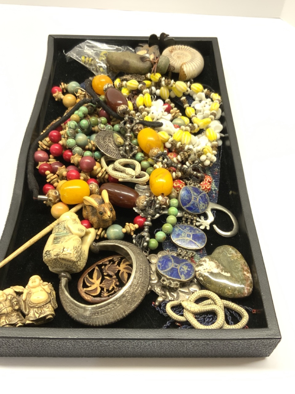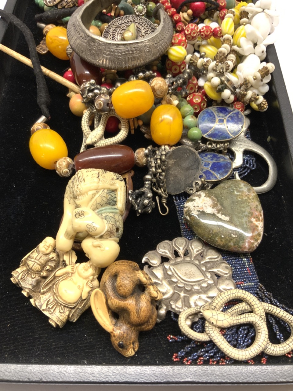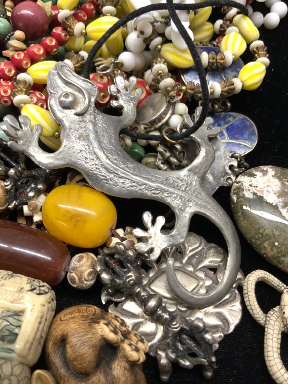 Estate jewelry lot. Resin netsuke, turquoise, glass beads etc.