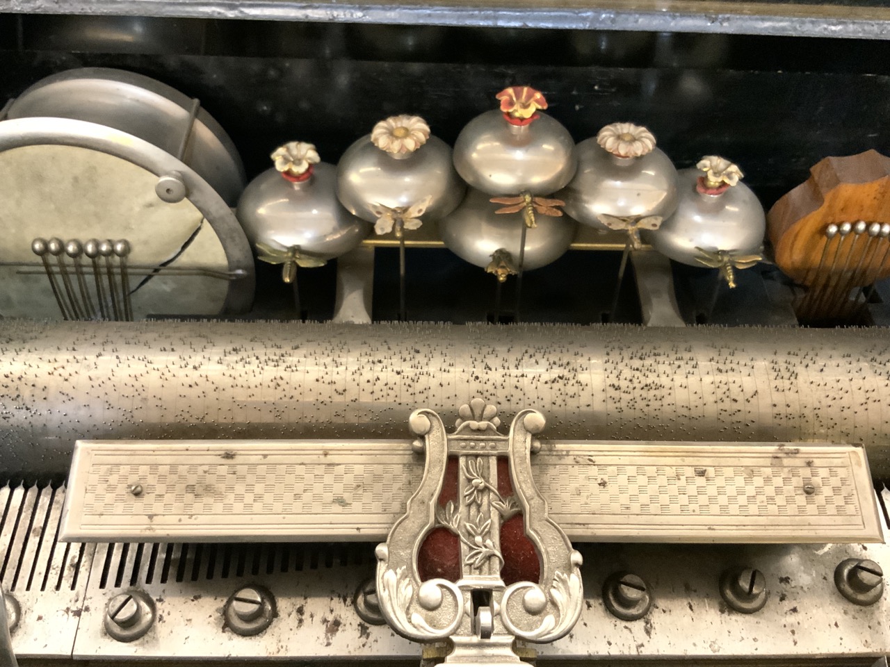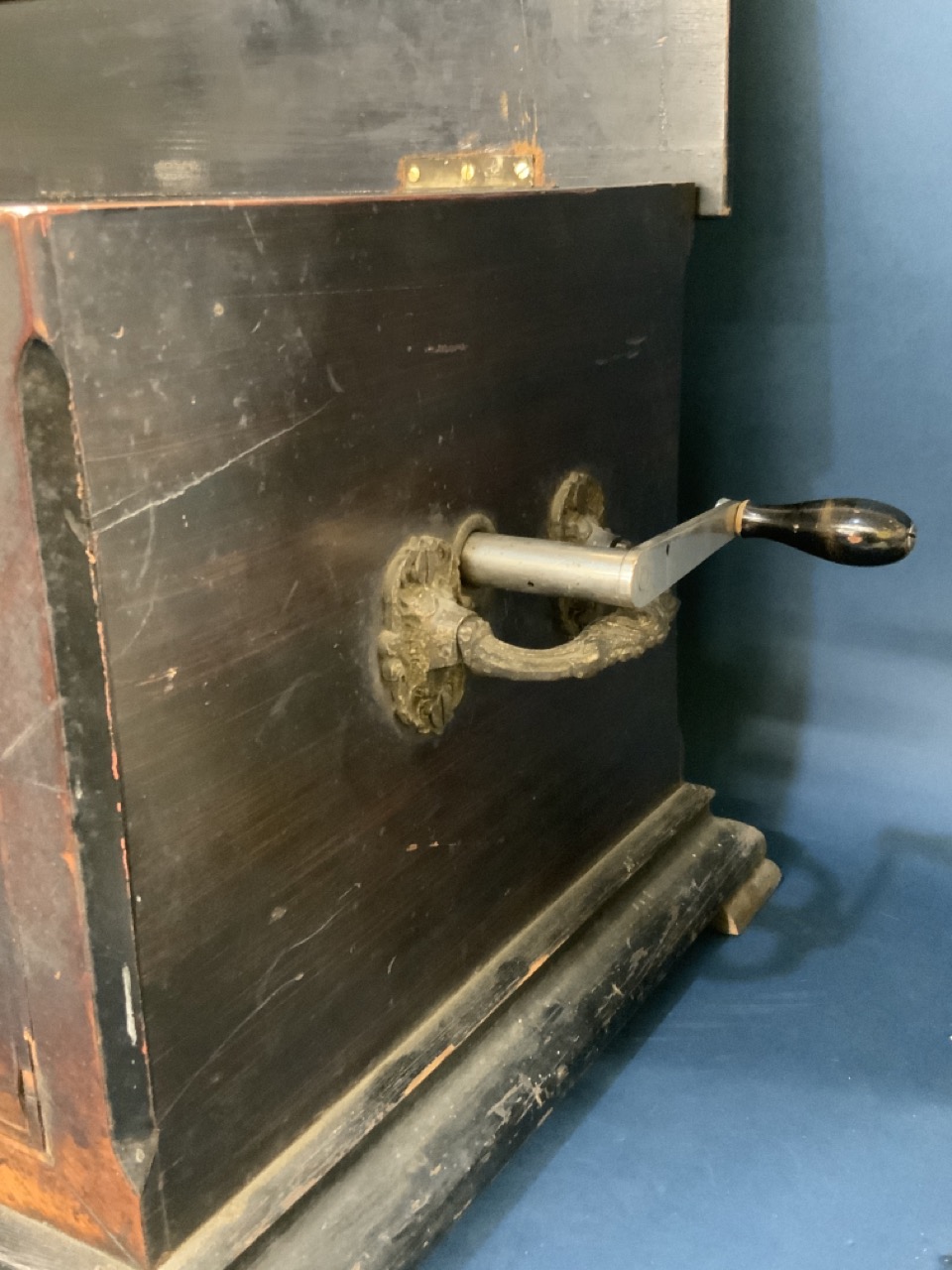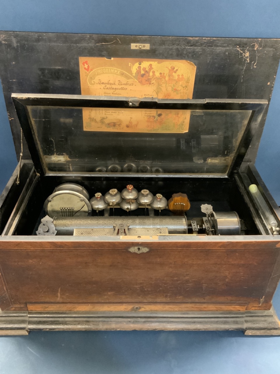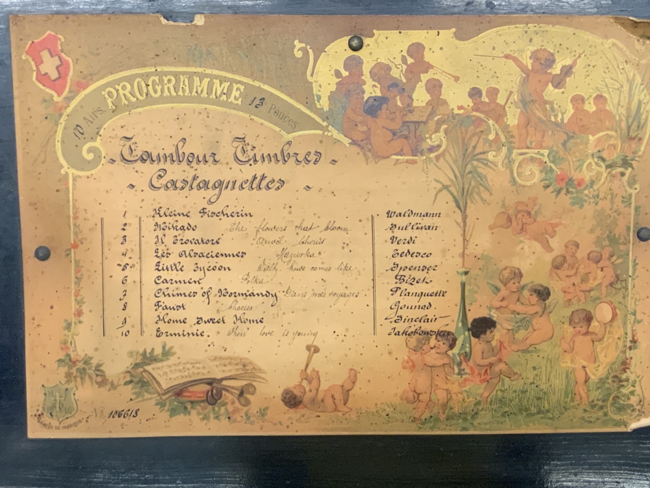 The box operates and plays except when handle is released charge becomes unwound and handle rapidly swings back. Repair needed. Drum covering has tear. Enamel work and mechanisms are very good. The outer casing has some finish wear. Marquetry inlay top sound.