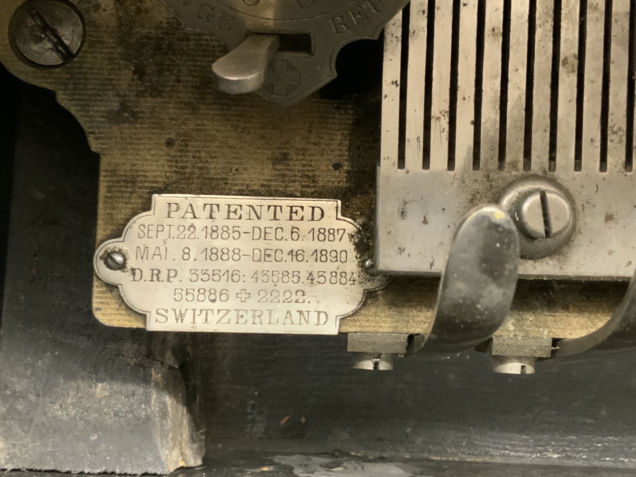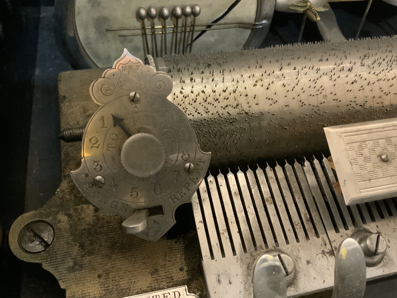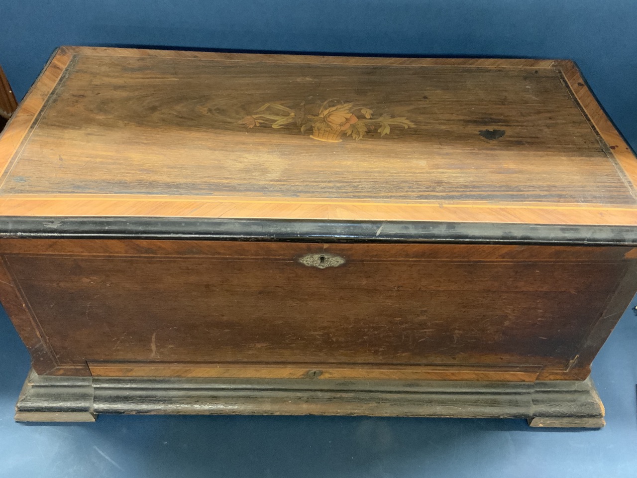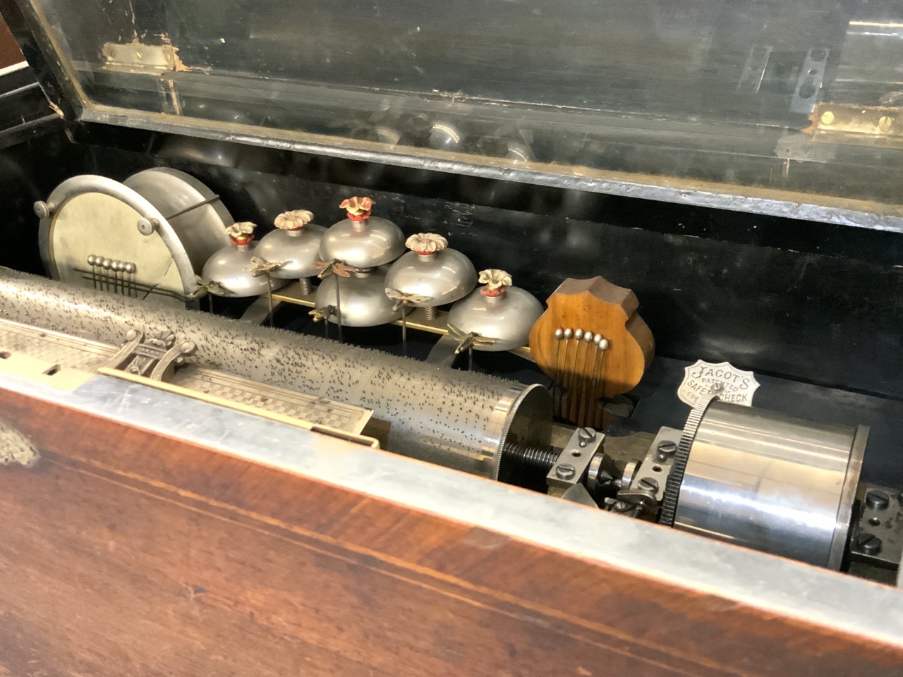 The box operates and plays except when handle is released charge becomes unwound and handle rapidly swings back. Repair needed. Drum covering has tear. Enamel work and mechanisms are very good. The outer casing has some finish wear. Marquetry inlay top sound.