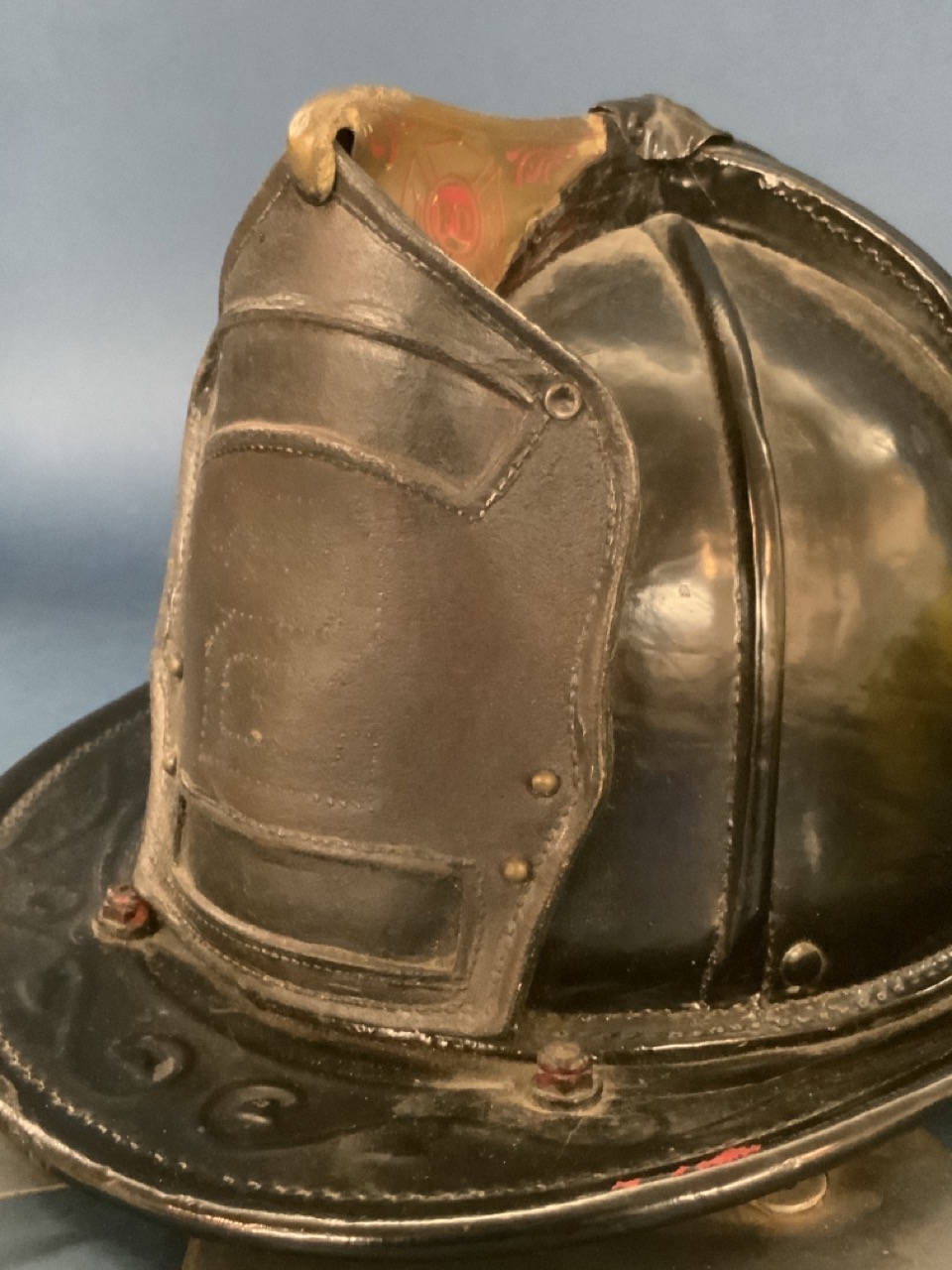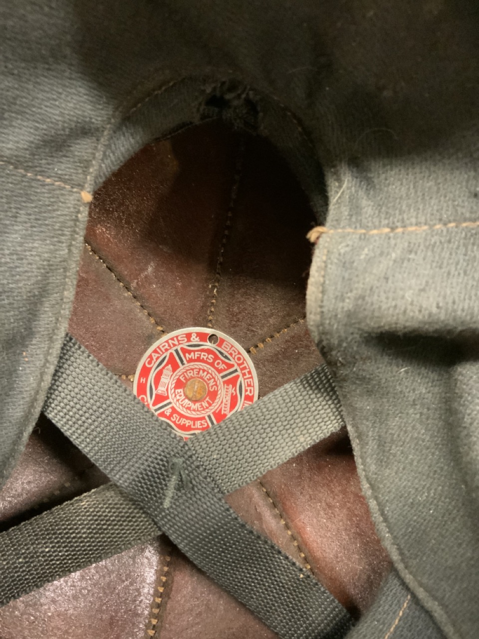 Larchmont Fire Dept. Helmet from 1970's era by Cairns. Front is worn and barely visible.