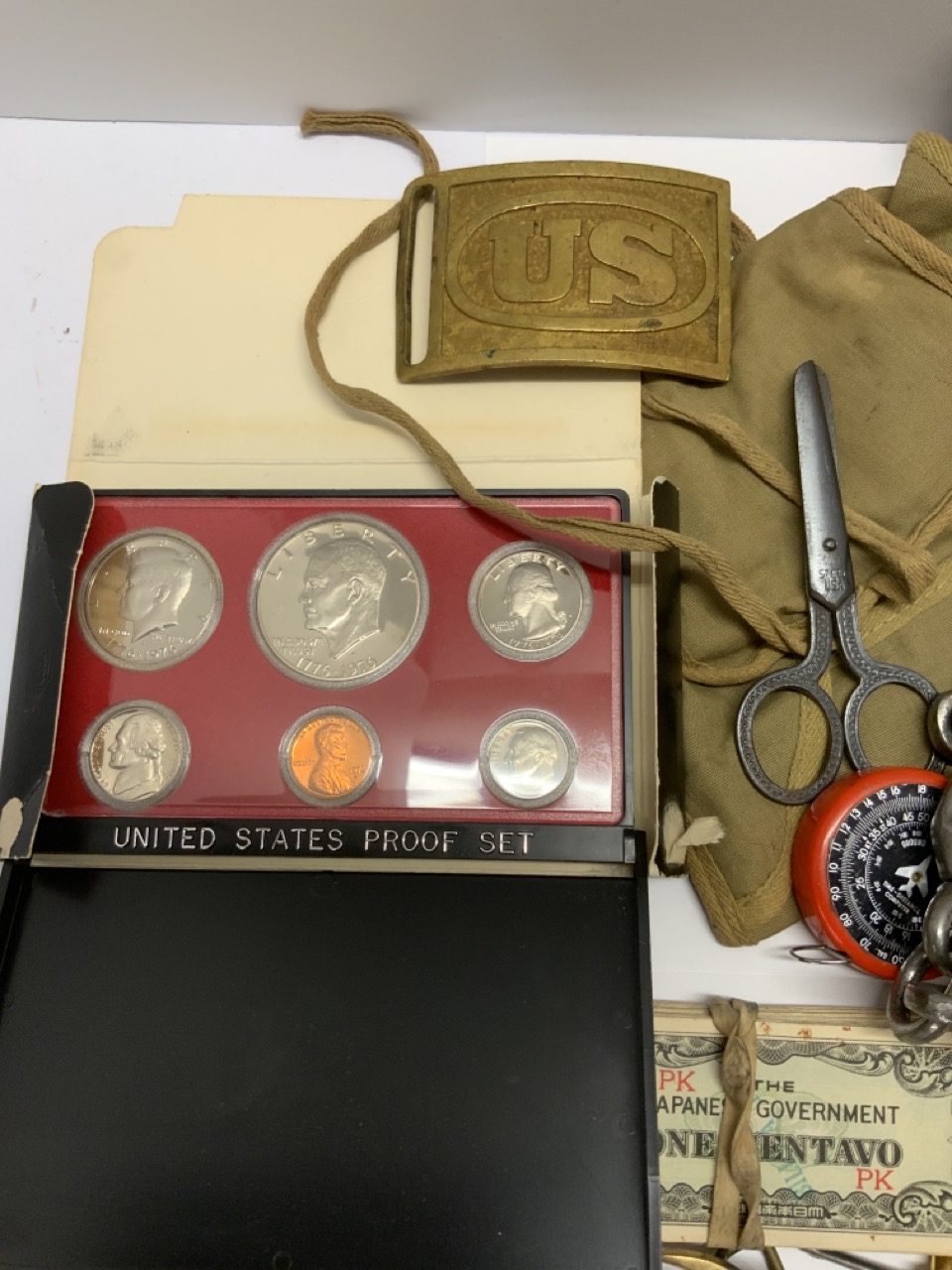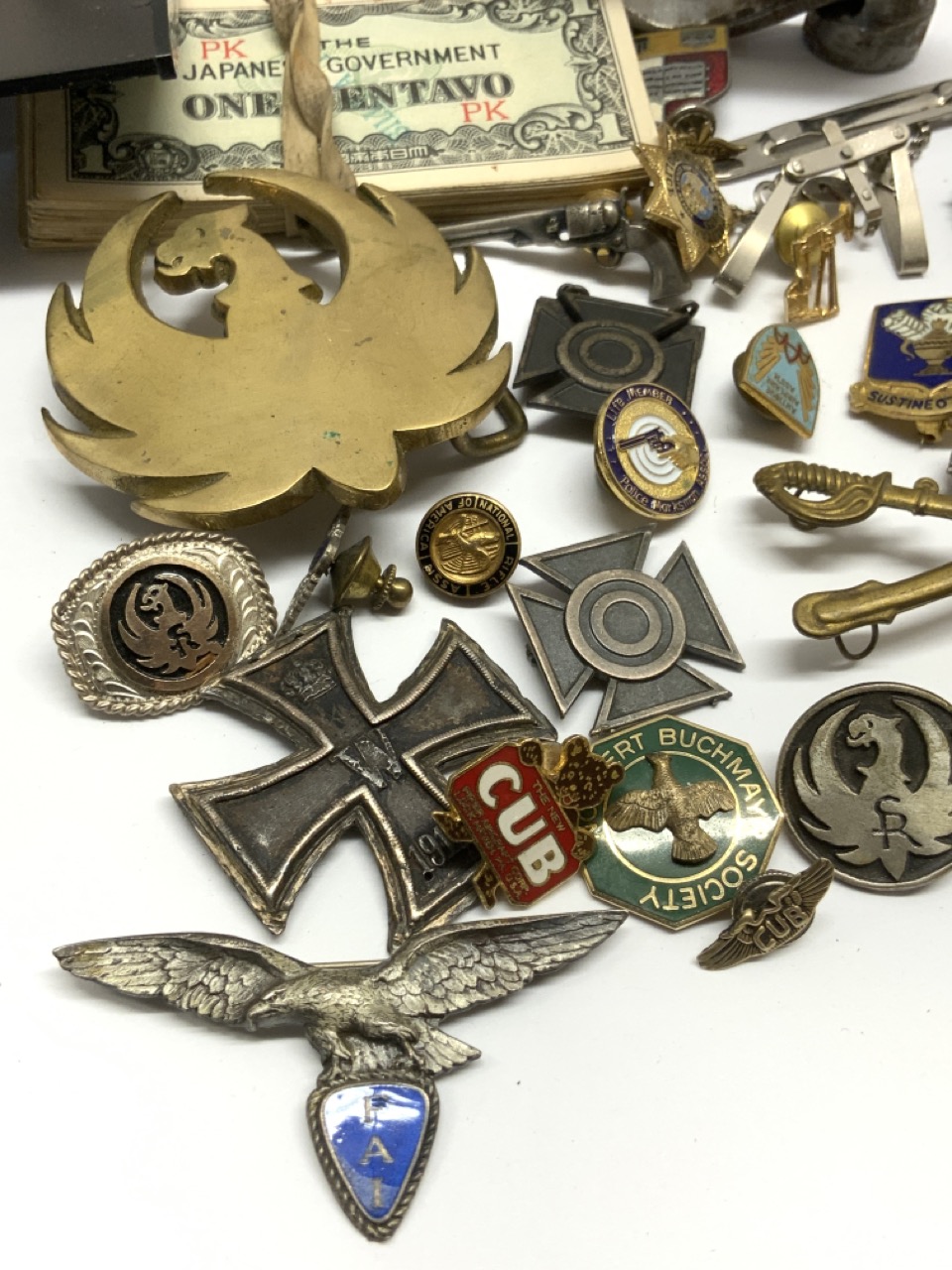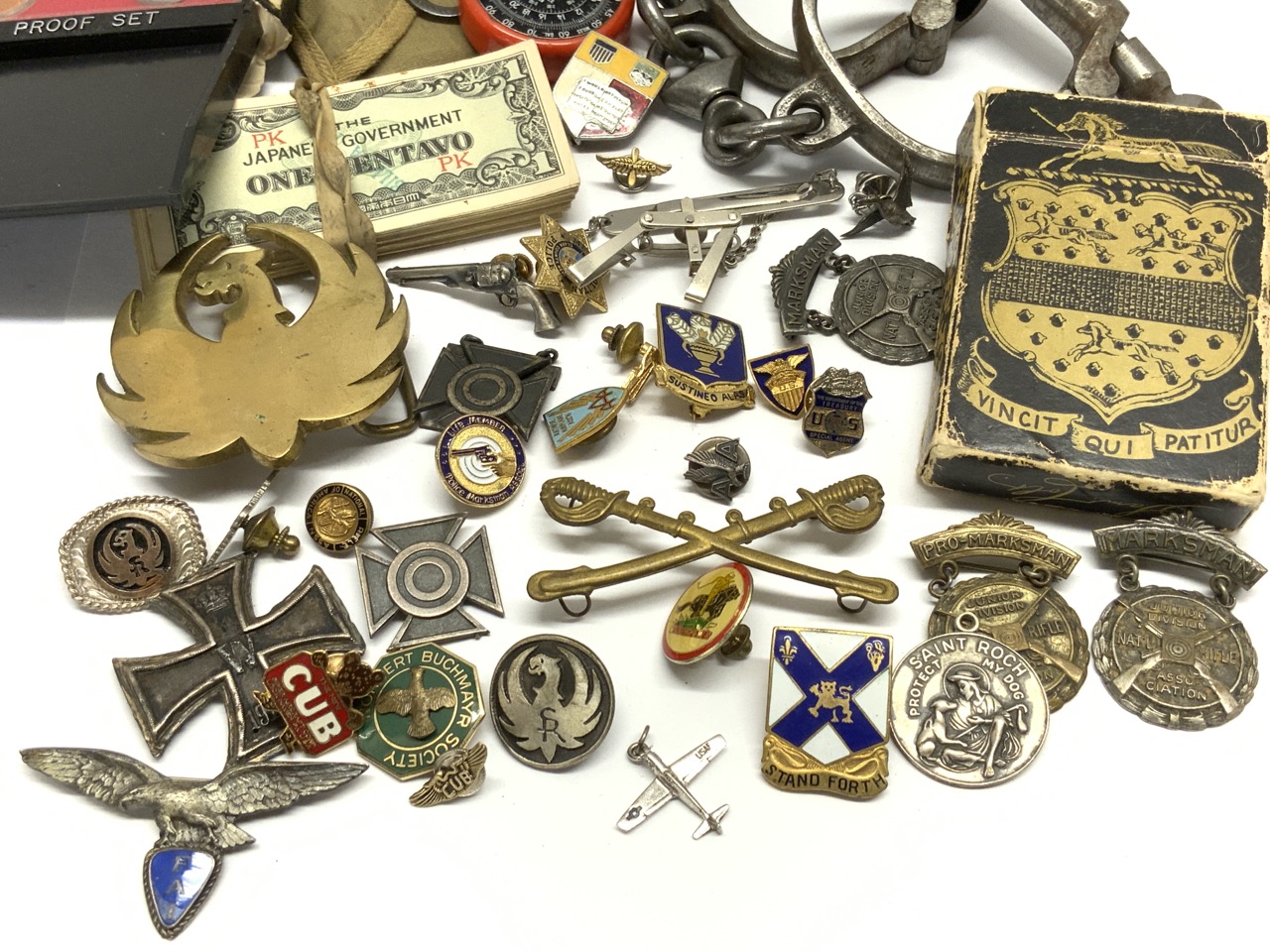 A compiled grouping of WWII era items, Military, Sharpshooter metals, Japanese Centavo bills, belt buckles, iron cross etc. As seen in photograph preview.