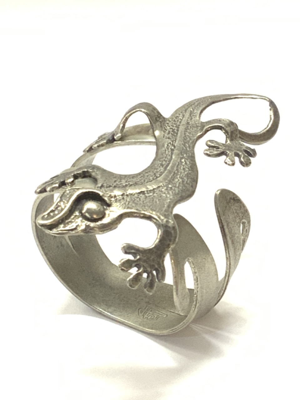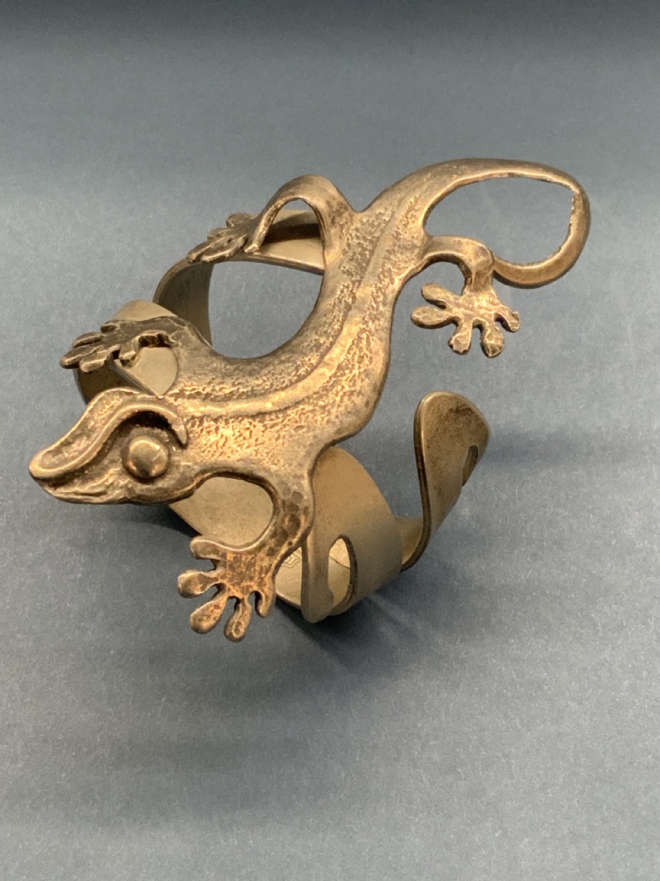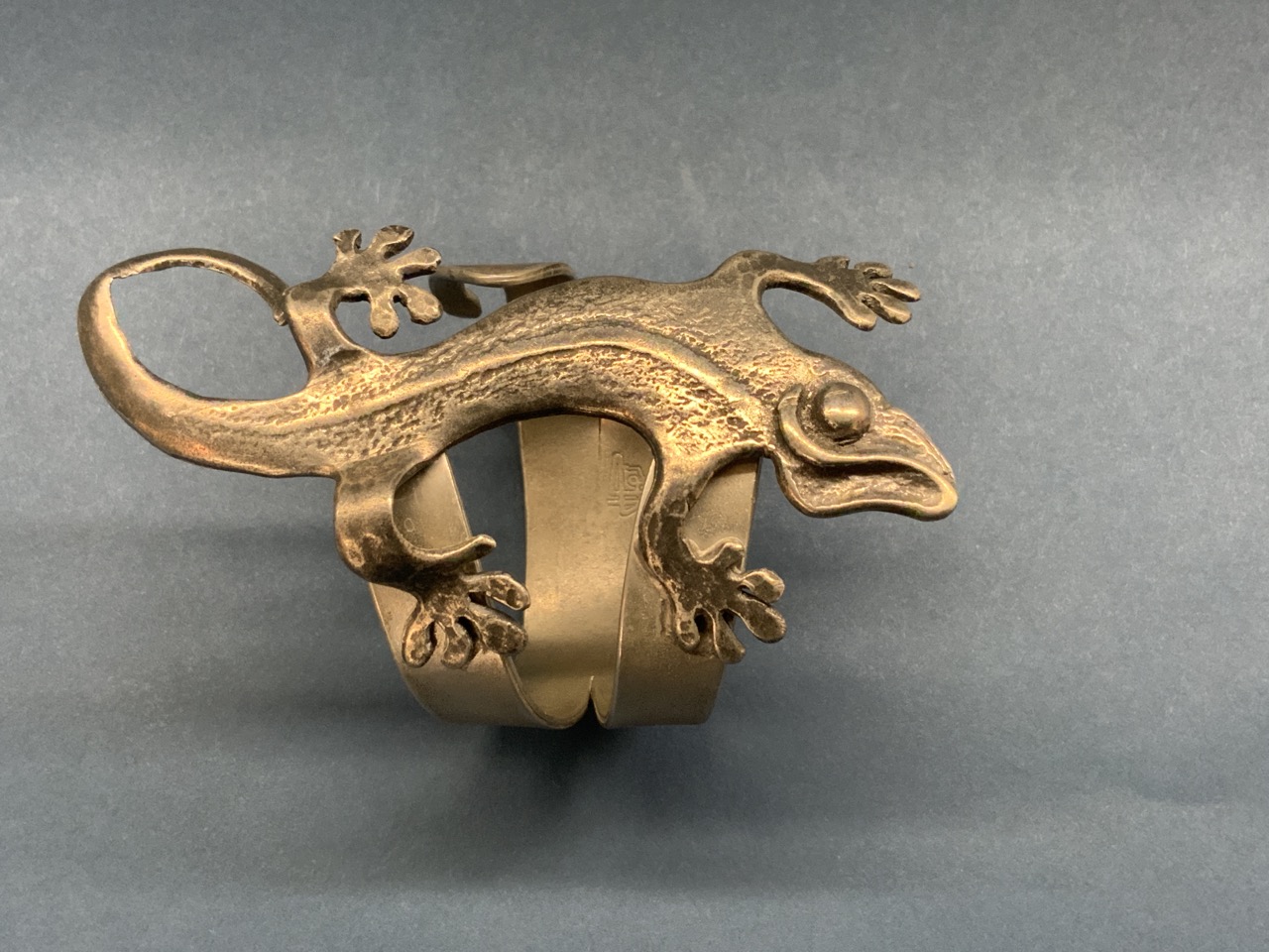 Pewter finish lizard cuff bracelet. Signed illegibly.