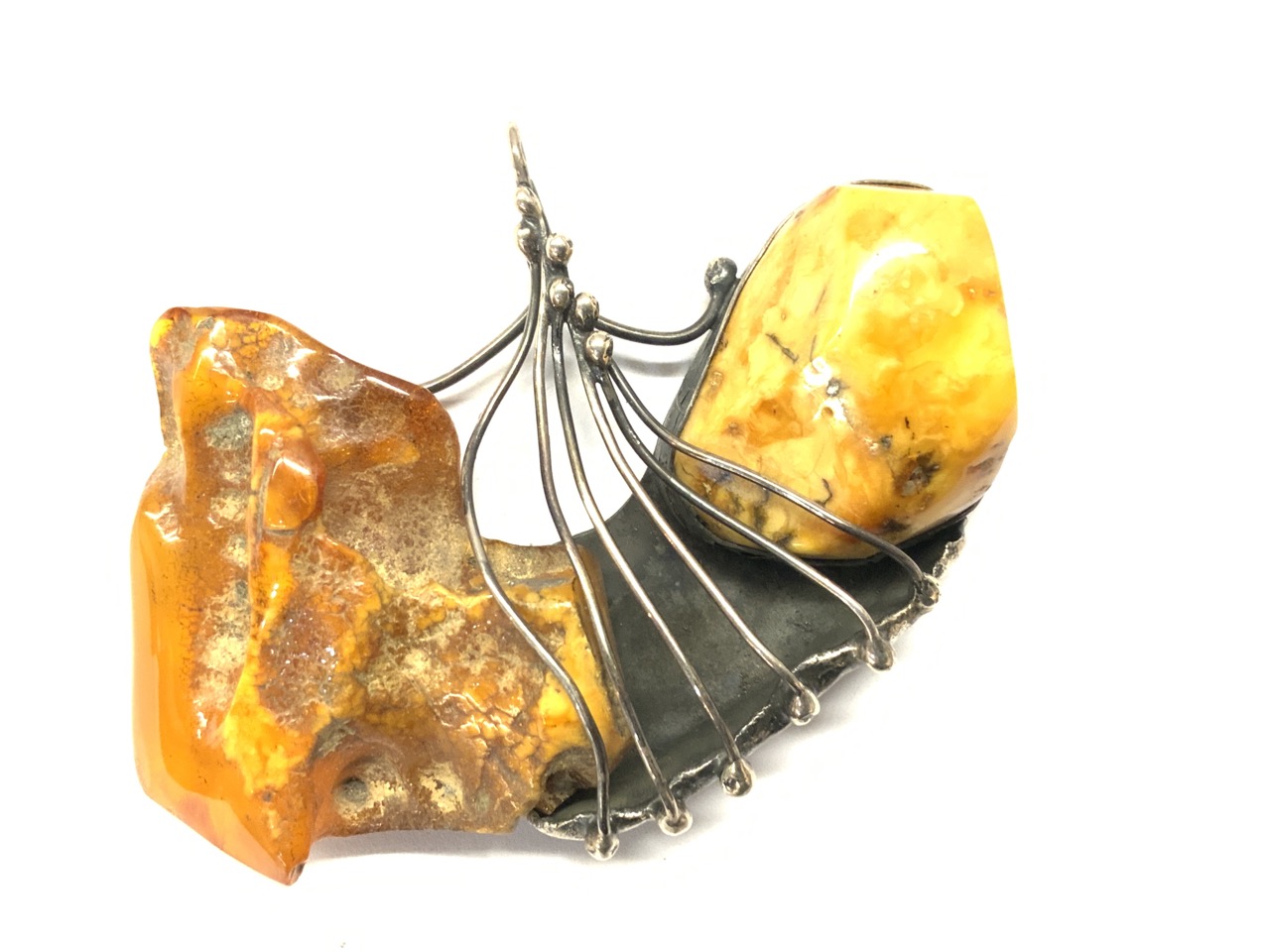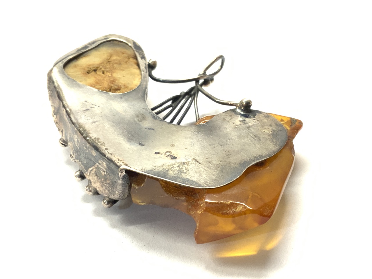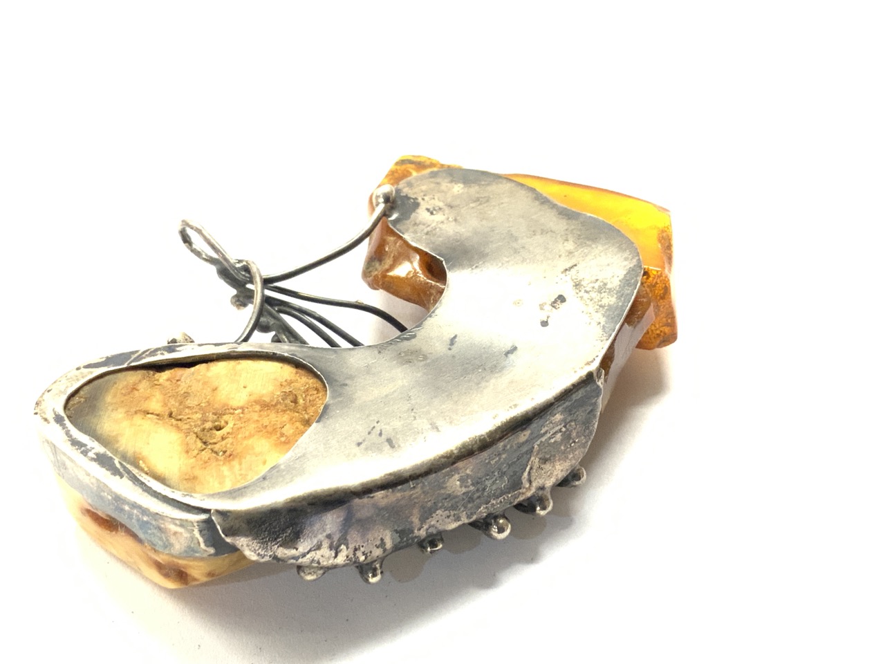 A large Brutalist style chunk of a amber with bold sterling silver frame holding in position. A nice necklace pendant,initialed illegibly and marked 925 on bail. c.1970's or 80's.