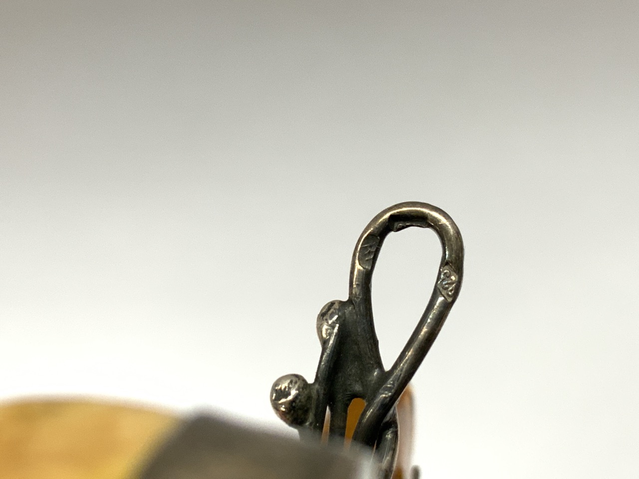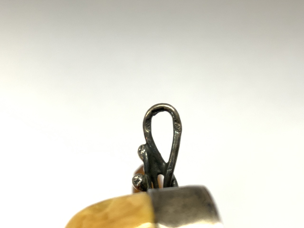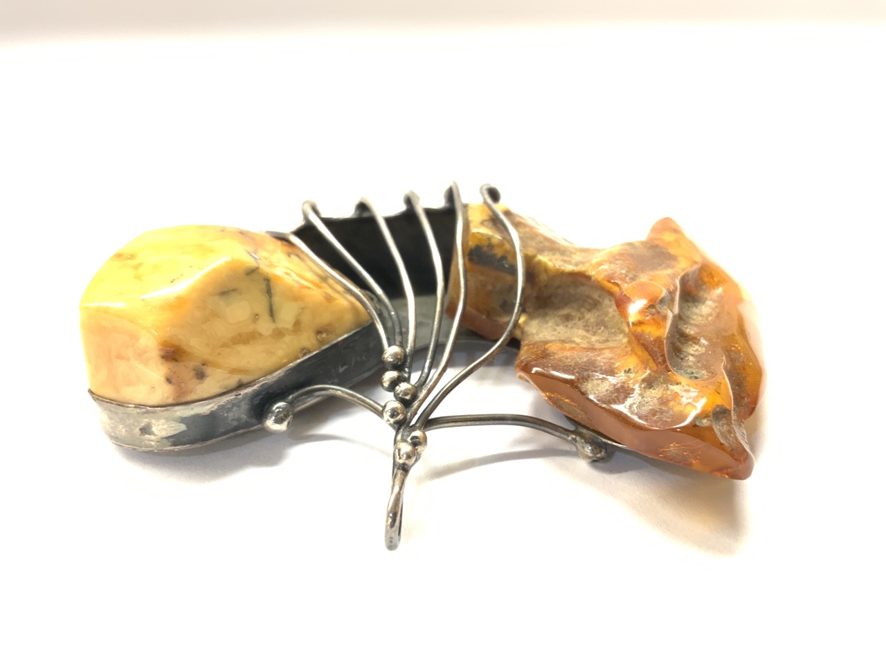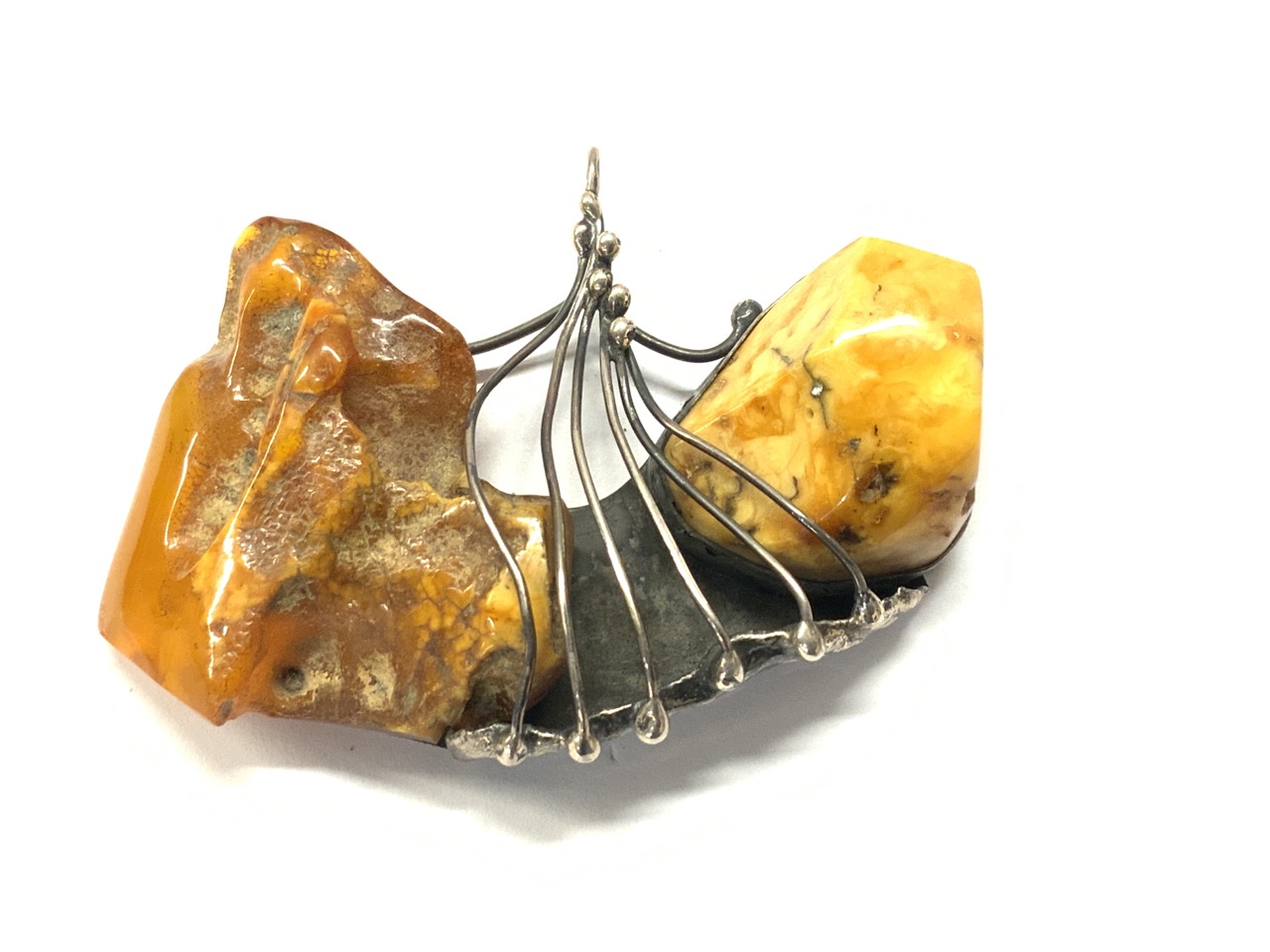A large Brutalist style chunk of a amber with bold sterling silver frame holding in position. A nice necklace pendant,initialed illegibly and marked 925 on bail. c.1970's or 80's.