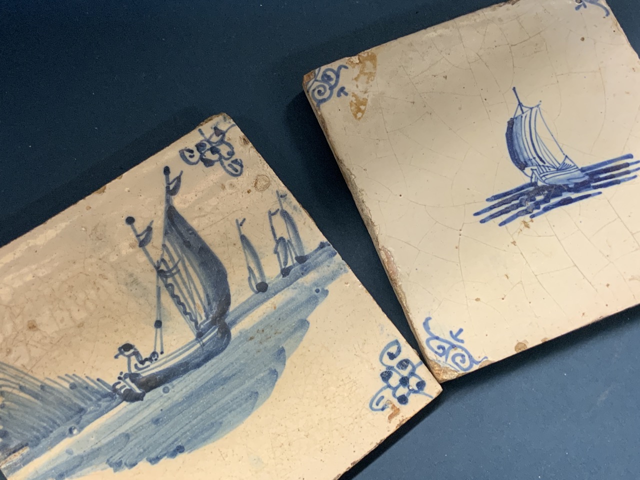Two (2) Antique Delft porcelain blue tiles with ships.