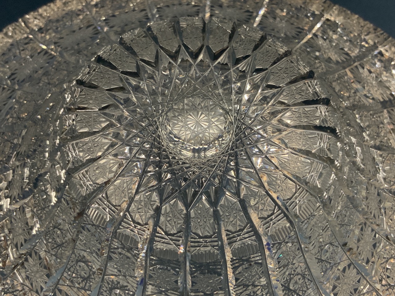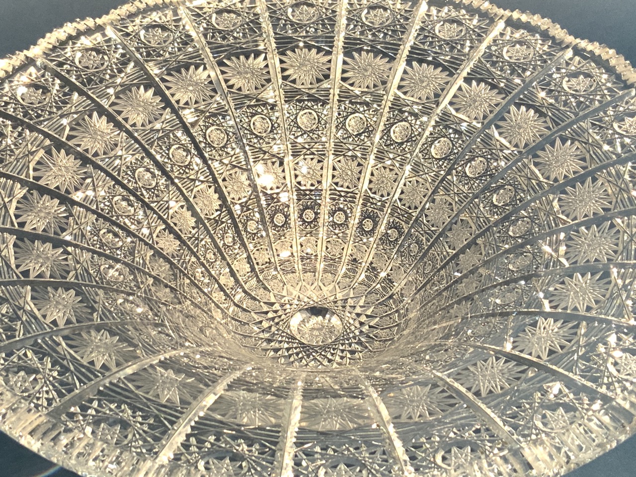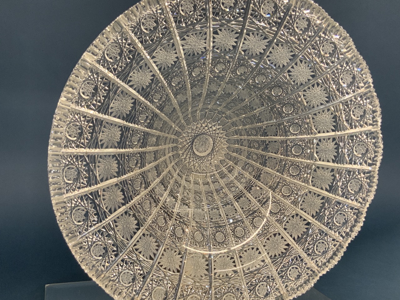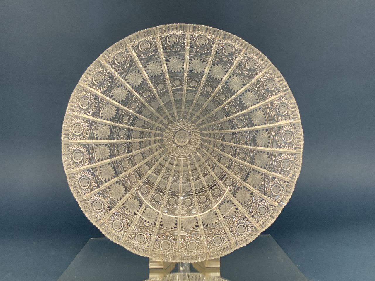A fine Libbey cut glass bowl. Very fine condition. No chips or cracks seen during visible eye inspection. Expect possibly edge nips. Unsigned. The following matching tray Lot #25 is signed at center. Purchased in 1950's at a Florida Auction House.