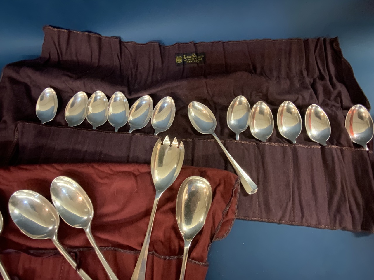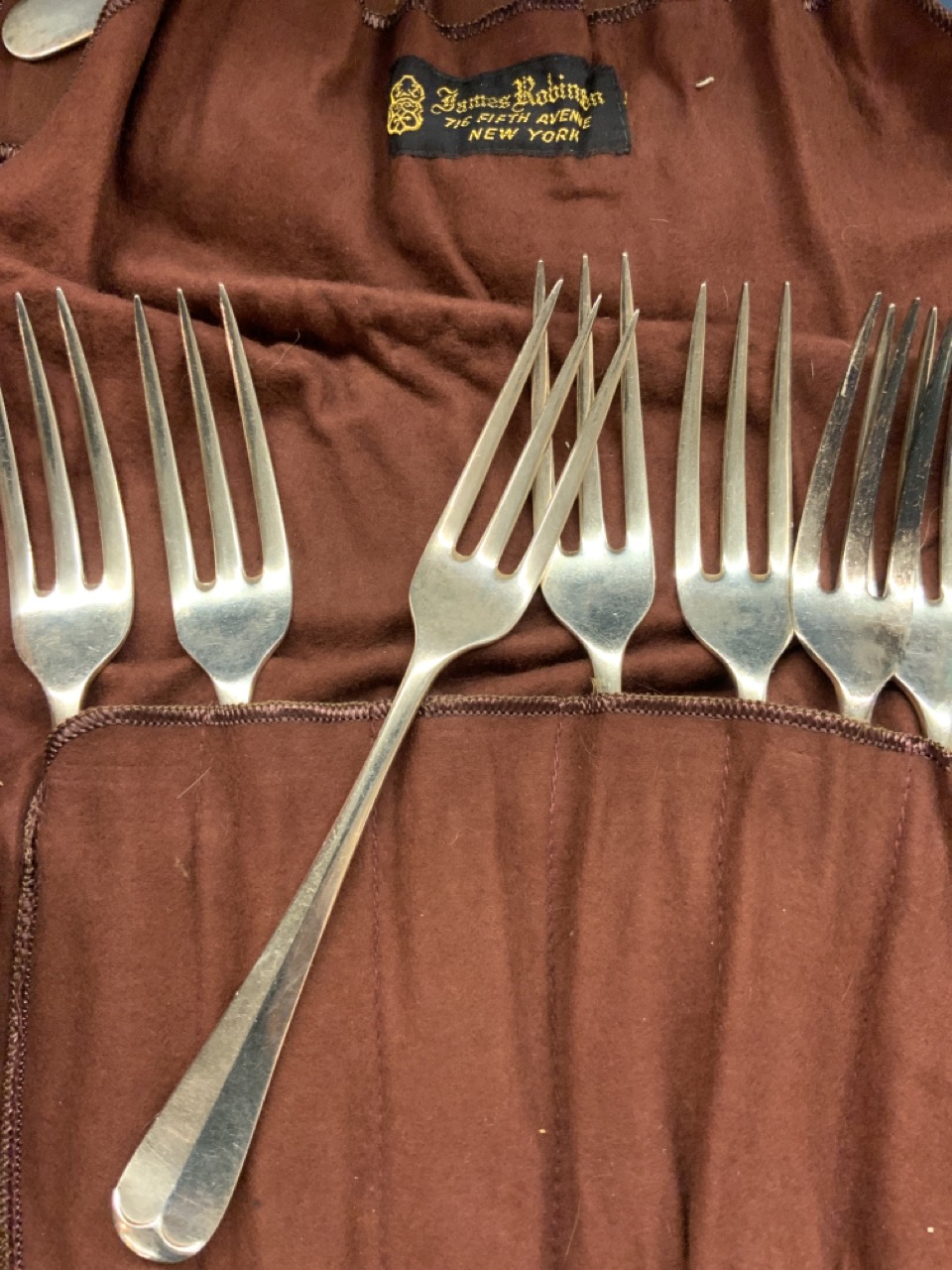 A silver plated grouping of flatware. Six dinner knives marked James Robinson (New York) and remaining by Atkins Bros. Robinson silver storage bags all included. As seen in photograph preview. Early 20th century.
