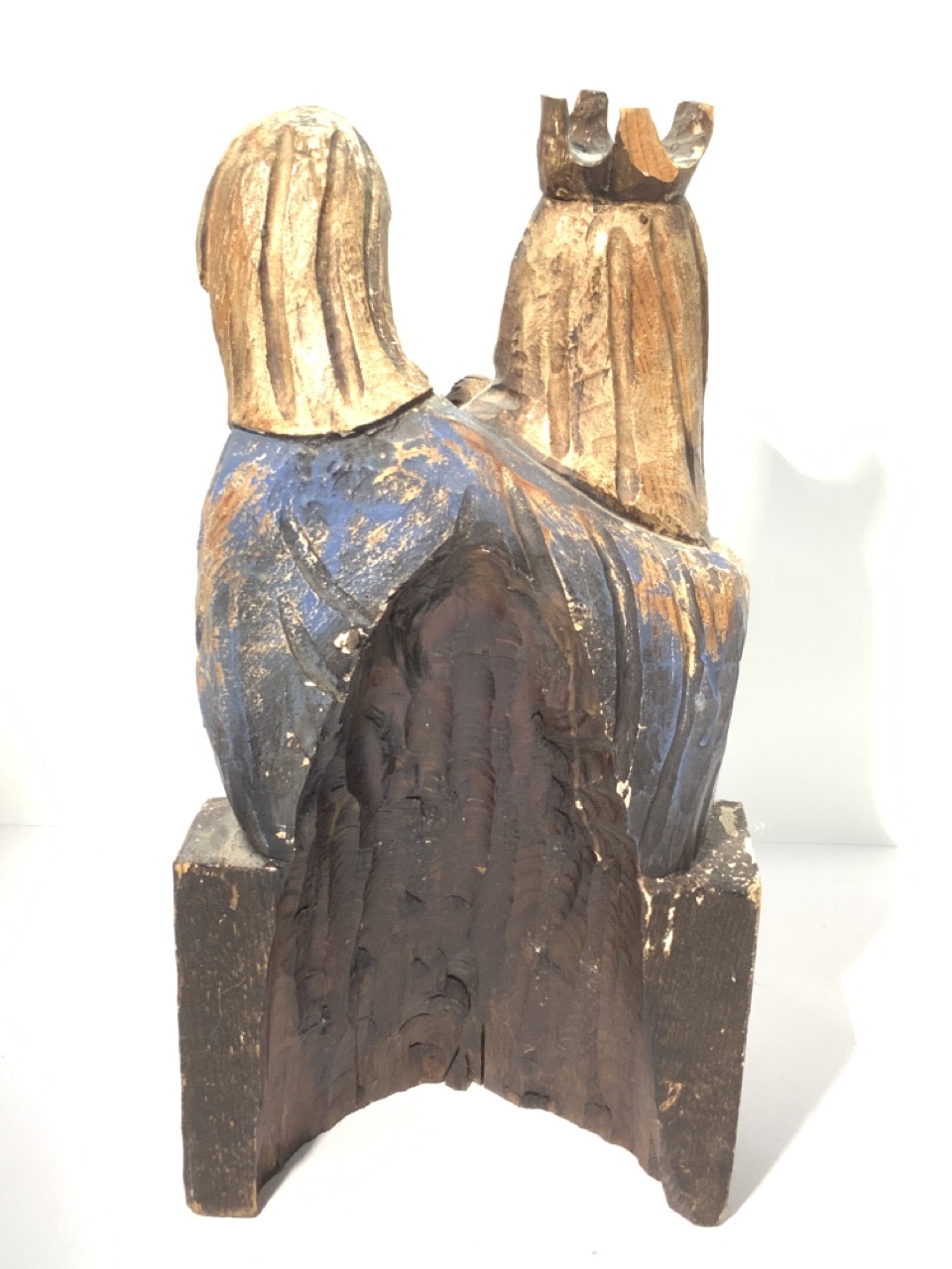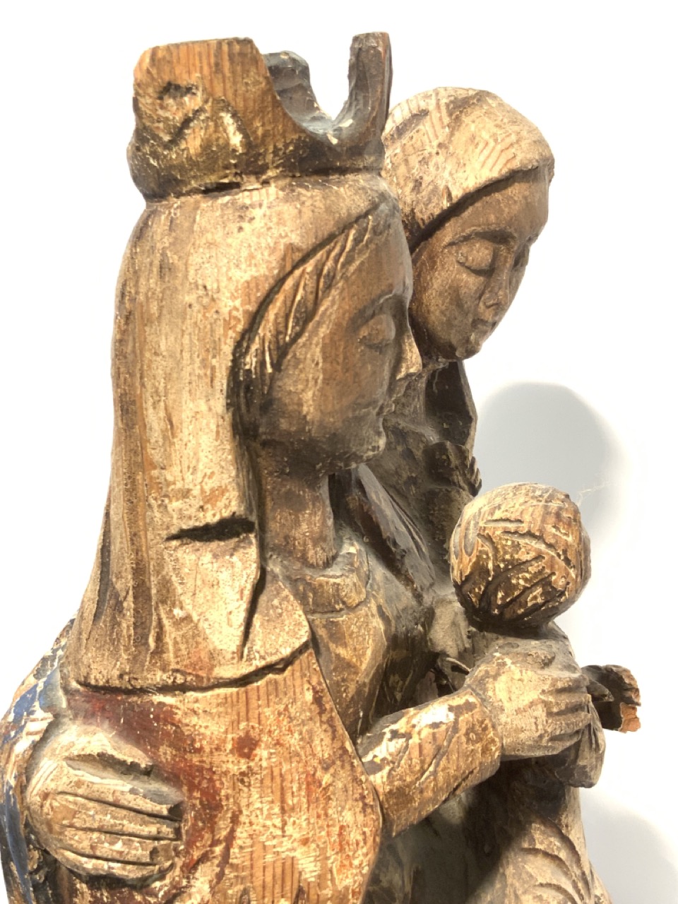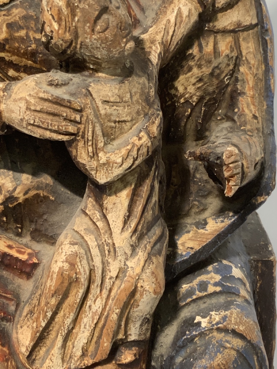 19th century polychrome painted carved wood statue of Madonna and child.