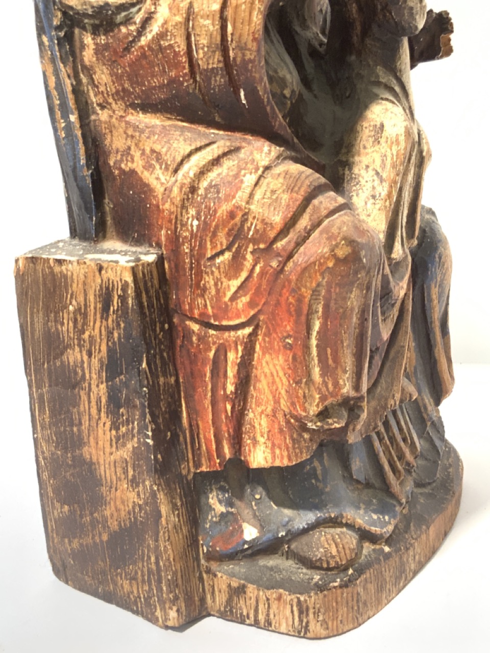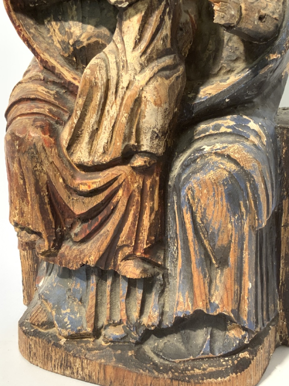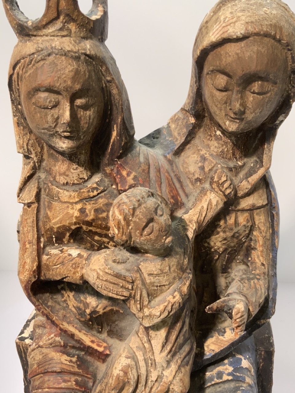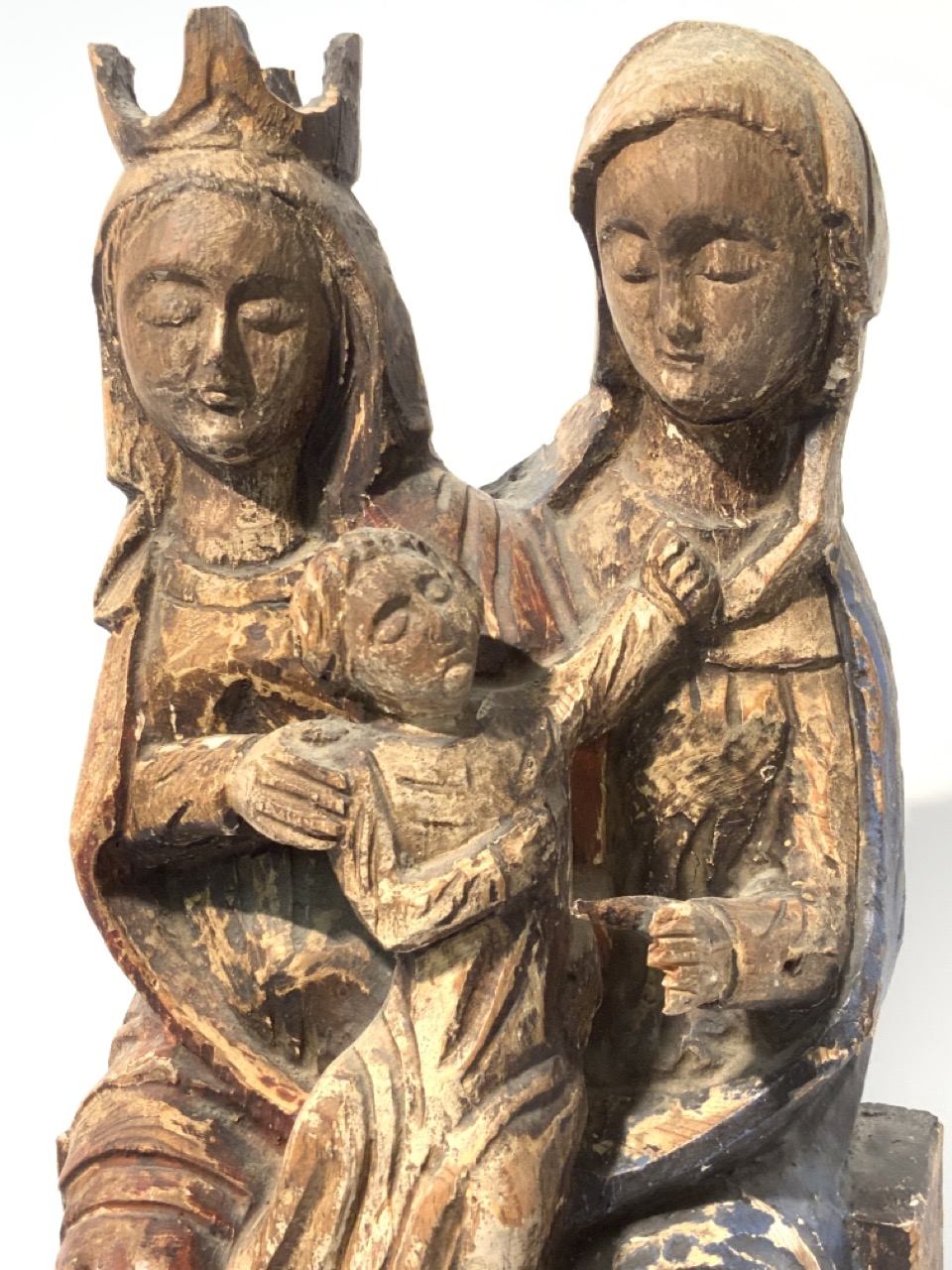 19th century polychrome painted carved wood statue of Madonna and child.