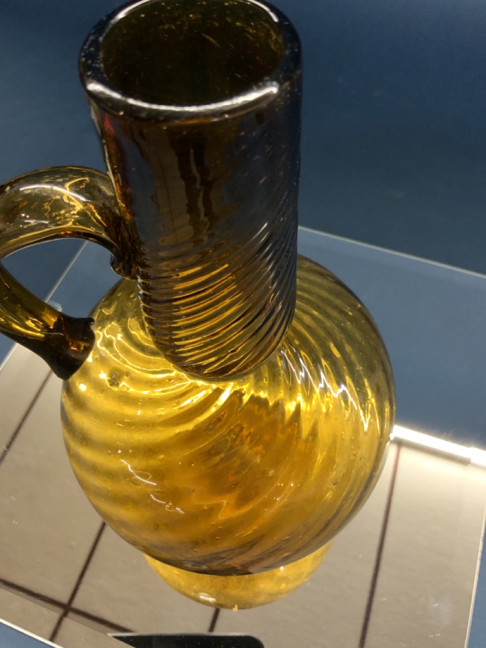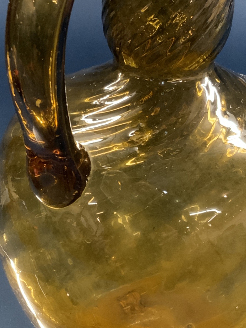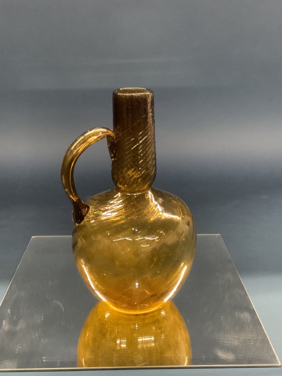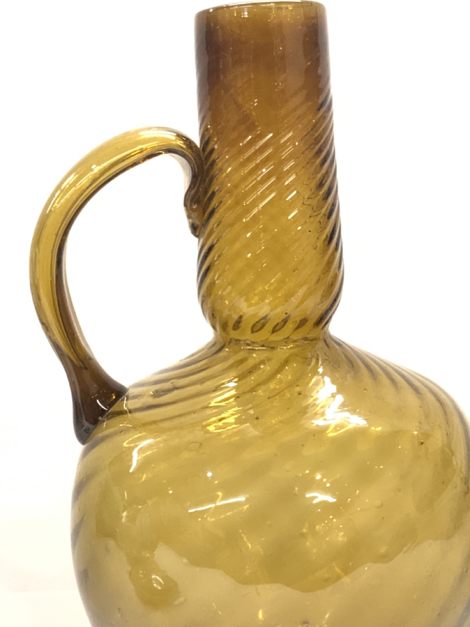 Amber glass twist jug with applied handle. Broken pontil mark.