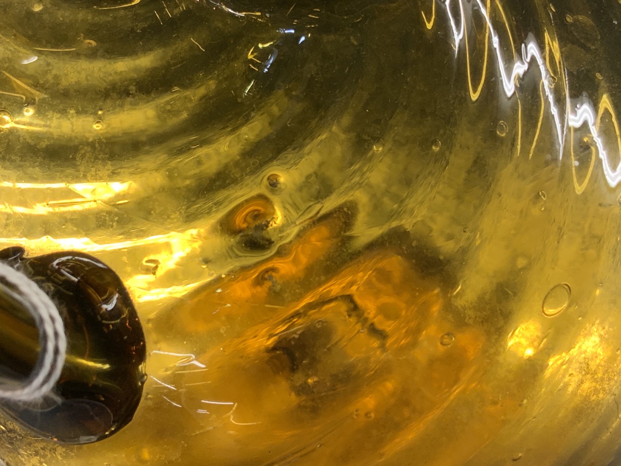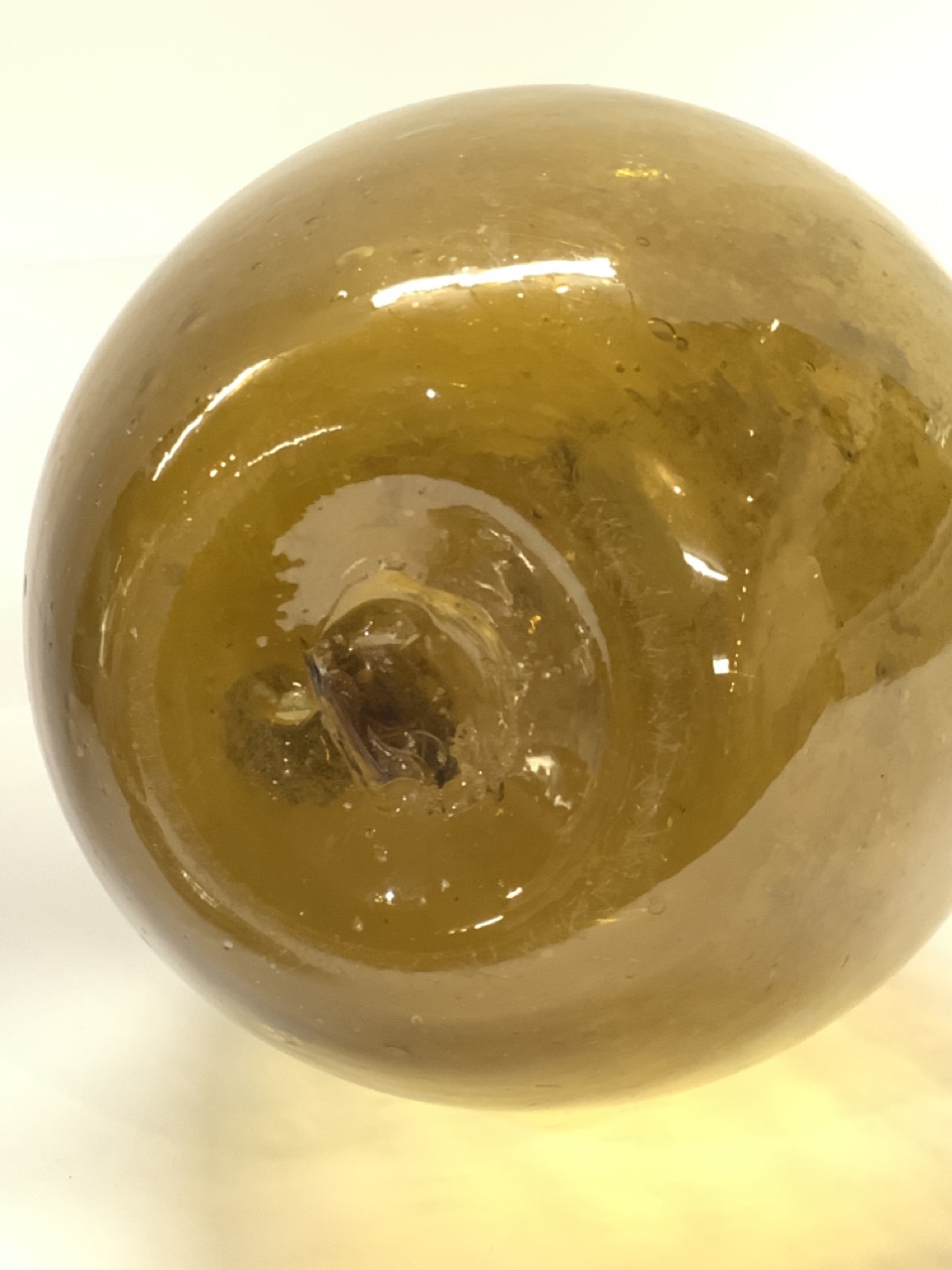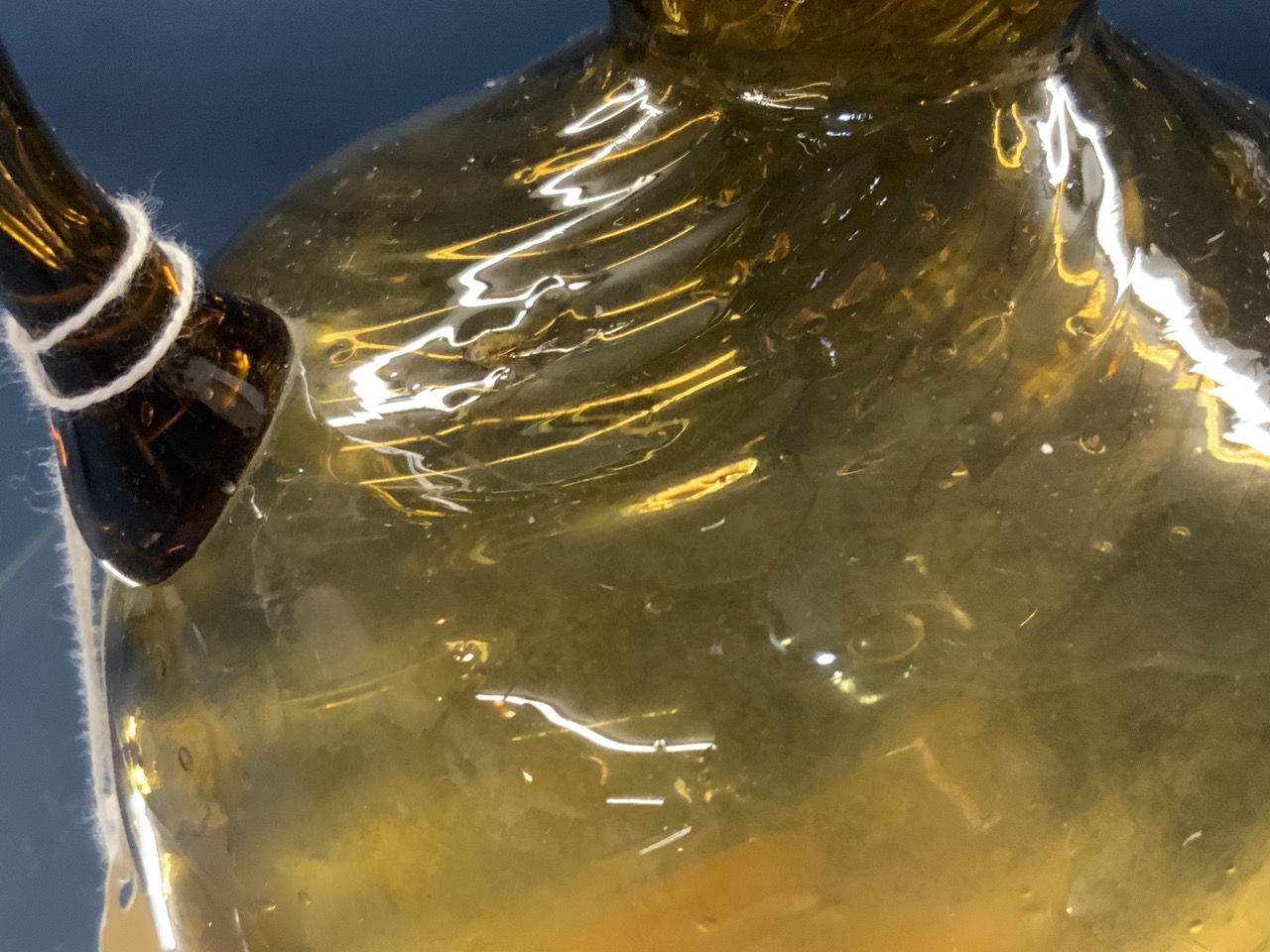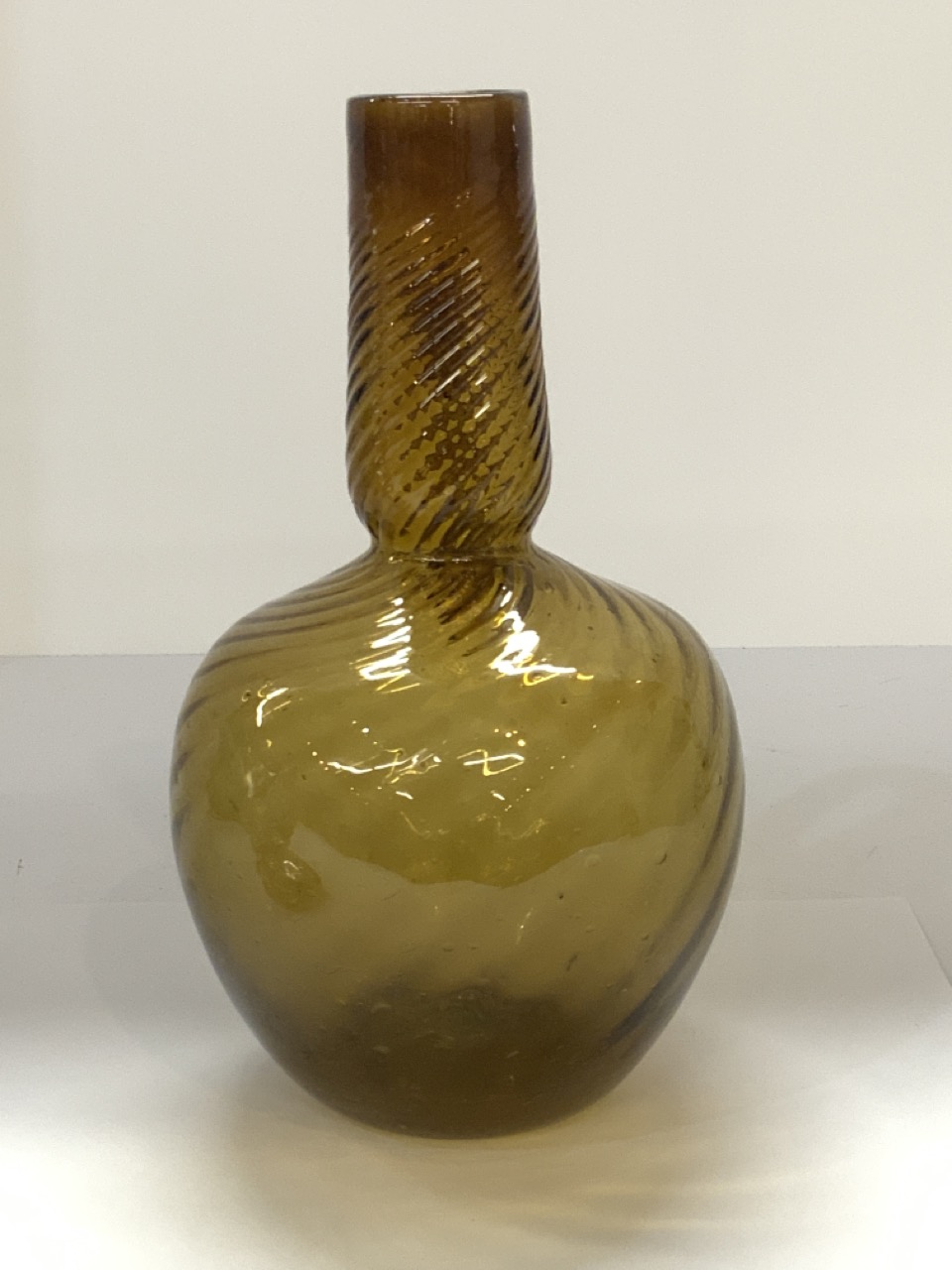 Amber glass twist jug with applied handle. Broken pontil mark.