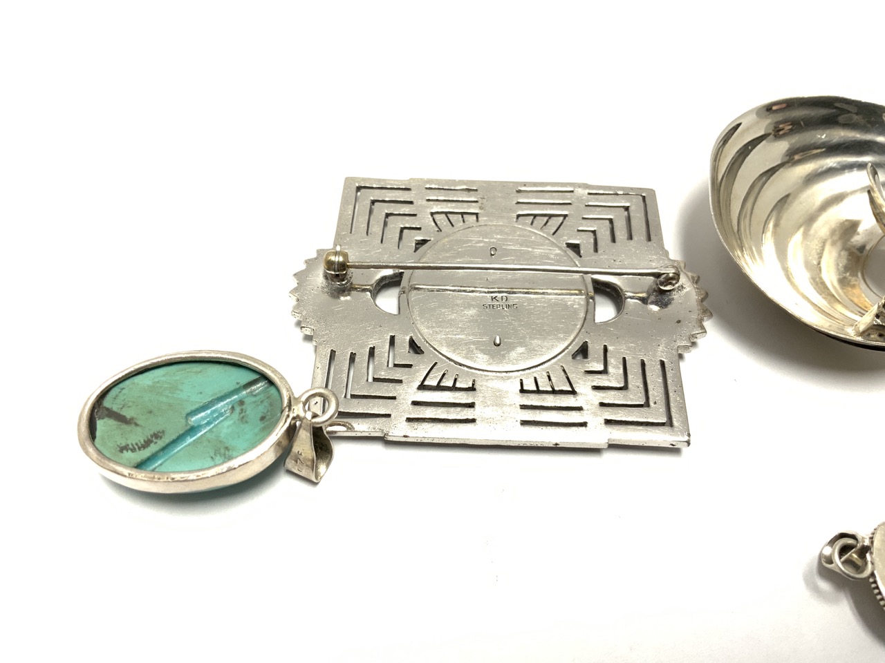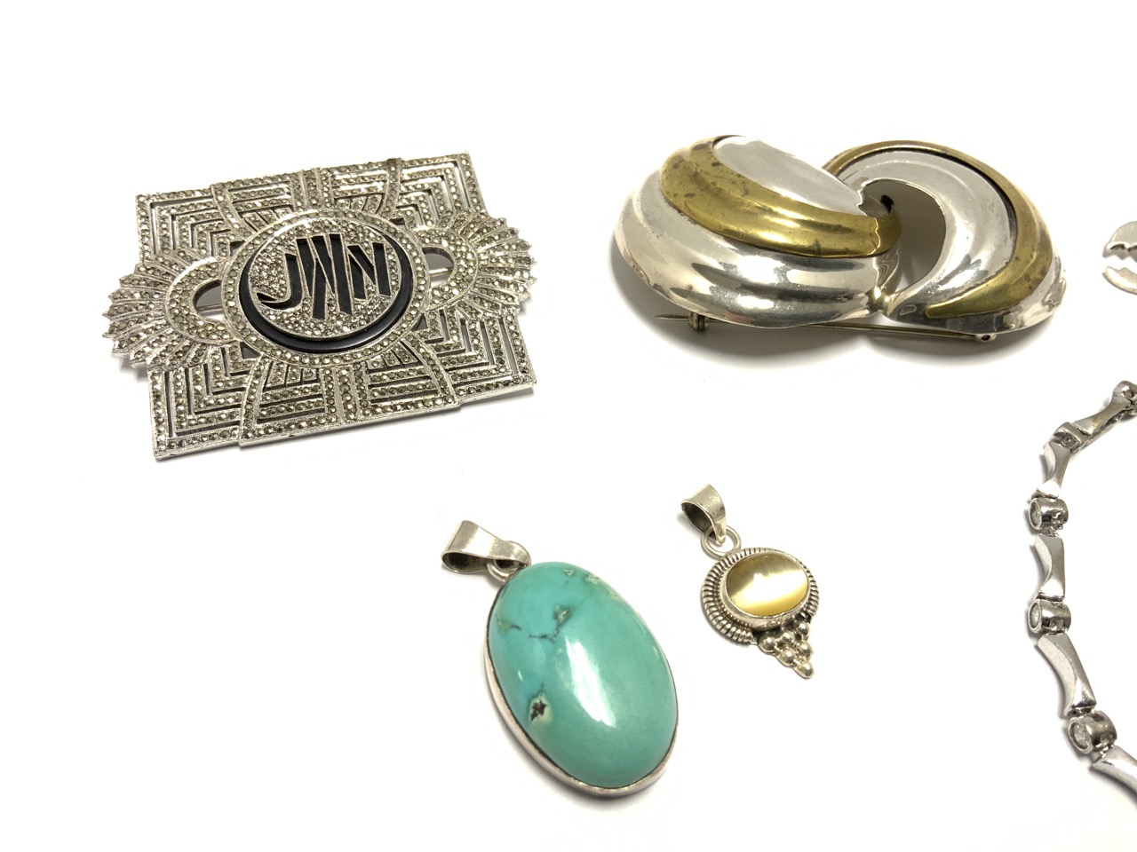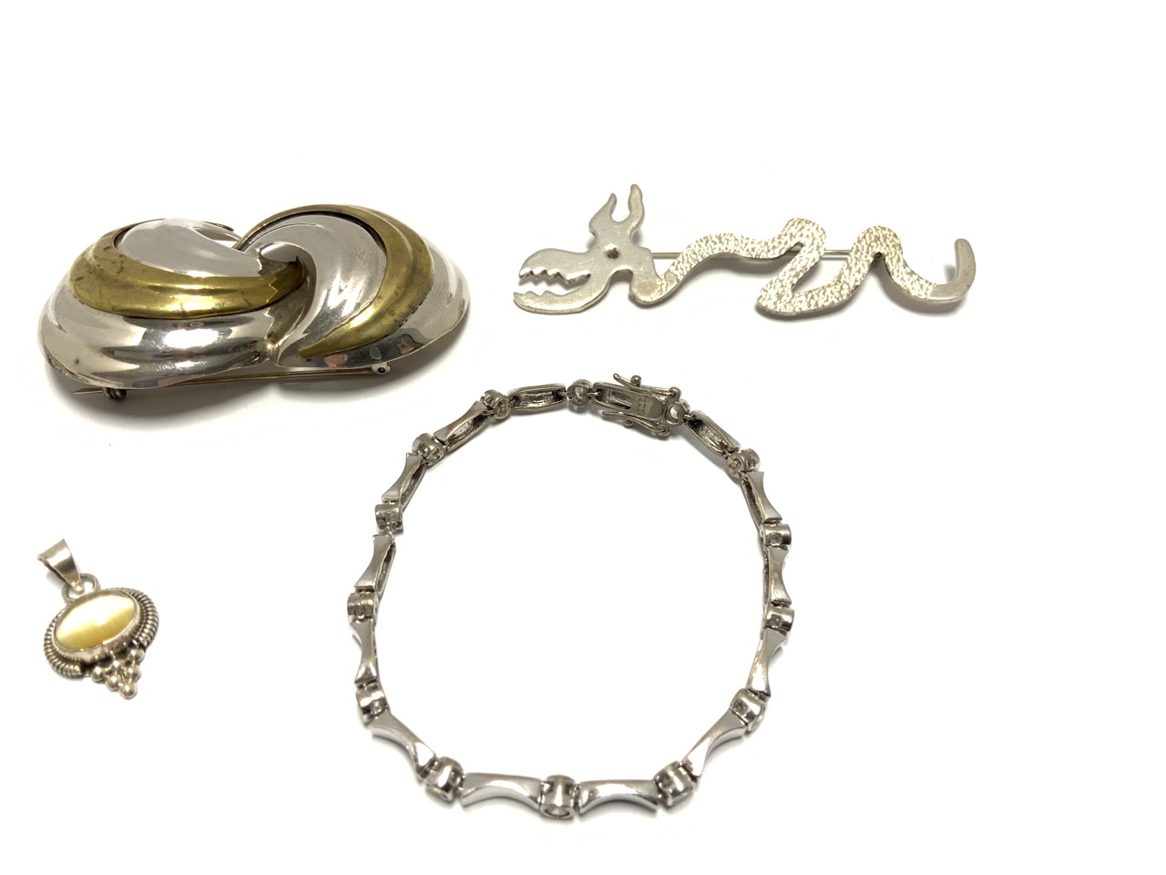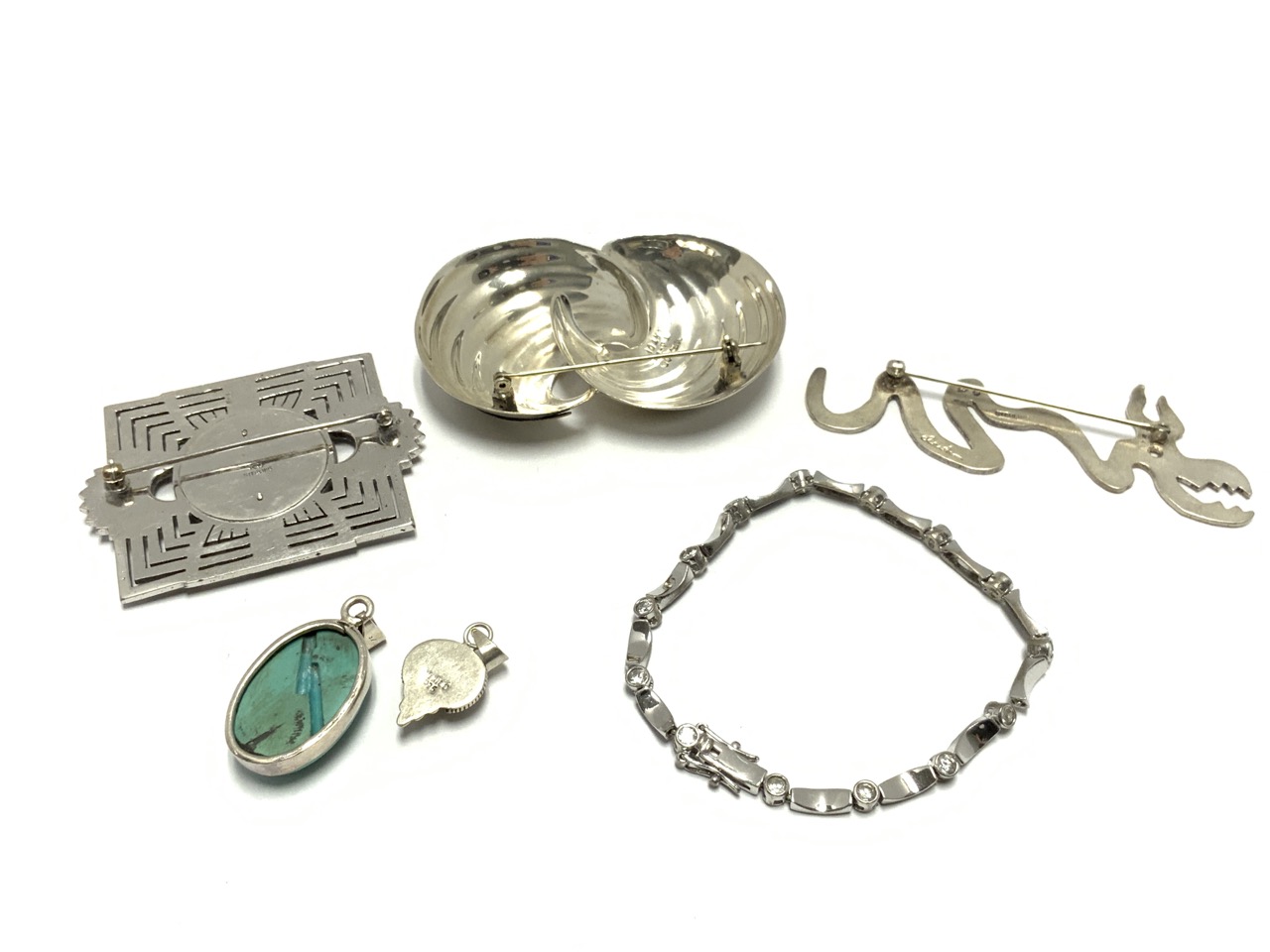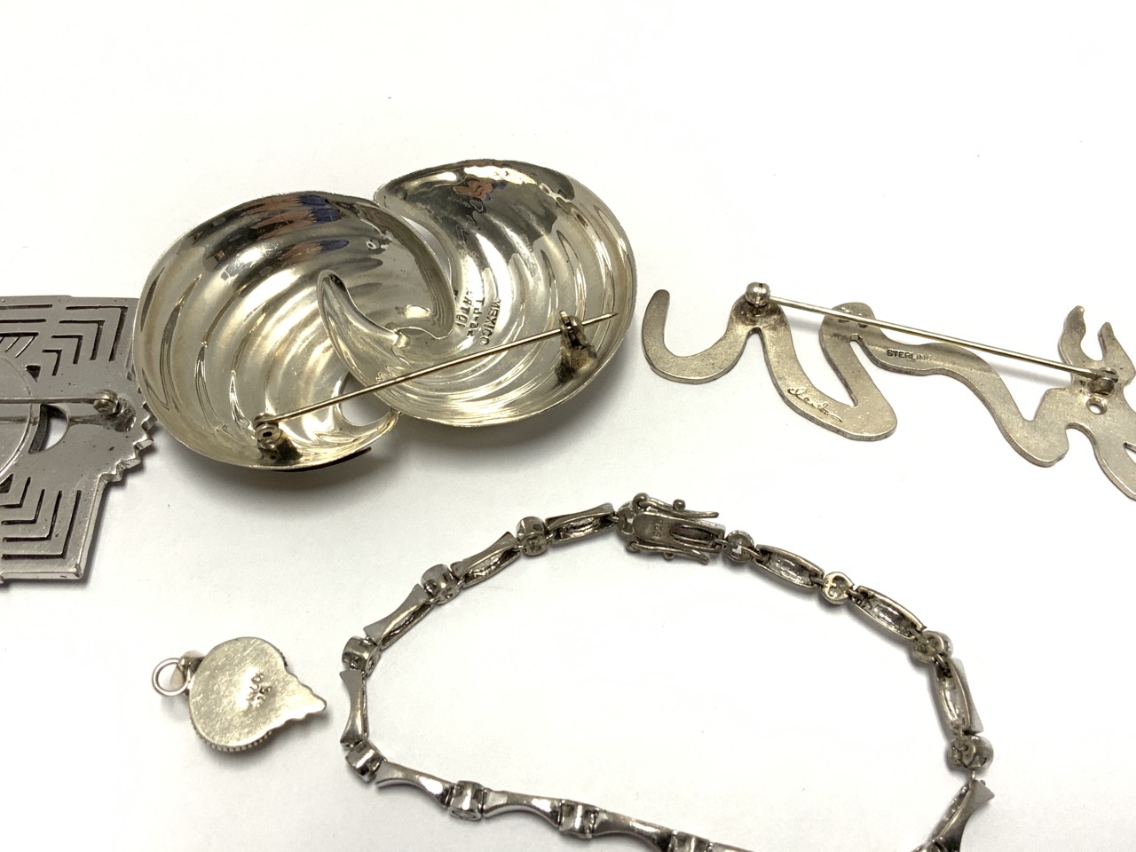 Six (6) piece sterling silver pins, bracelet and pendants lot.