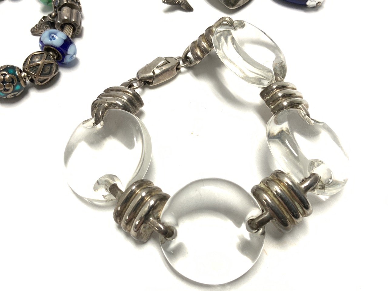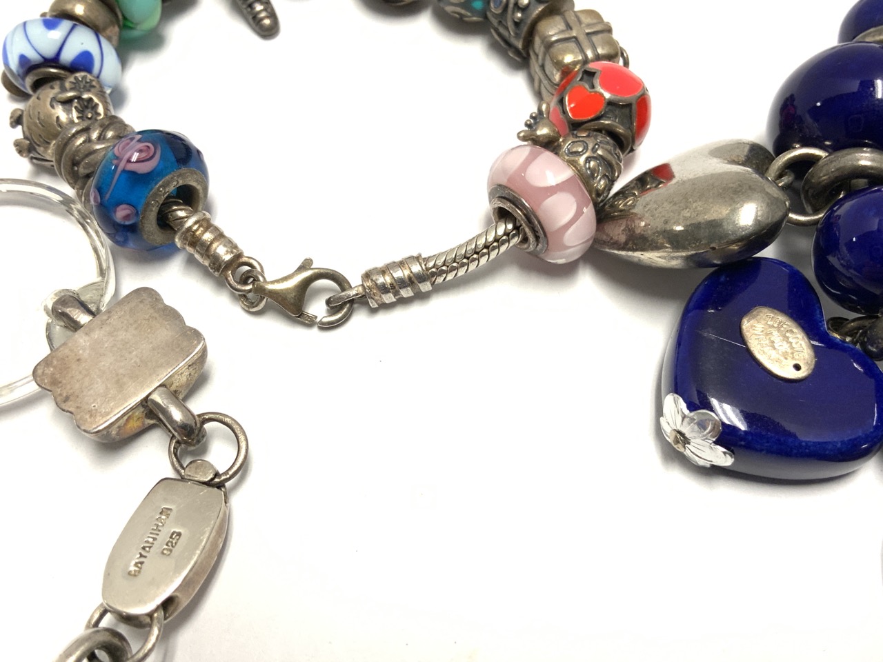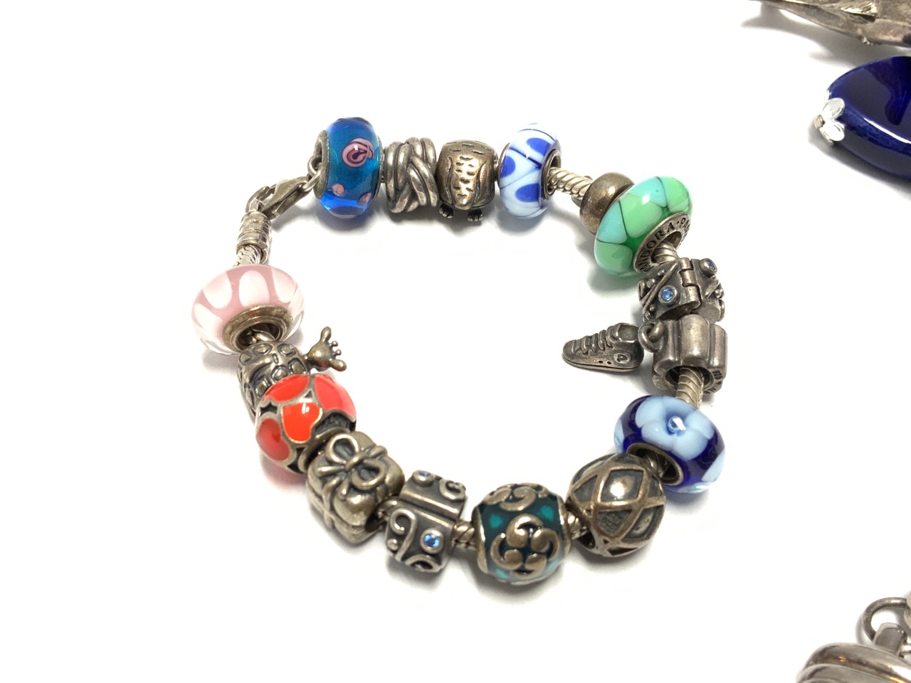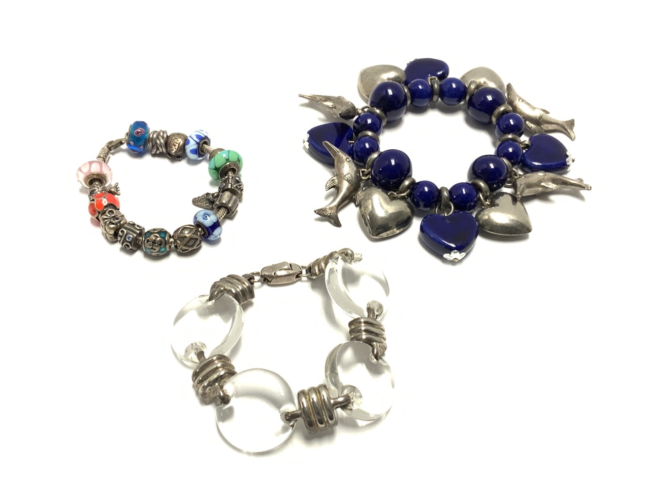 Three sterling silver charm bracelets and stones. Pandora charms etc.