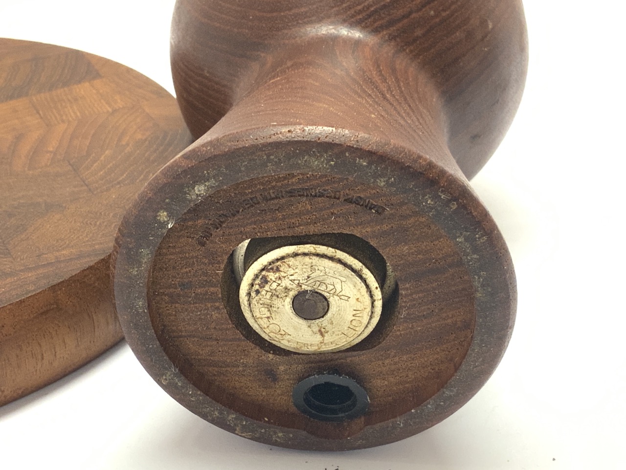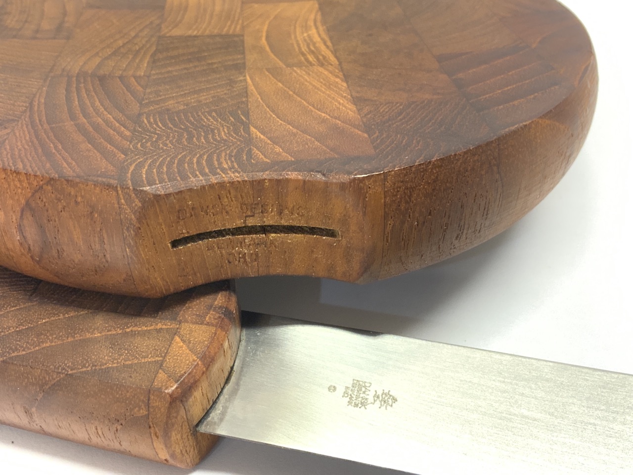Vintage Dansk teakwood cheese cutting board with knife and pepper shaker.