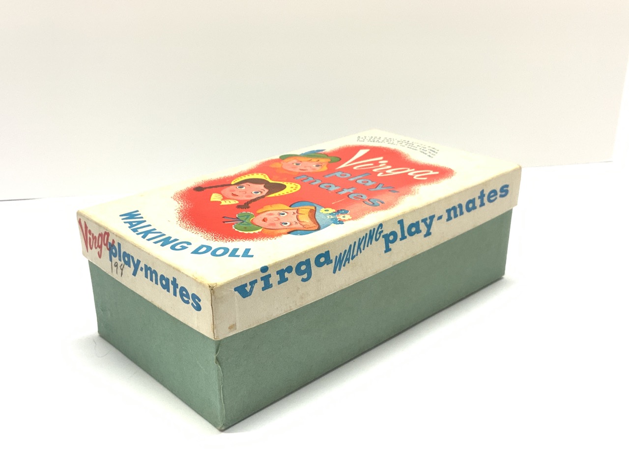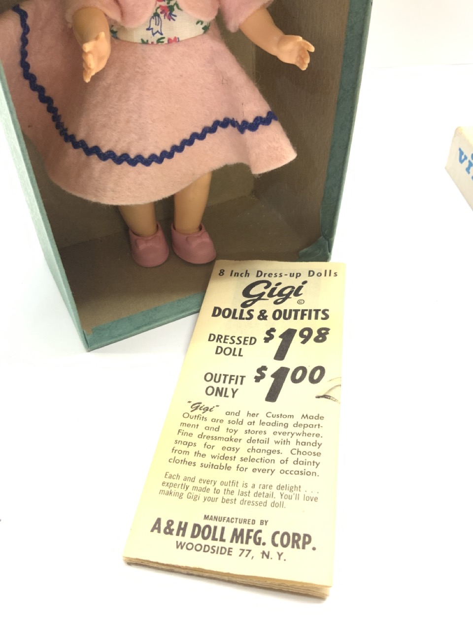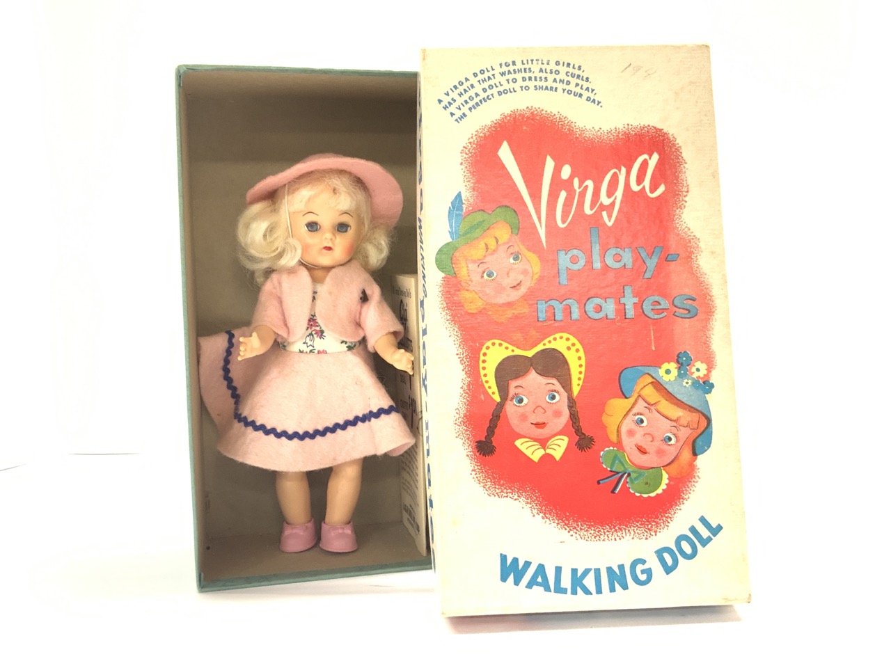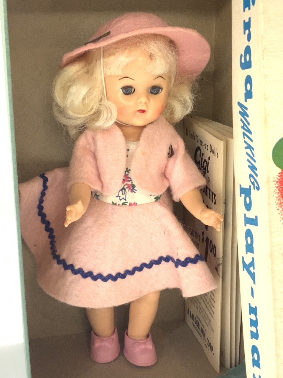 Virga Play-Mates Walking Gigi Doll. Pristine in box. Still affixed to box. Not removed. Style Of Vogue Ginny. c.1950's