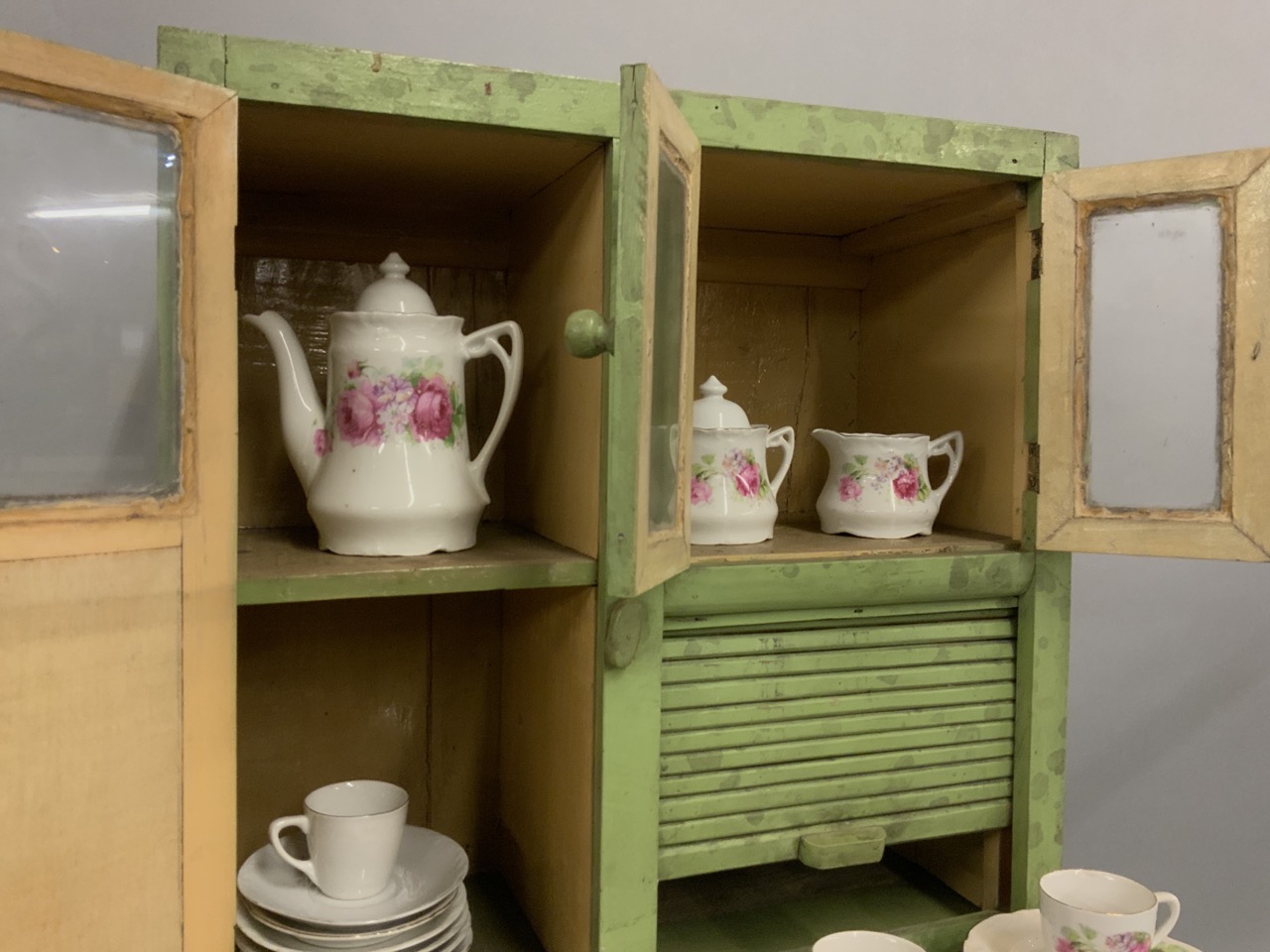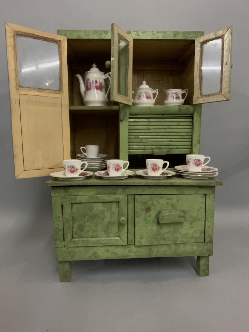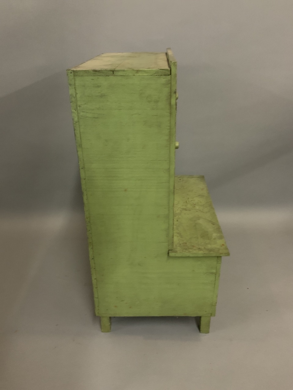 A rare Child's or Salesman sample green painted hoosier cabinet.