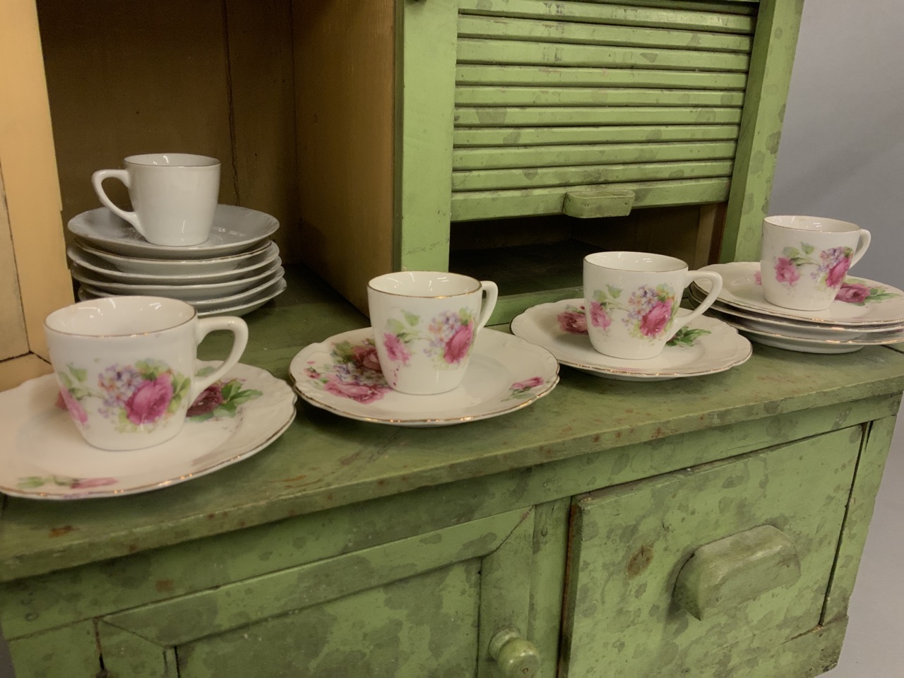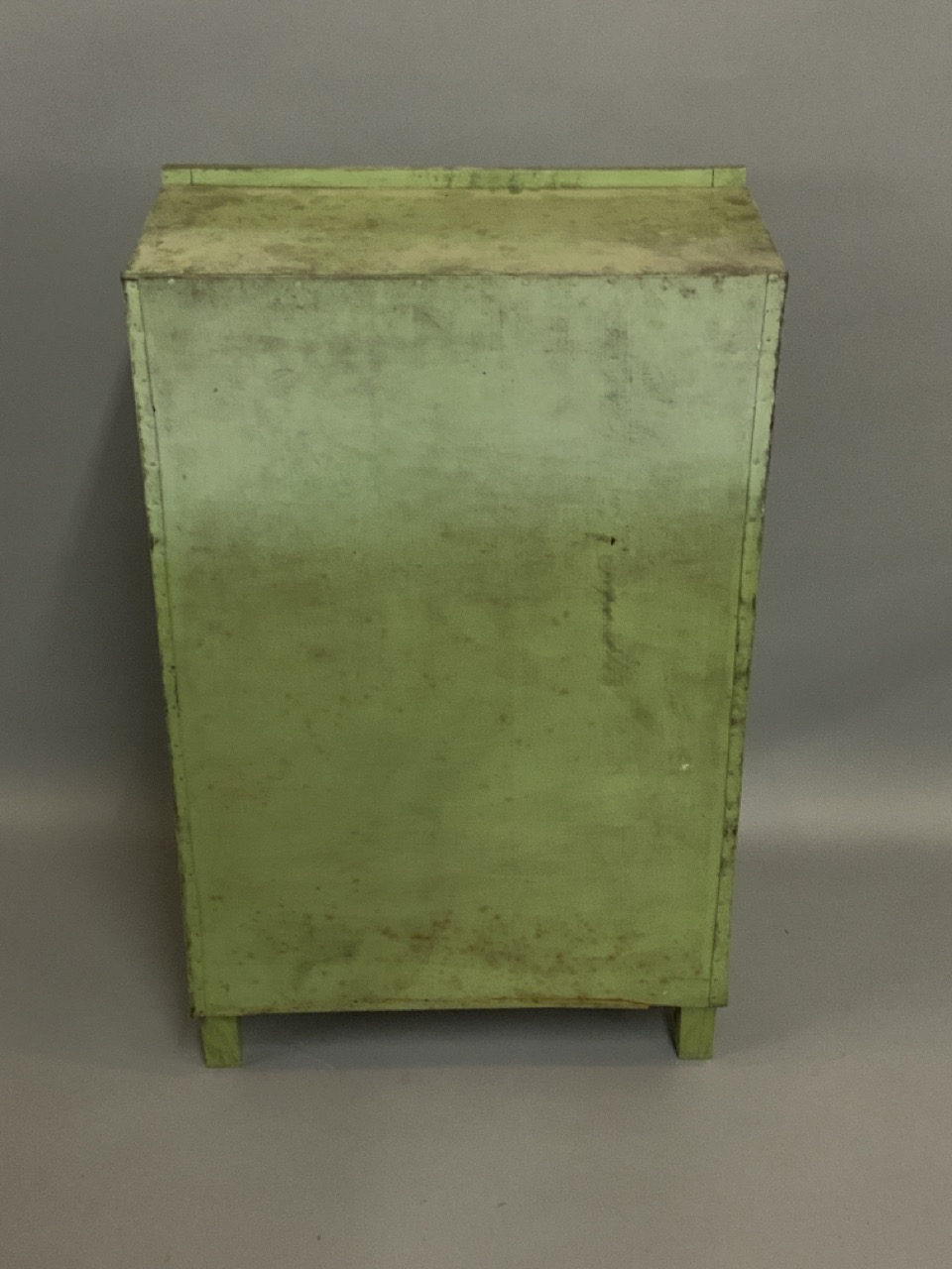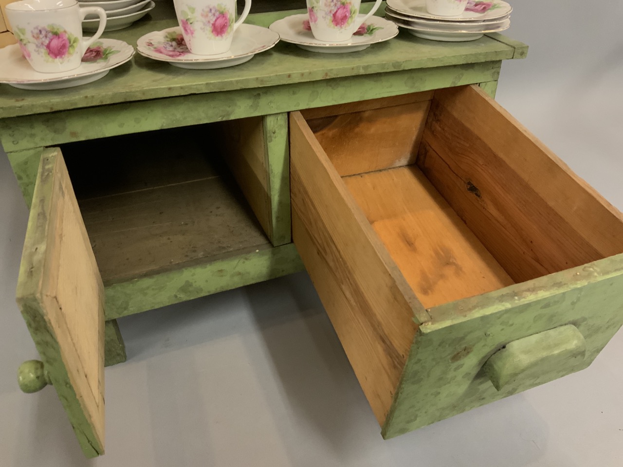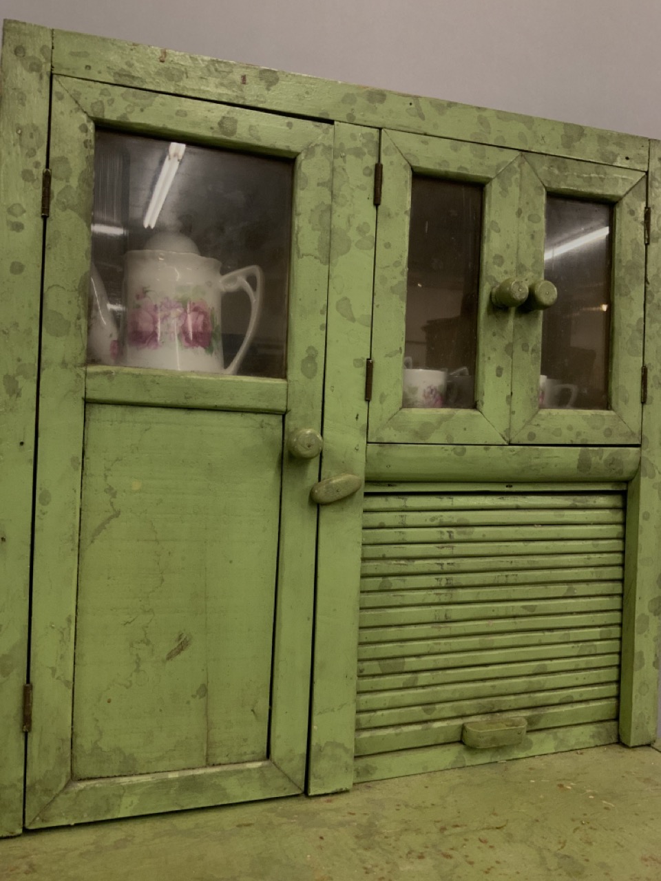 A rare Child's or Salesman sample green painted hoosier cabinet.