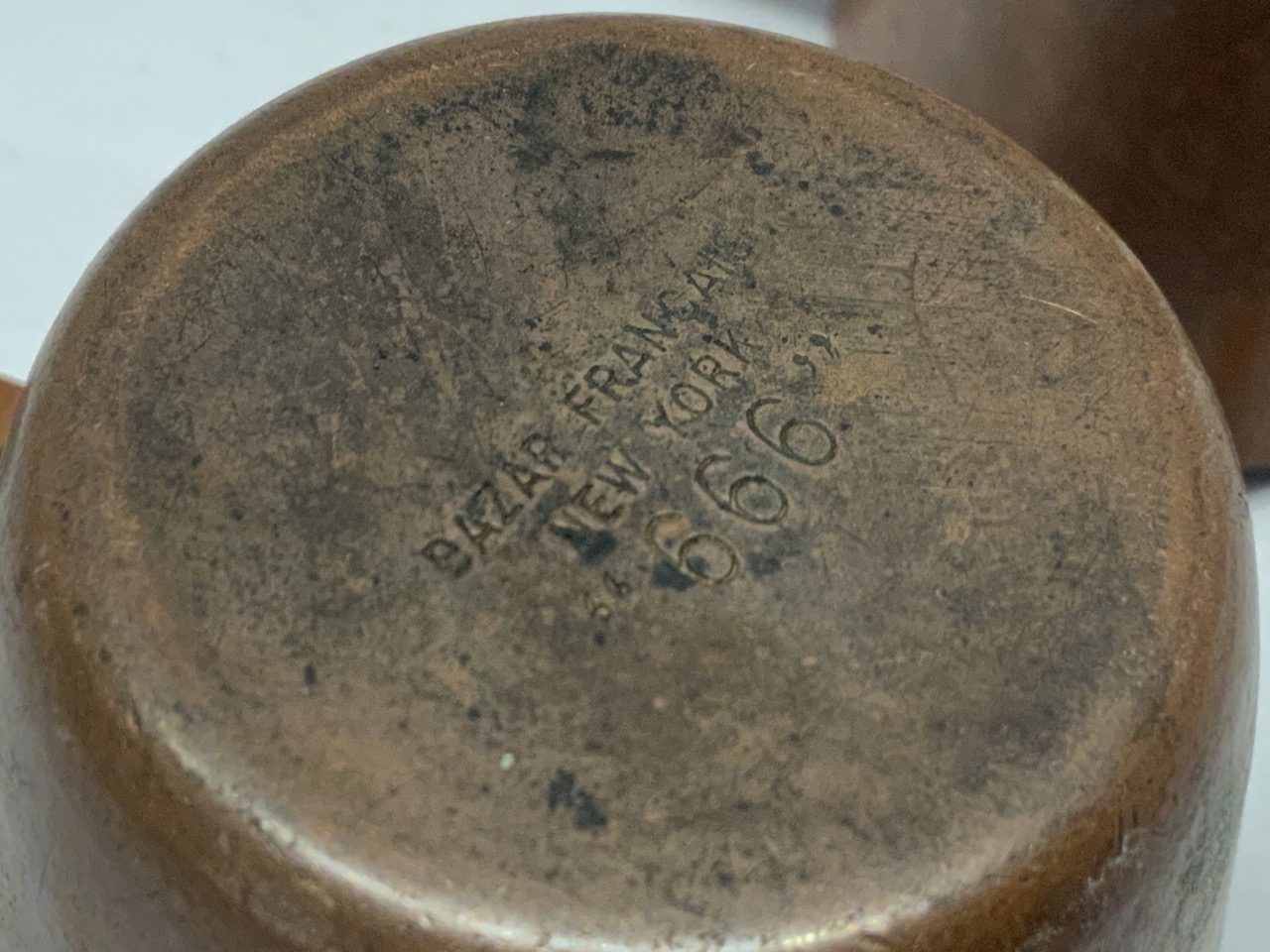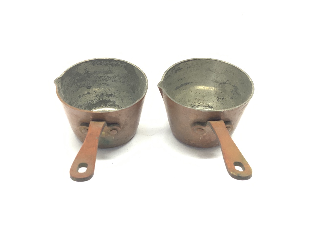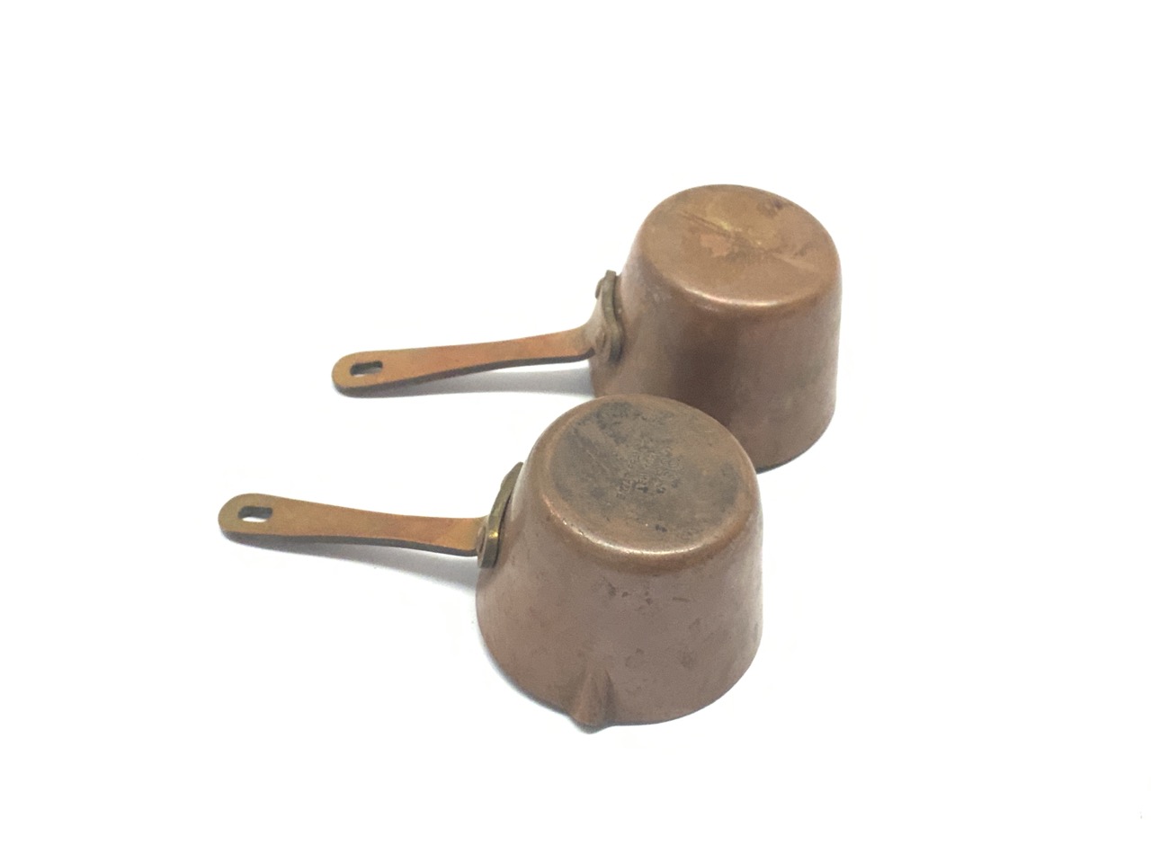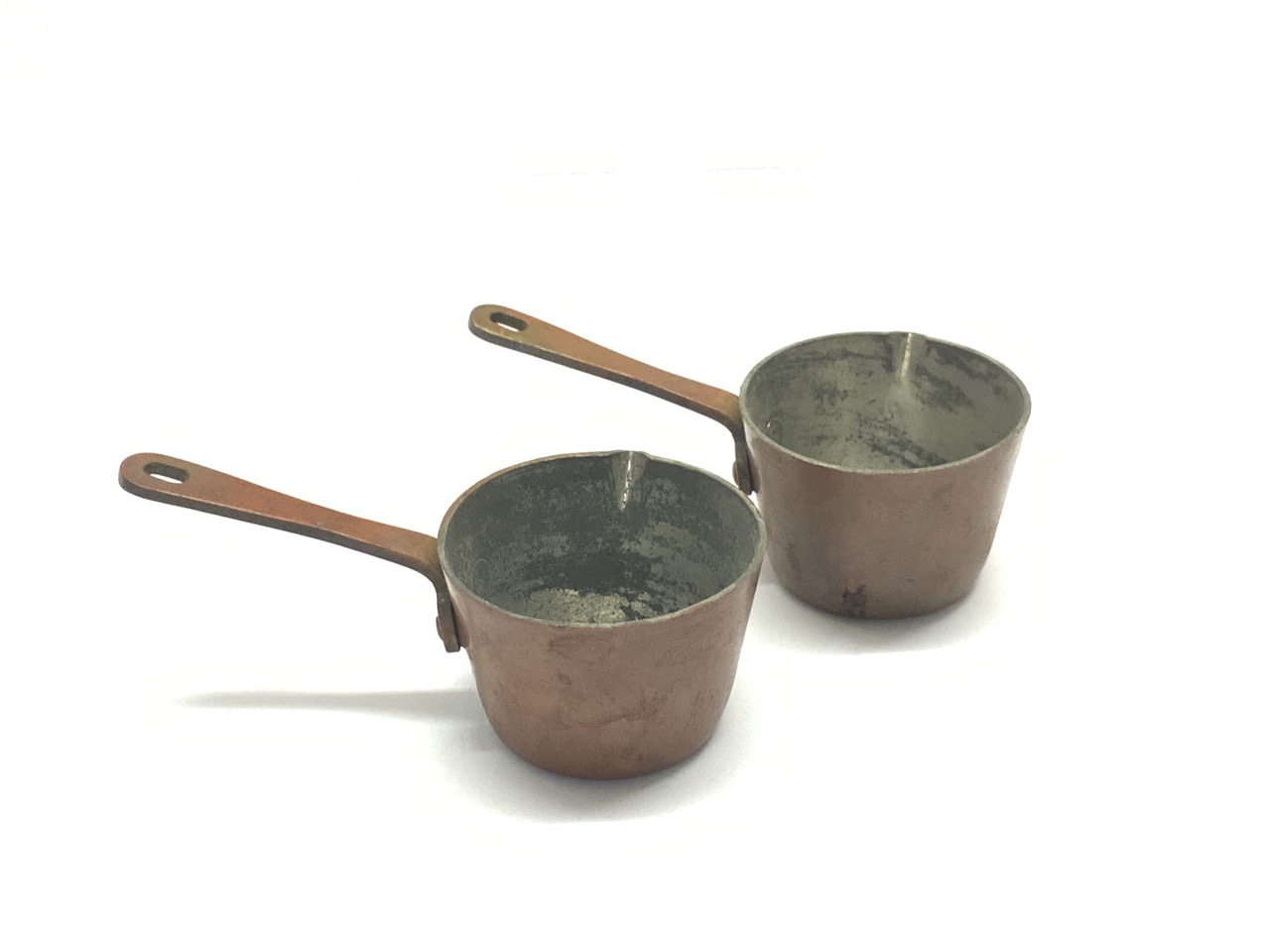 Two (2) small Bazaar Francais NY minute copper measures.