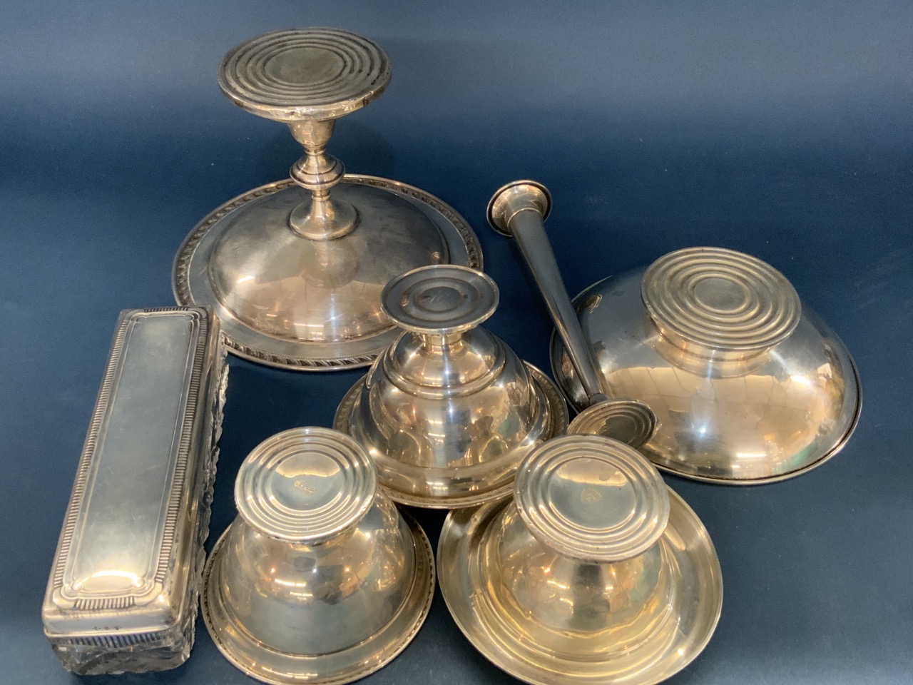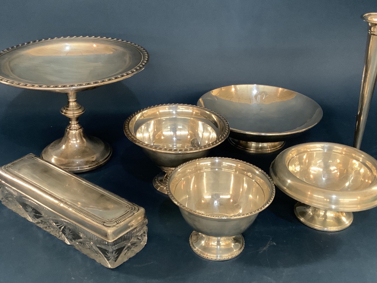 Sterling silver weighted table wares group and glass box with sterling lid. As seen in photograph preview.