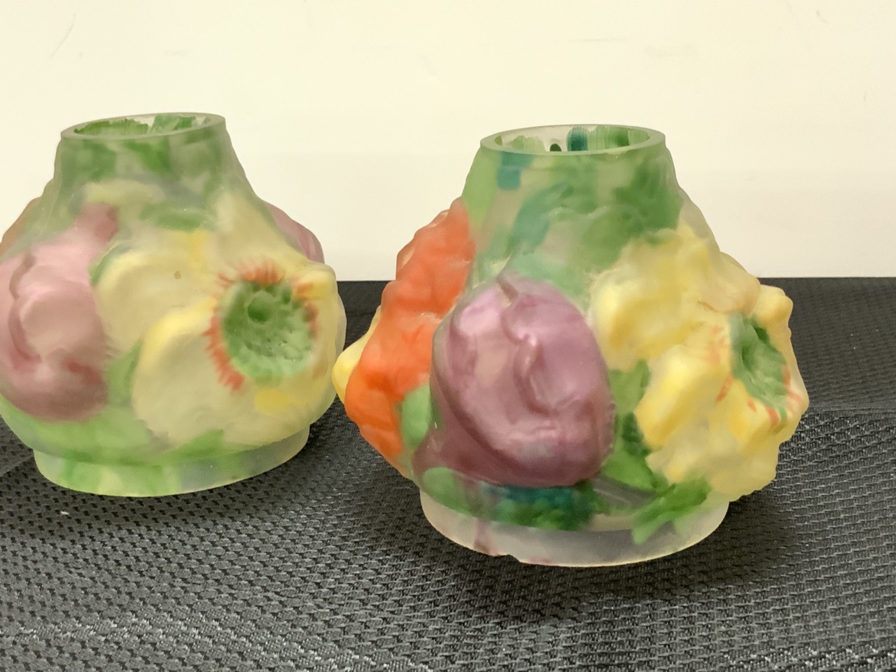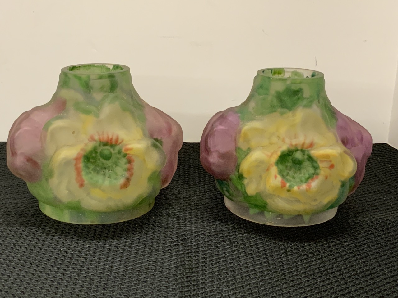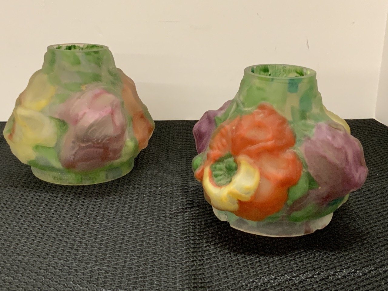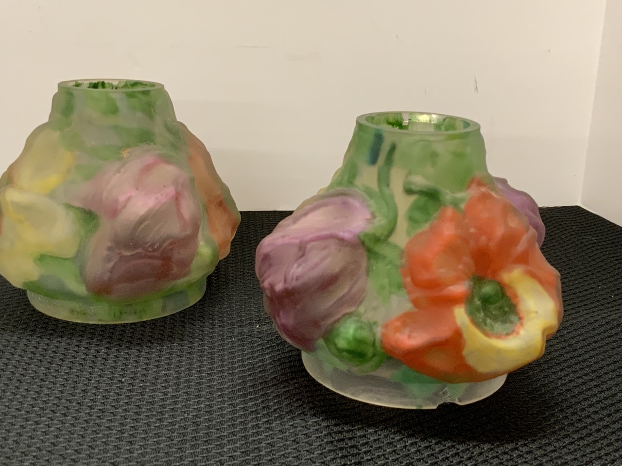 A pair of Pairpoint puffy glass flower candle lamp shades.