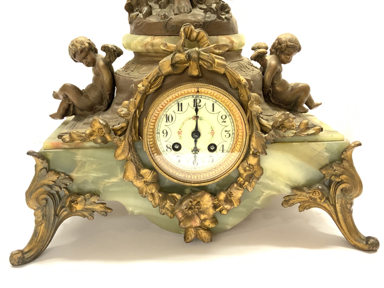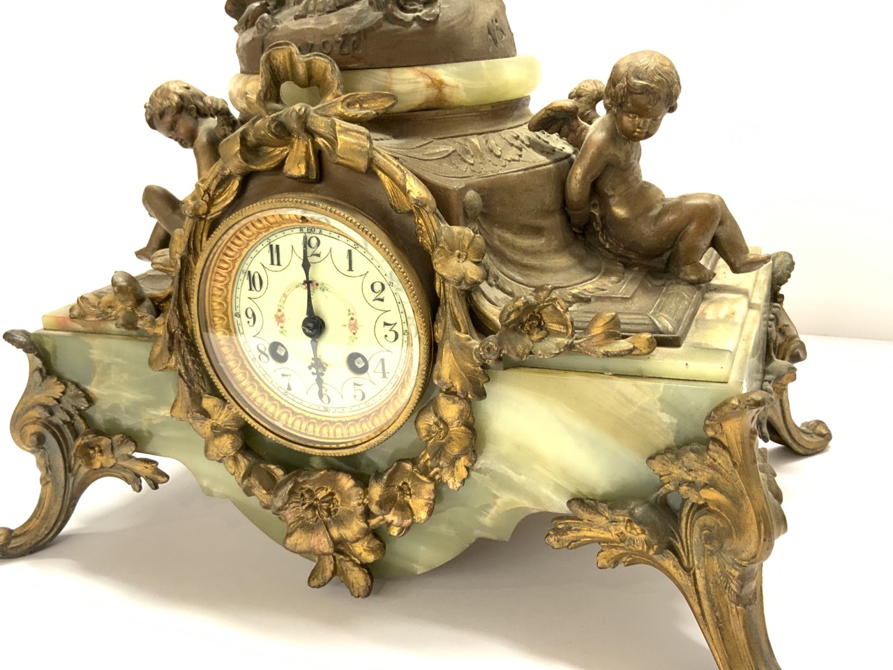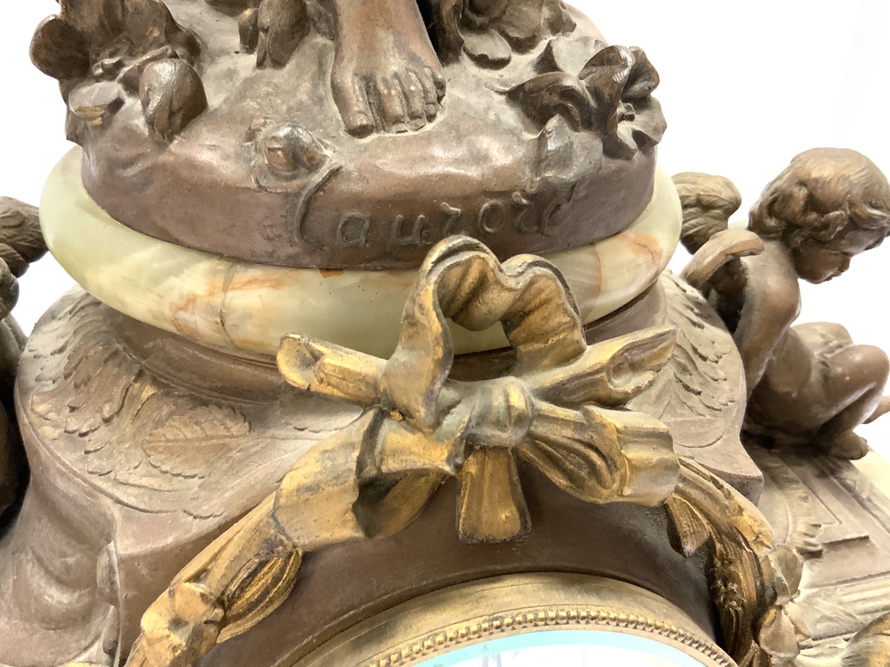 AD. Mougin French Clock with bronze Titled "Cauzoze" by Moreau set on a onyx stone and bronze footed base. 19th century. Dimensions: 27" X 14" X 9 1/2"