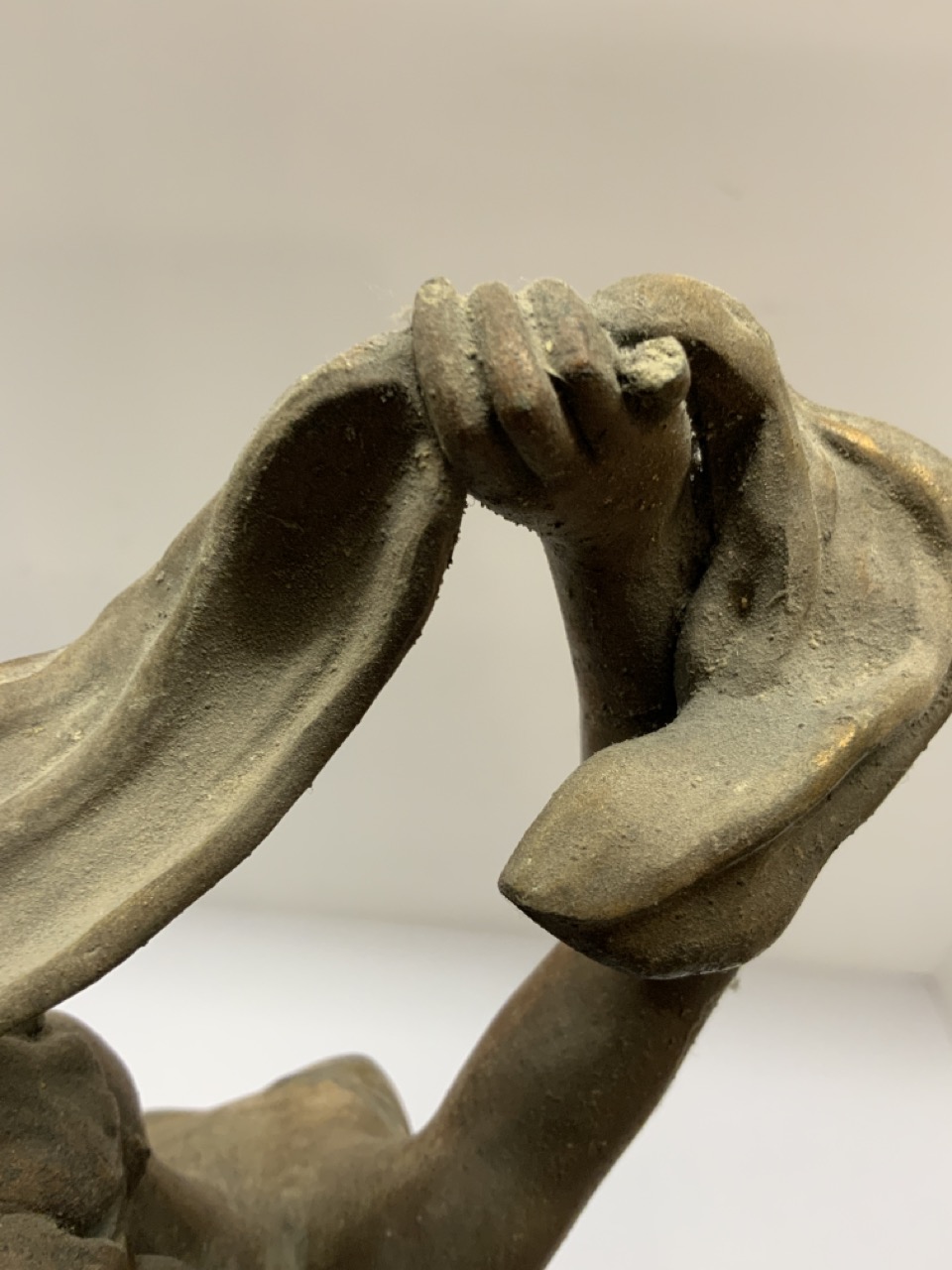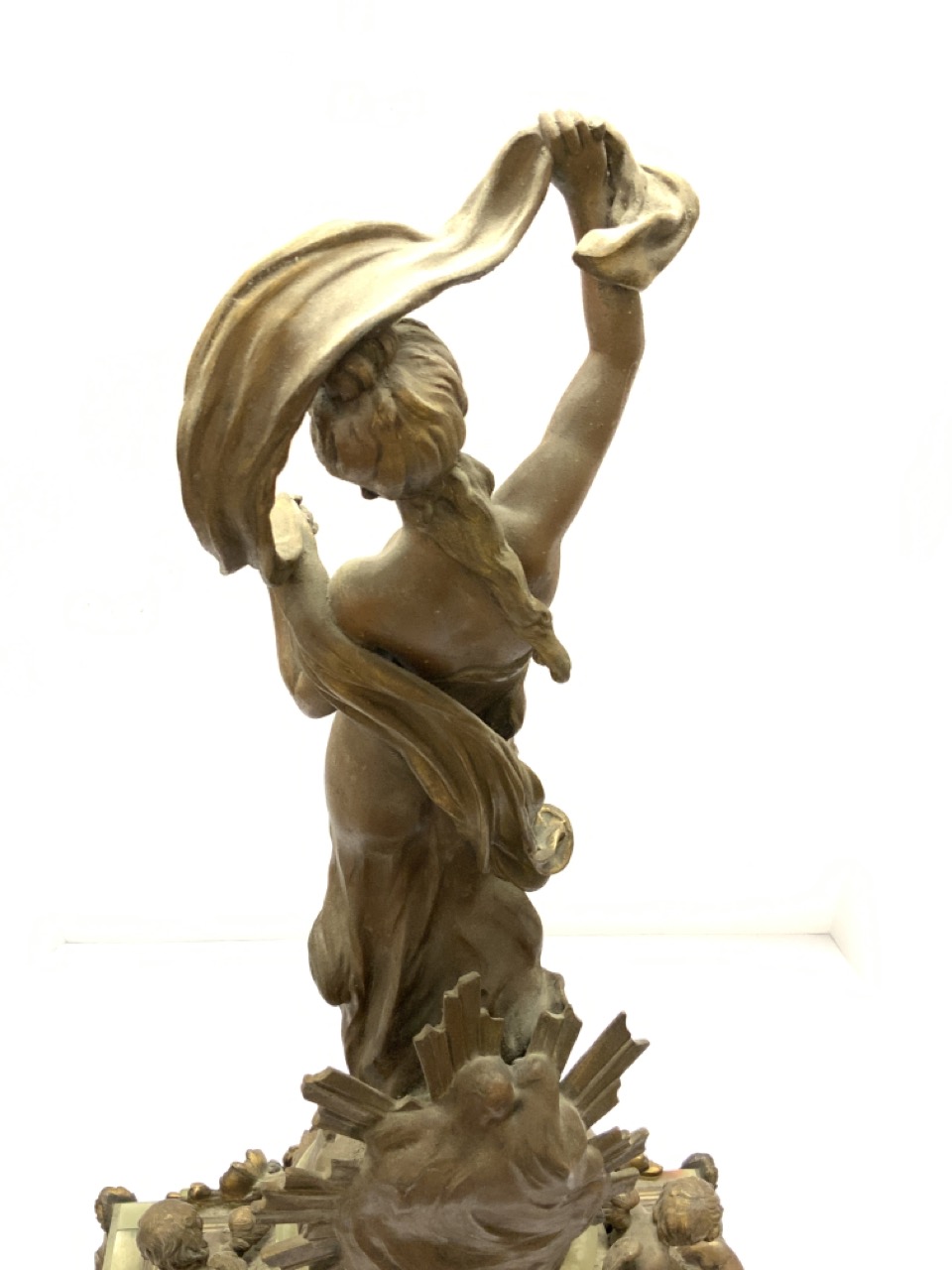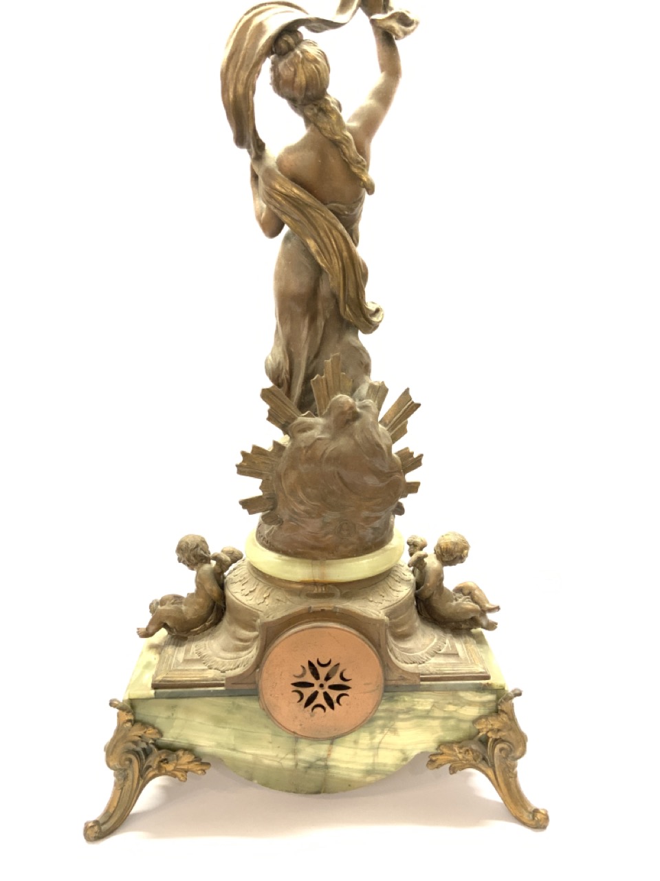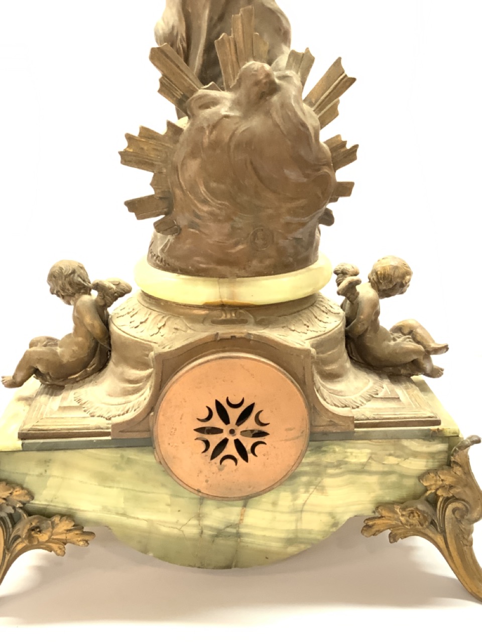 AD. Mougin French Clock with bronze Titled "Cauzoze" by Moreau set on a onyx stone and bronze footed base. 19th century. Dimensions: 27" X 14" X 9 1/2"