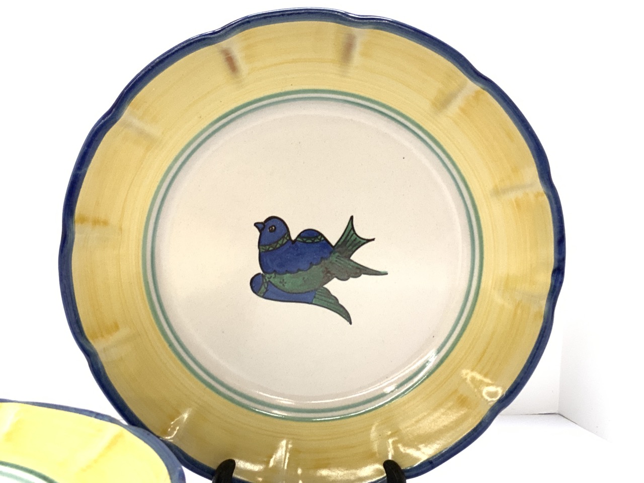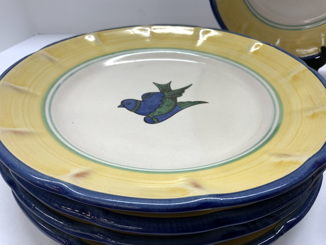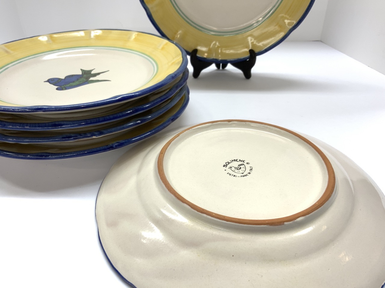 A set of six Solimene Vietri Italian dinner plates. Hand painted birds and florals. Made in Italy