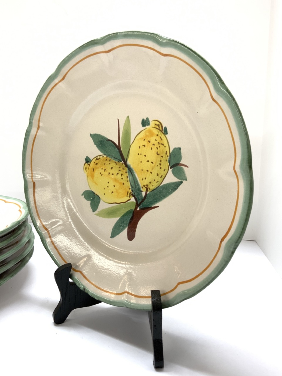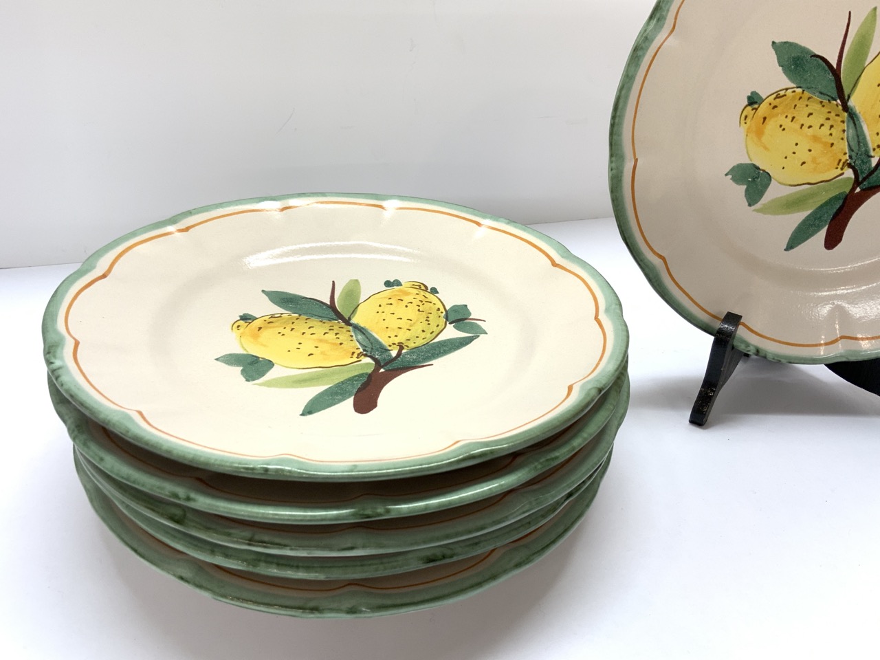 Set of six Solimene Vietri Italian ceramic dinner plates with hand painted lemons. Made in Italy.