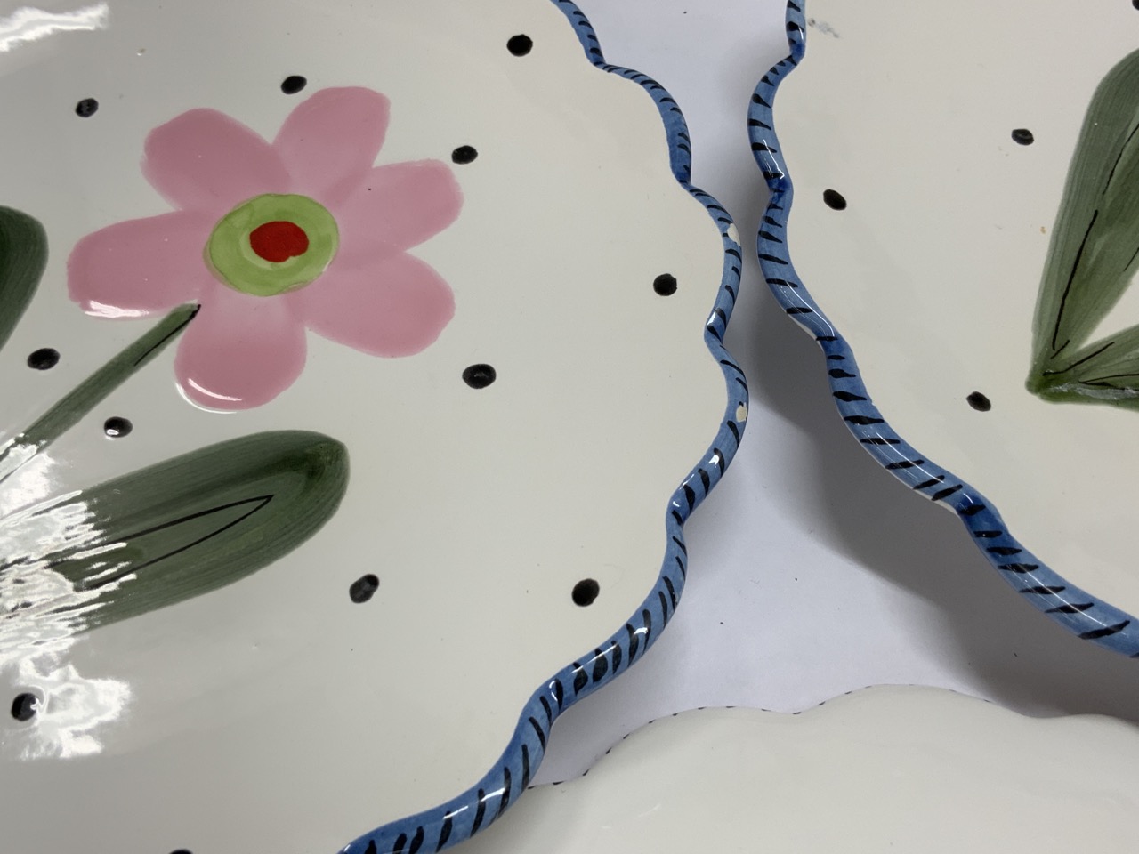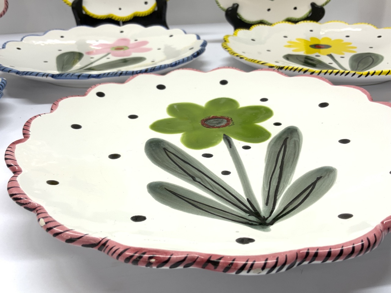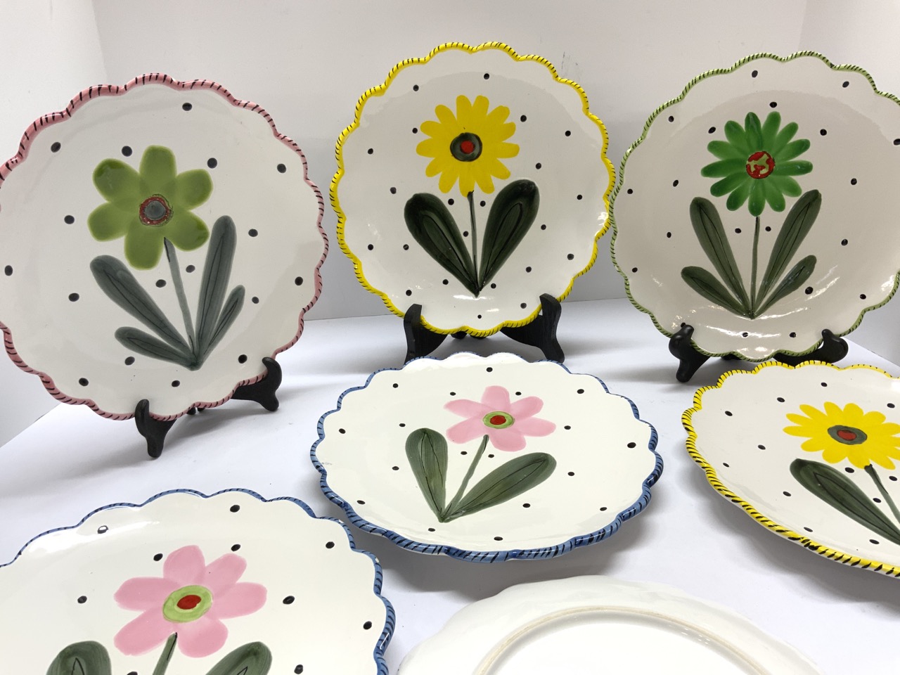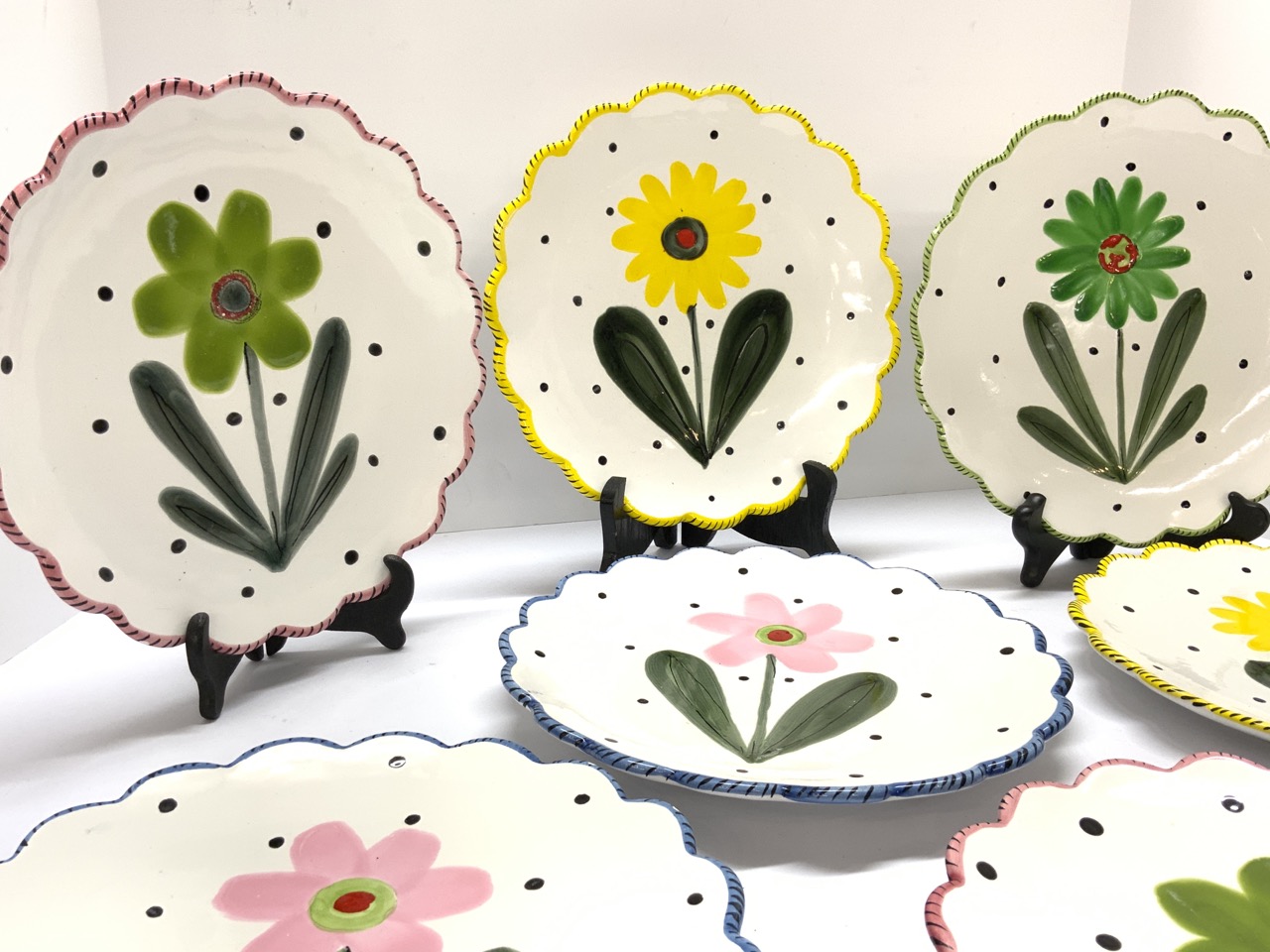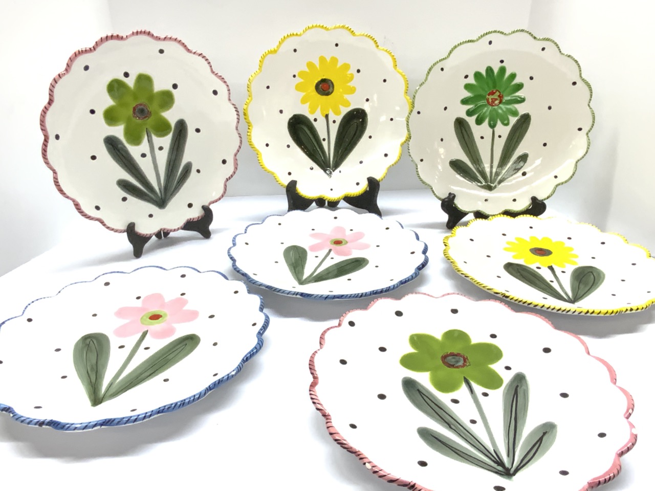 Seven (7) Italian ceramic bright floral plates. Hand painted. Made in Italy.
