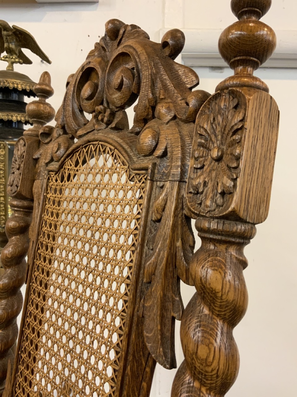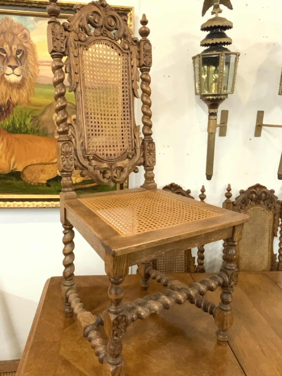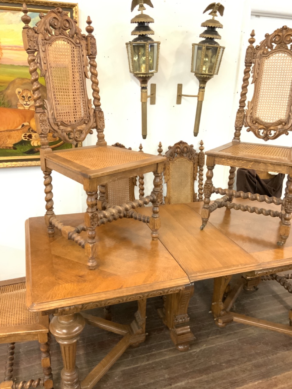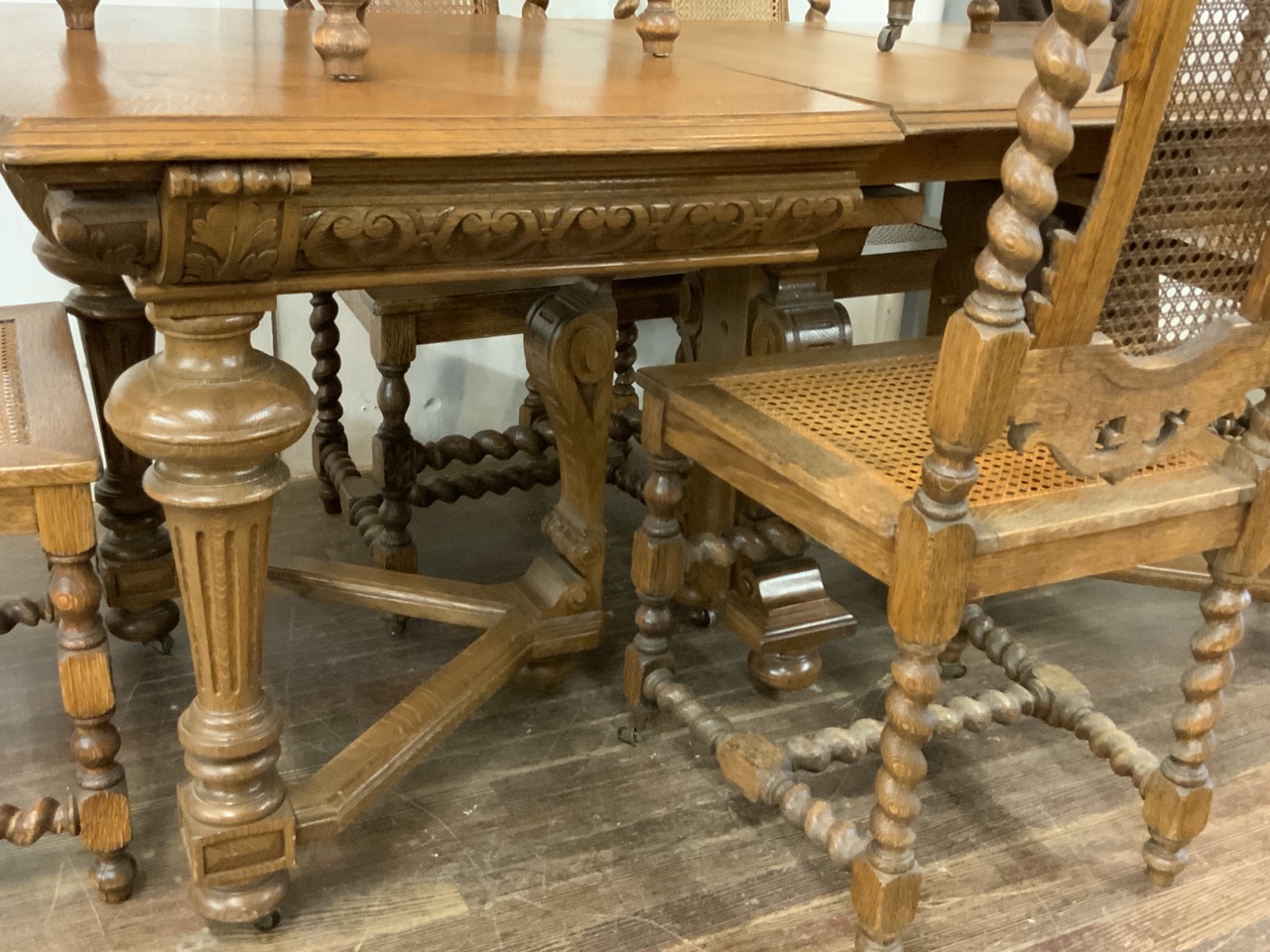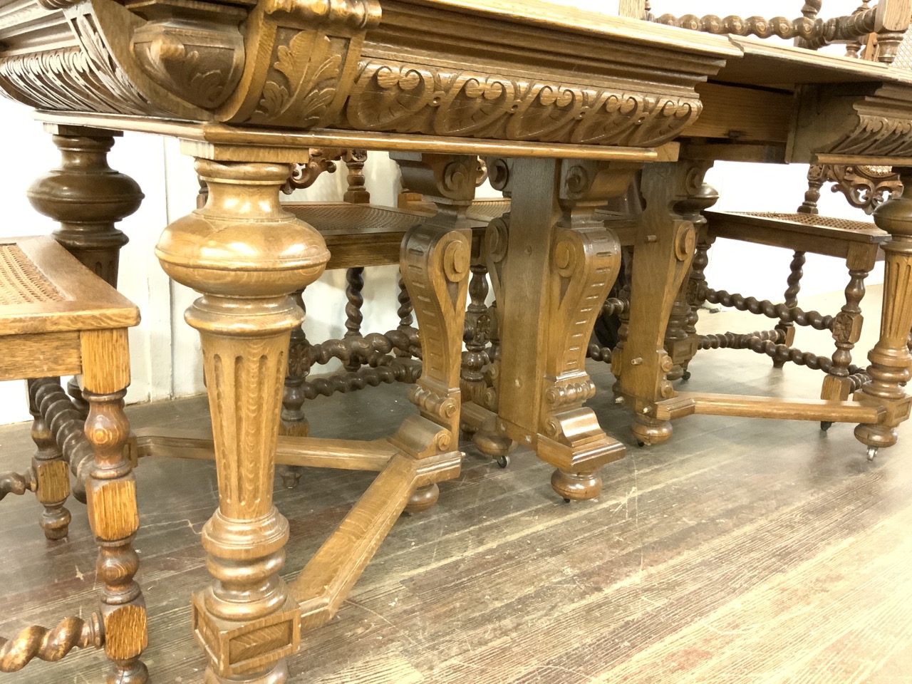 A fine French oak narrow rectangular table with leaves and seven carved chairs