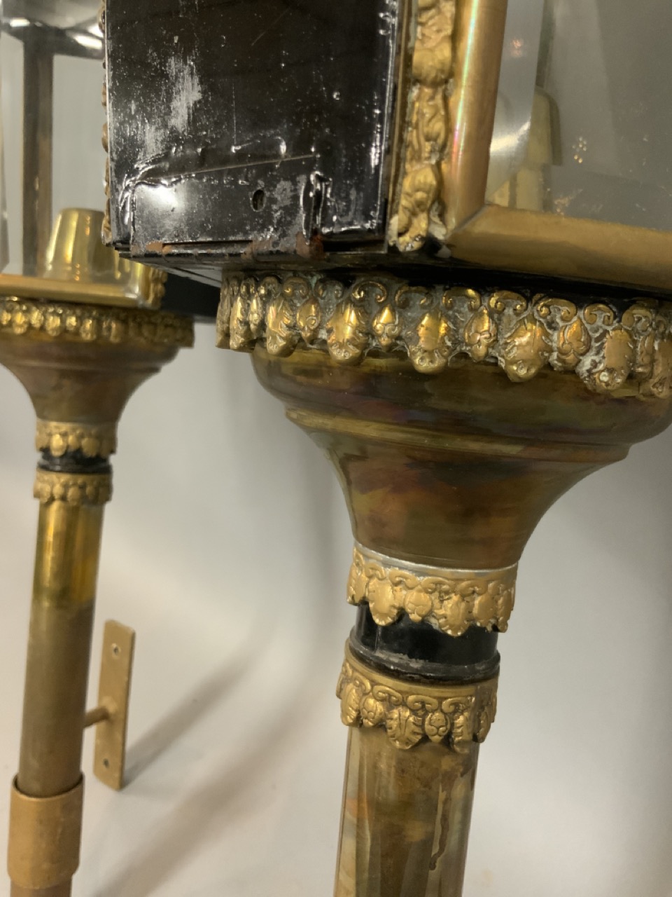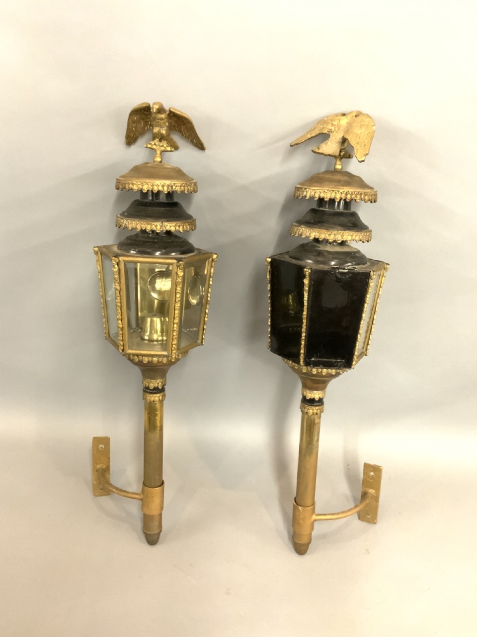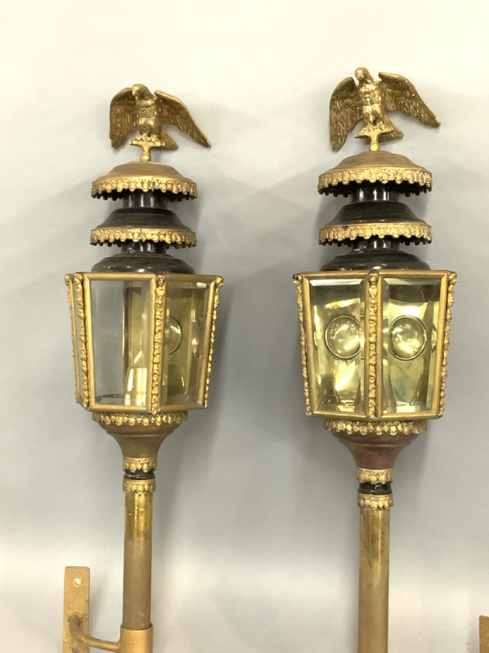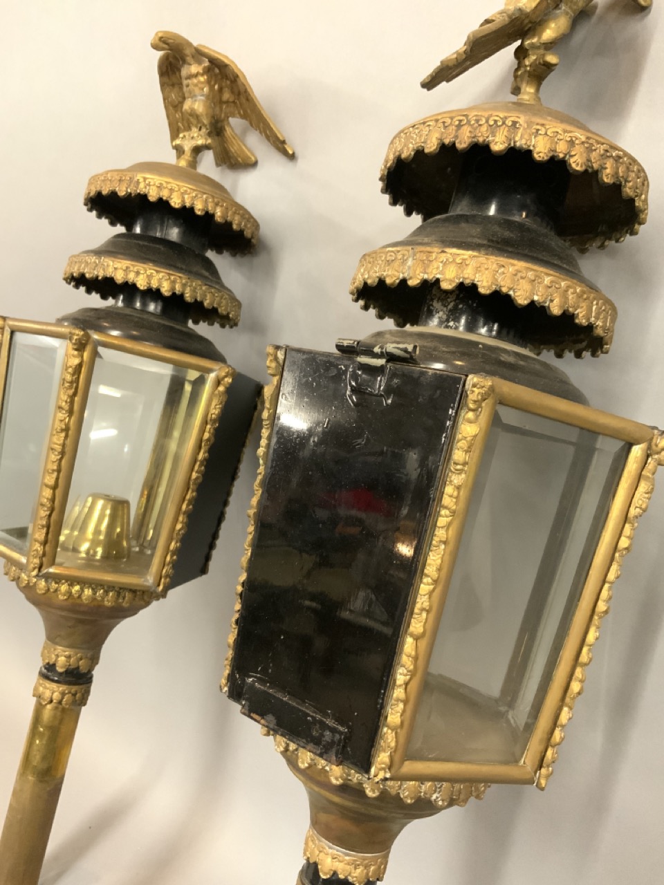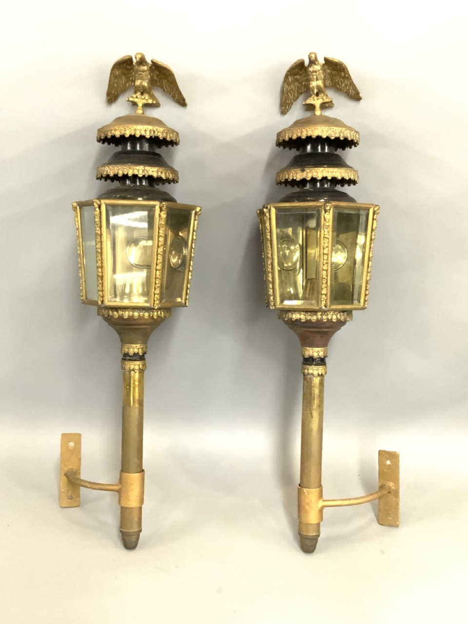 A pair of antique carriage lanterns with eagle finials. Fine example in brass with beveled glass panels.