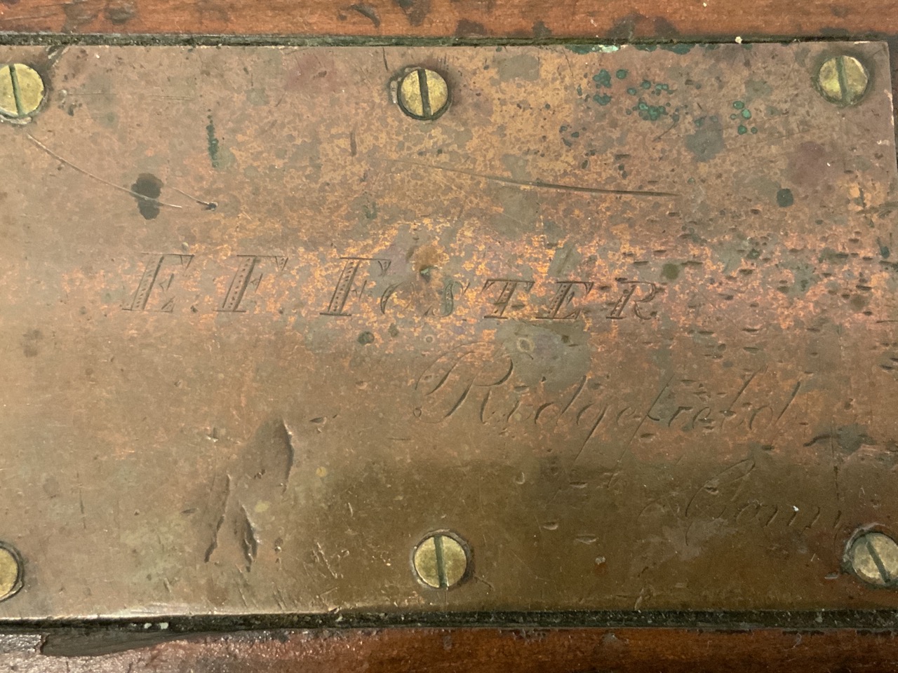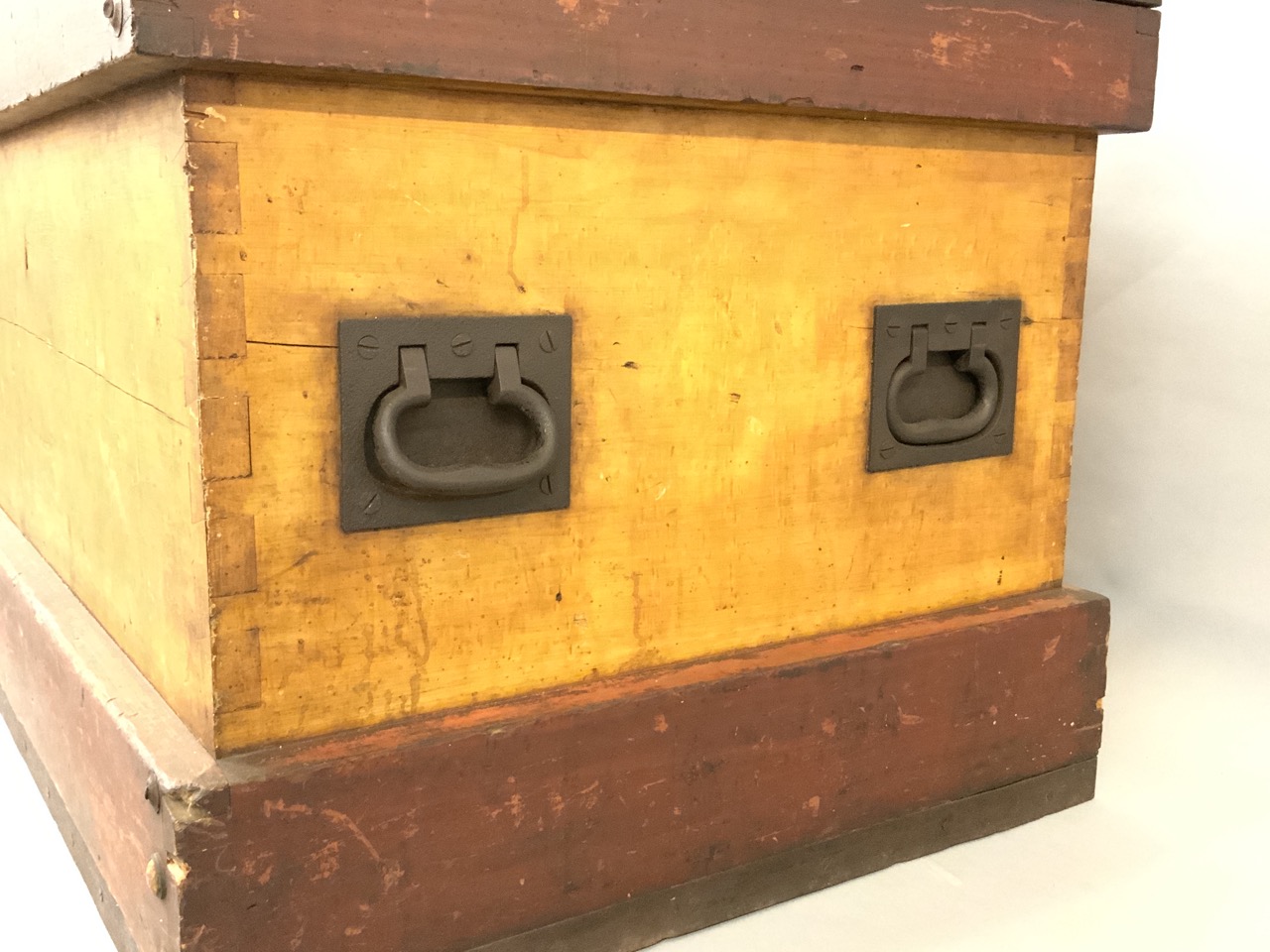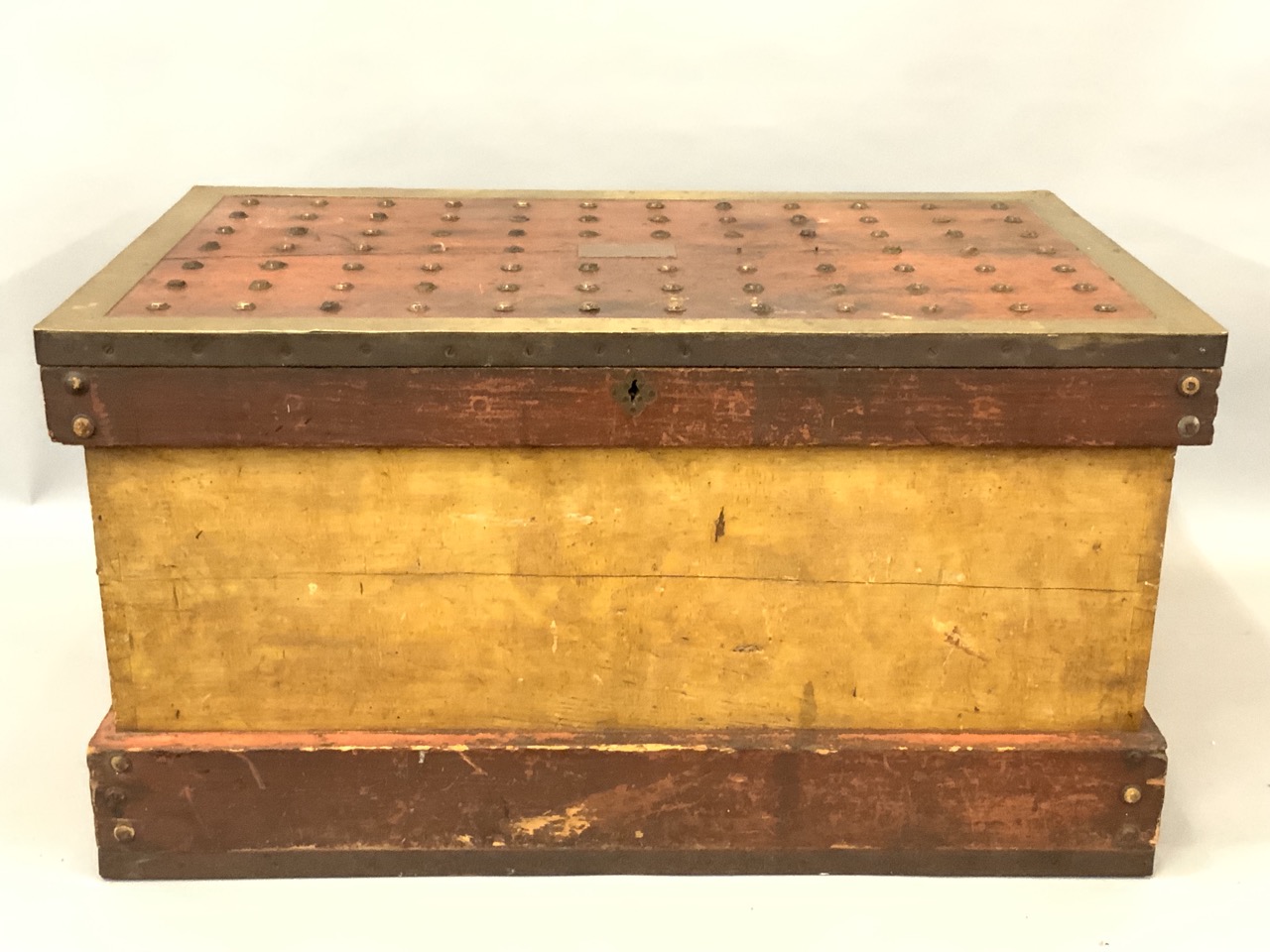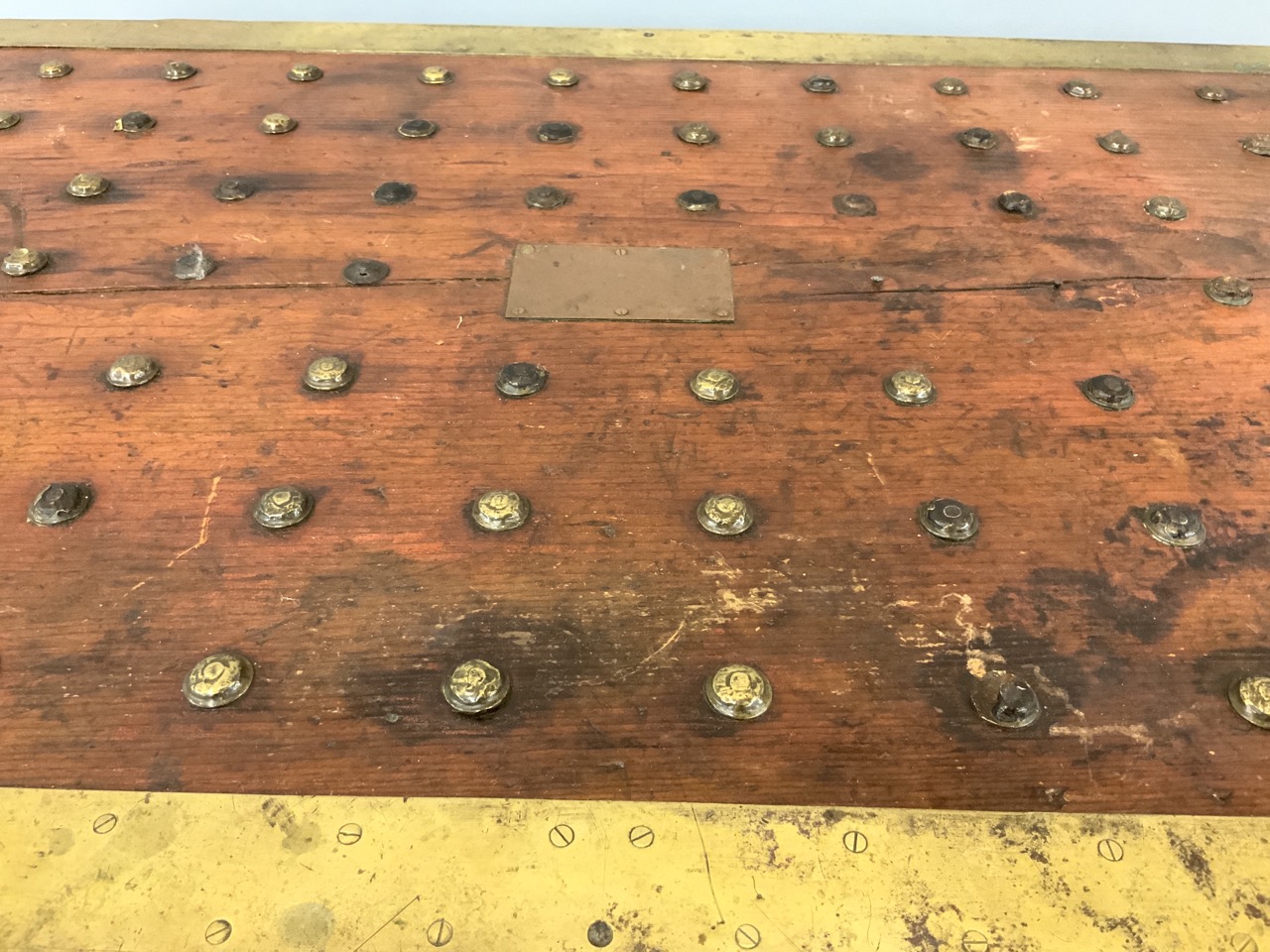 An antique carpenter's chest. Large oversize with brass reinforcement. Studded top. A brass plaque centered at top readls