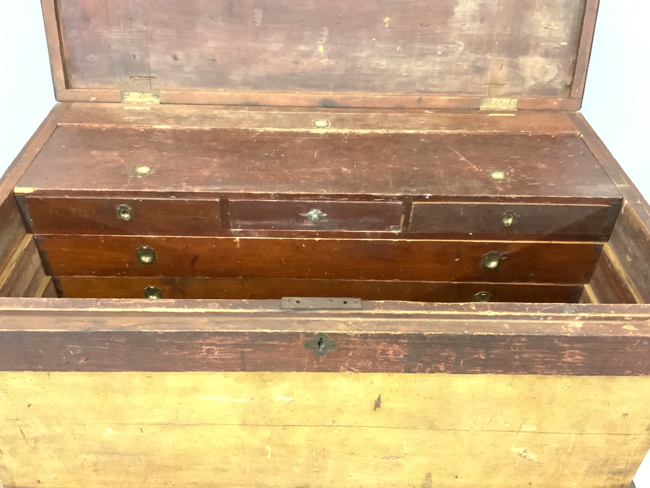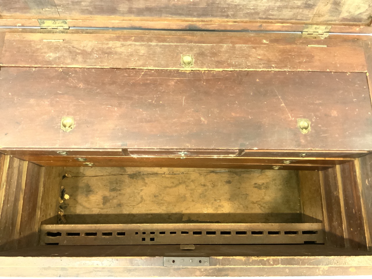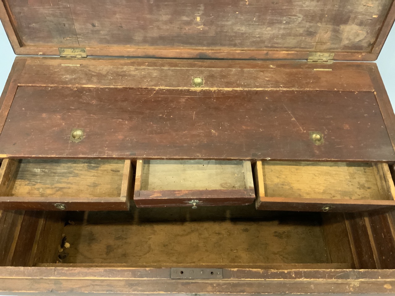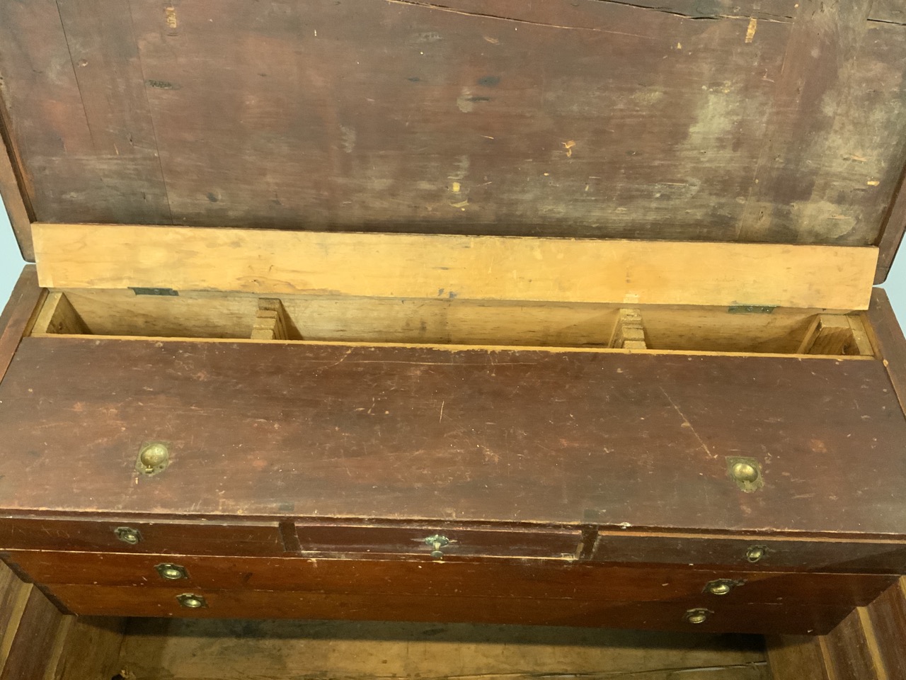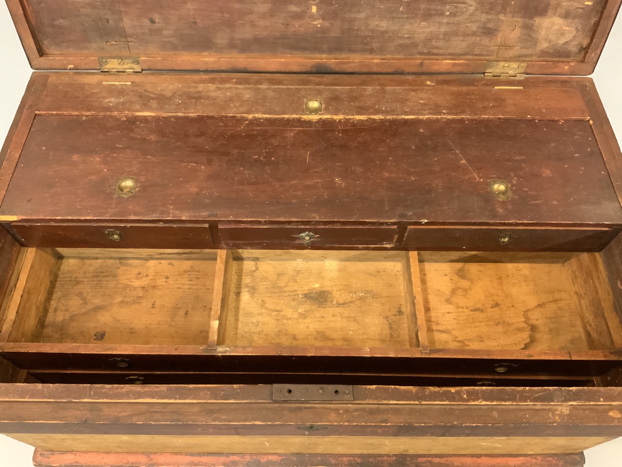 Interior is filled with drawers an slots to house woodworking tooks, chisels, drills, woodplanes etc. A very impressive chest.