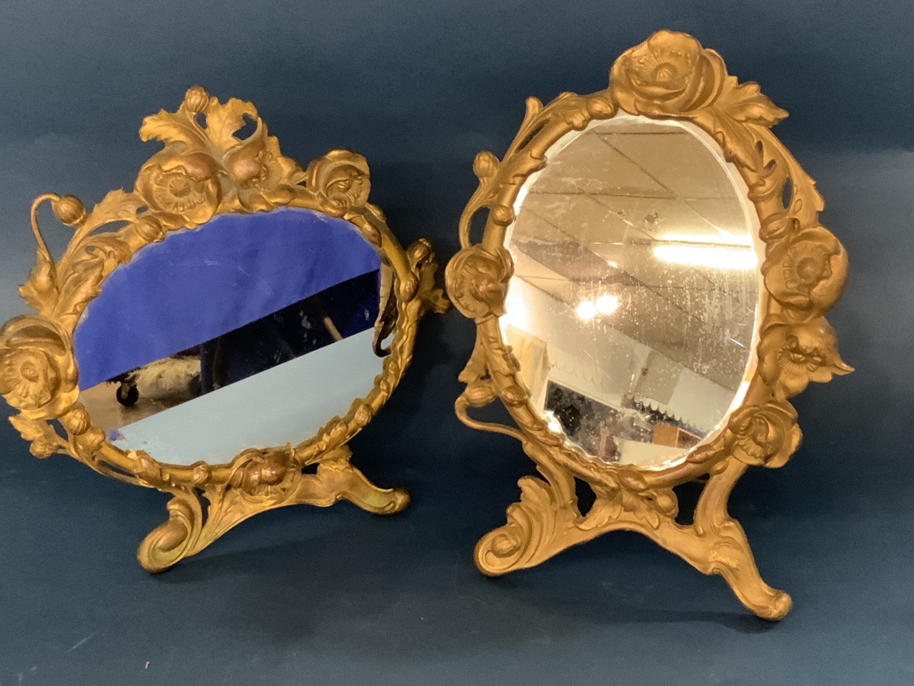Two Victorian easel back bronze mirror frames. Mirrored glass damage. Frames all original and showing excellet patina.