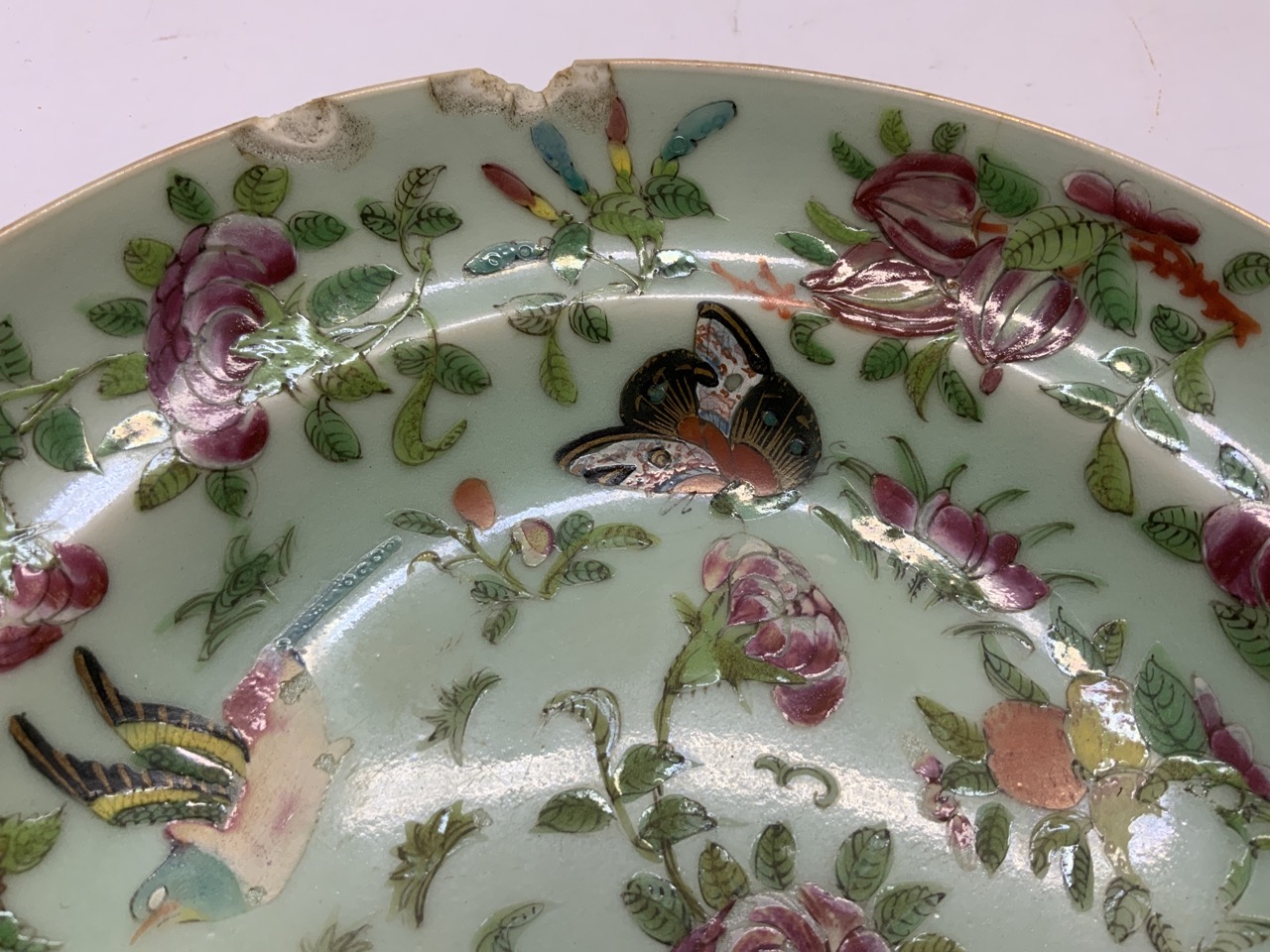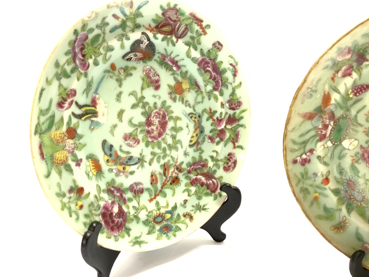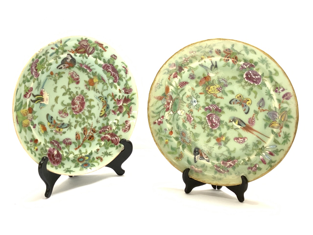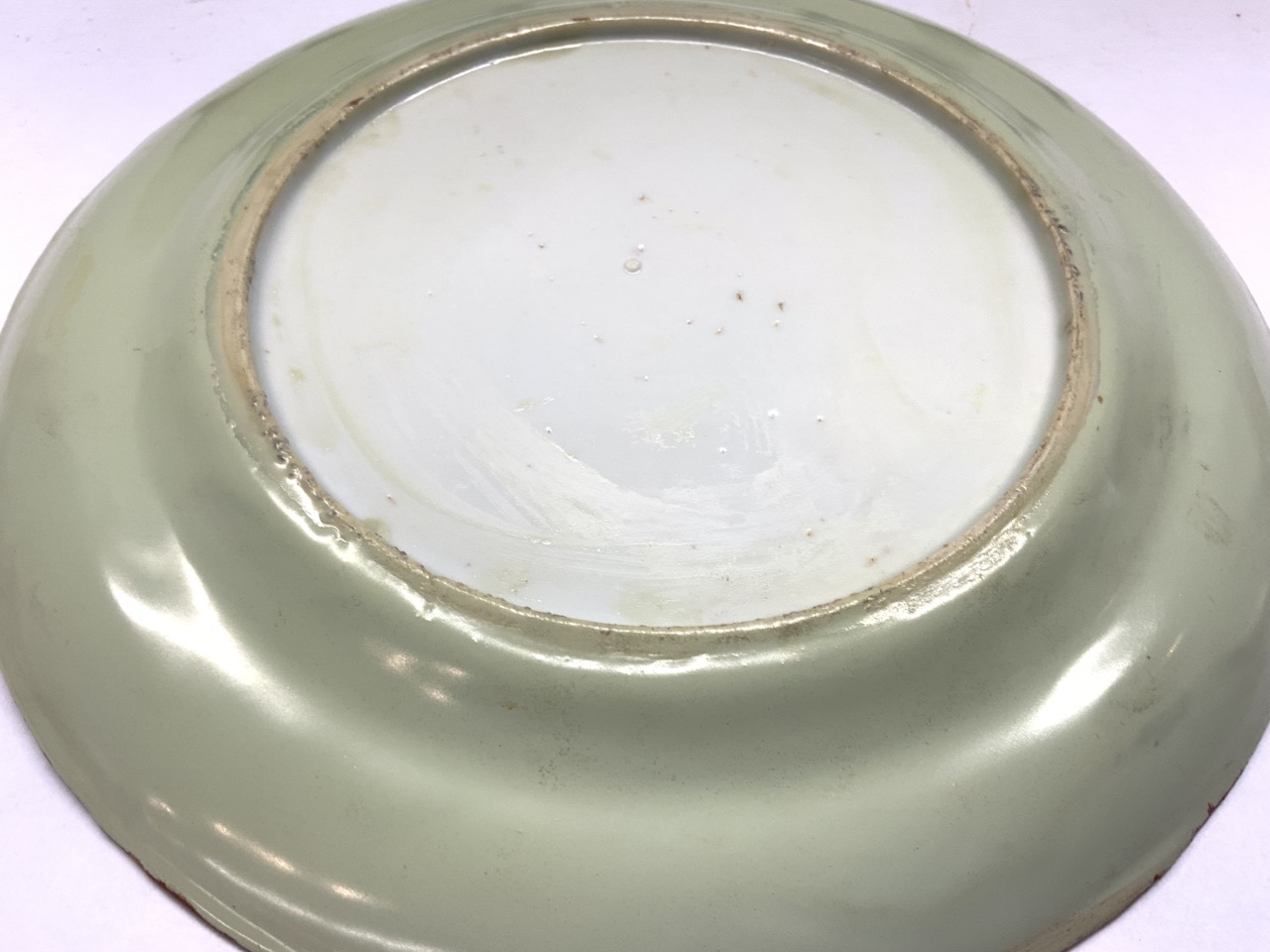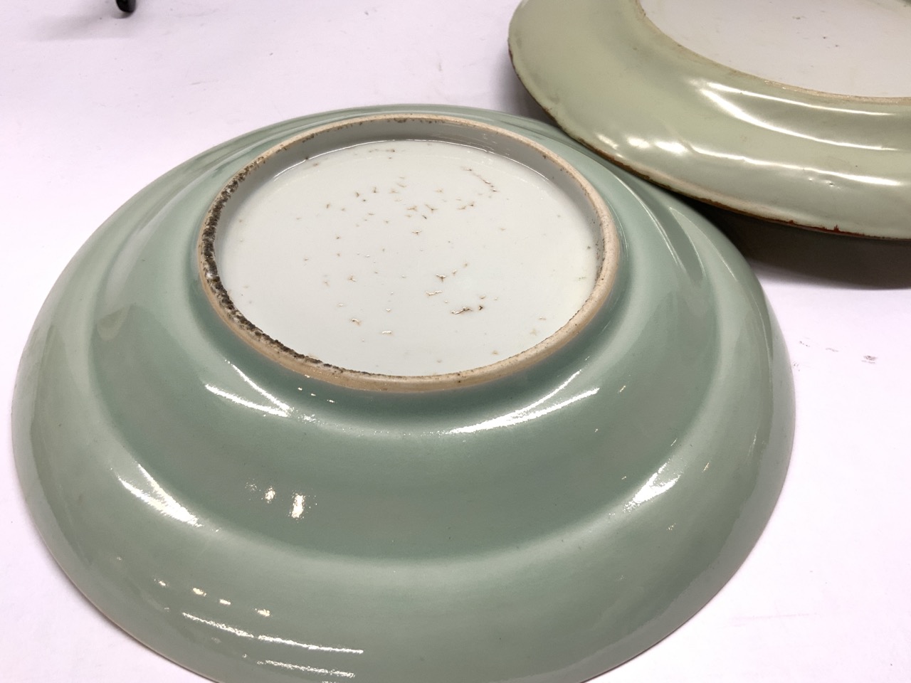 Two (2) Chinese Celadon porcelain plates. Restoration and chips noted.