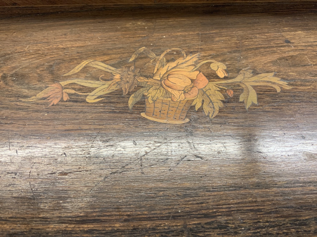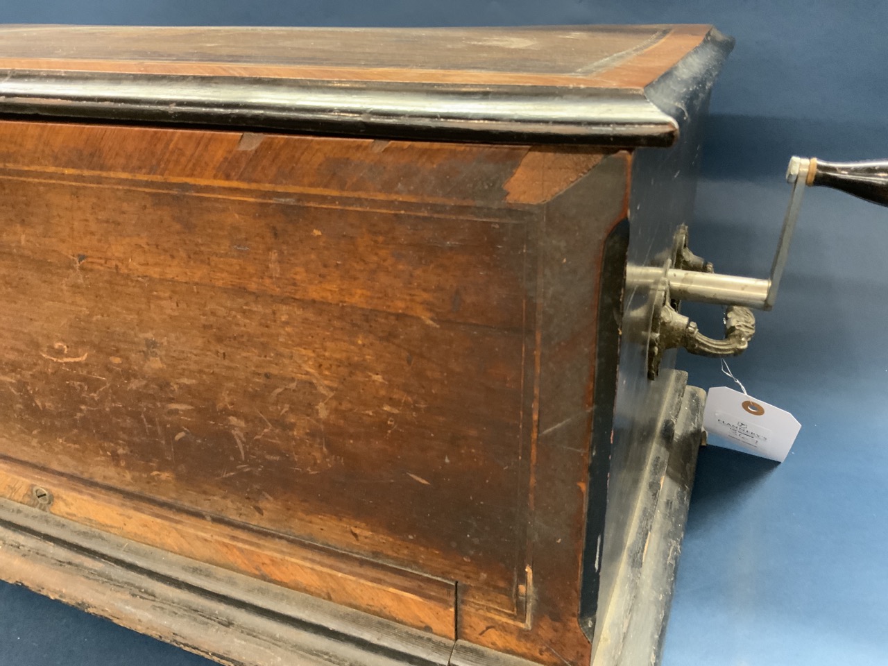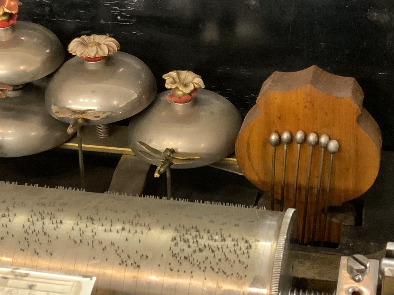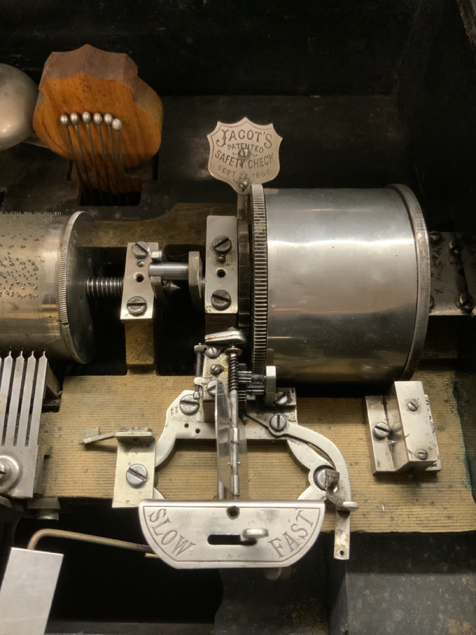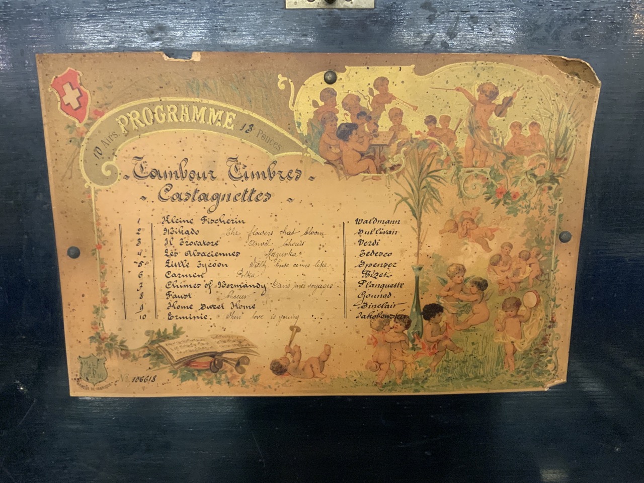 Jacot's 10 Tune Swiss Music Box.Patented 1885-1890. Switzerland. The box is most notable for the design of mallets in the form of insects with fine colored paint enameling. The box operates and plays except when handle is released charge becomes unwound and handle rapidly swings back. Repair needed. Drum covering has tear. Enamel work and mechanisms are very good. The outer casing has some finish wear. Marquetry inlay top sound.