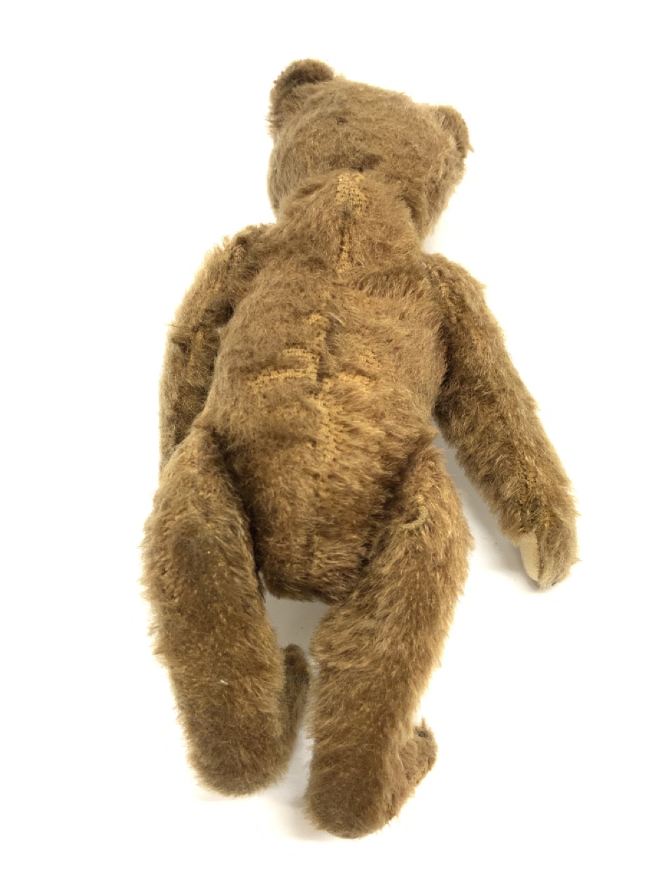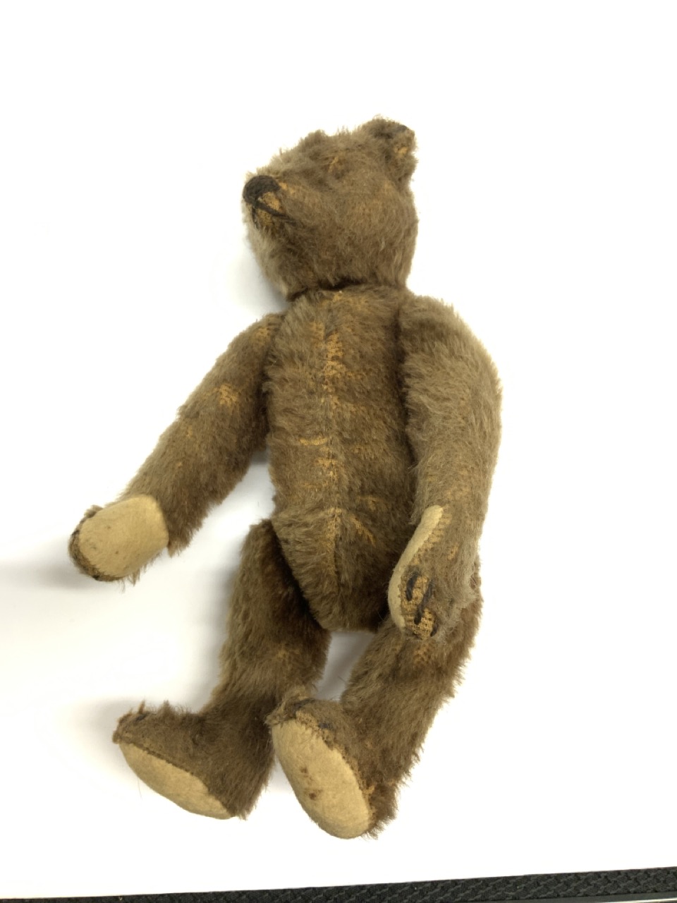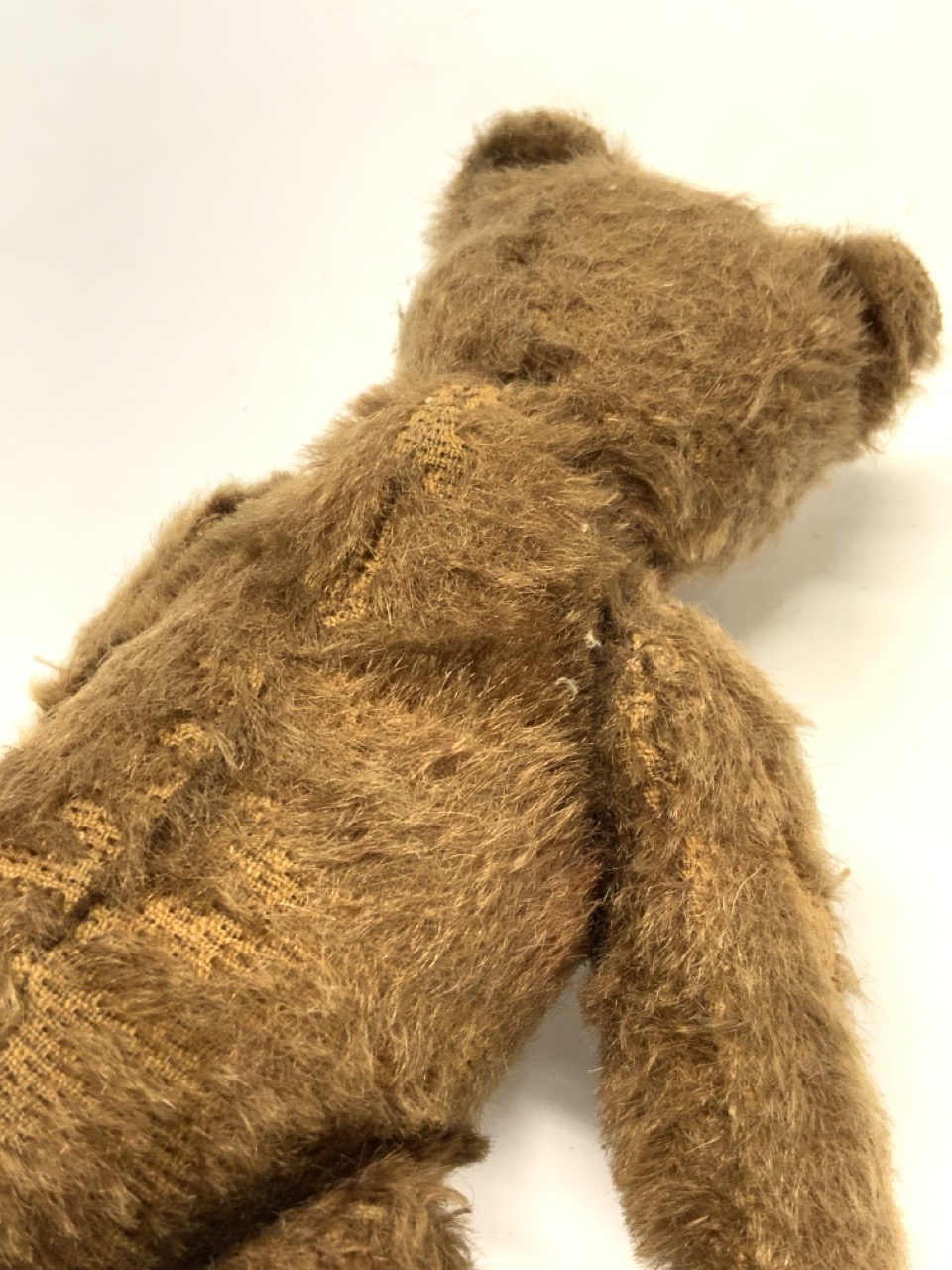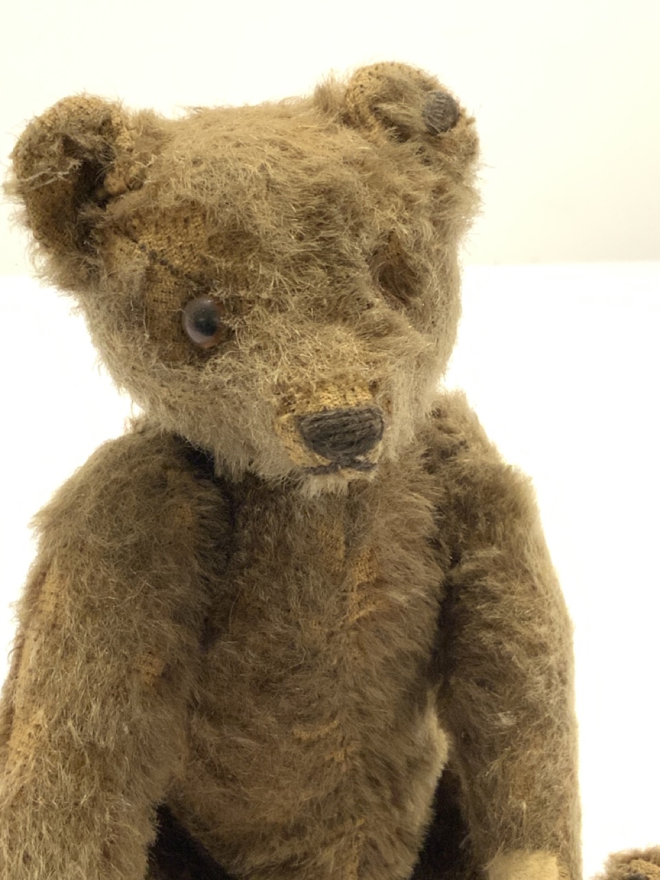 Misc.: Antique teddy bear collection including rare Schuco perfume and double headed compact, Steiff humpback bear, Early growler, mohair bears, 27” straw stuffed mohair bear, Americana jig toy, Dell paperback revolving store display book rack, Pine Bros. Advertising, 19th c. Carpenter’s chest with brass stud work and identified being owned by E.F. Foster of Ridgefield Connecticut, Fine red naugahyde loveseat (chesterfield style) and chair, Chinese marble top center table, Hudson Bay blanket, Navaho blanket, cast iron bear doorstop, antique Delft wall rack, collectibles, books, Fireman’s sand bucket, collection of Christmas “Santa” postcards, memorabilia and much more!