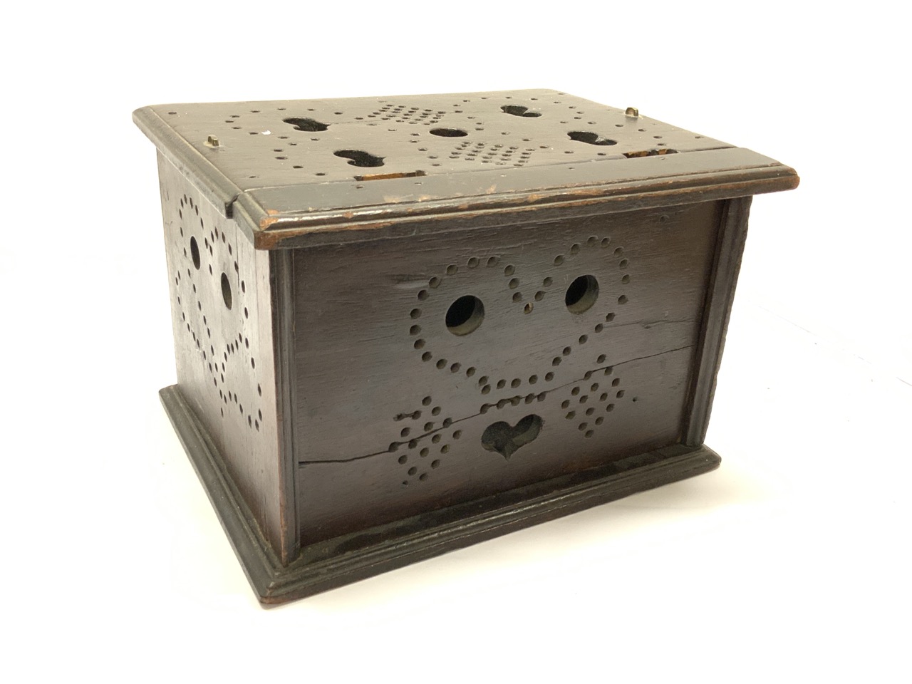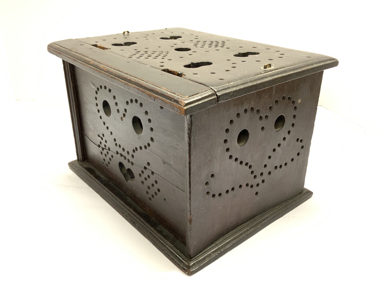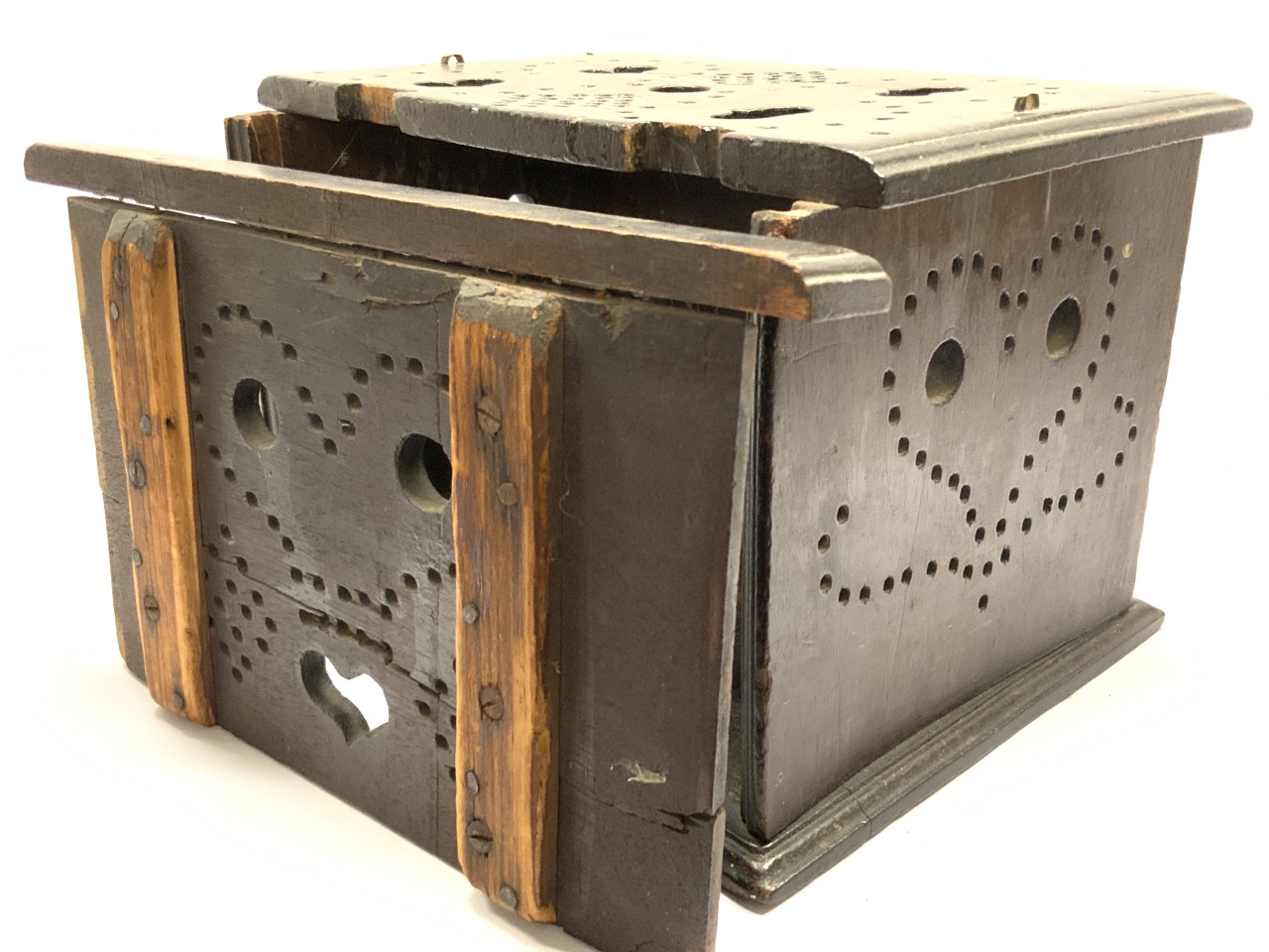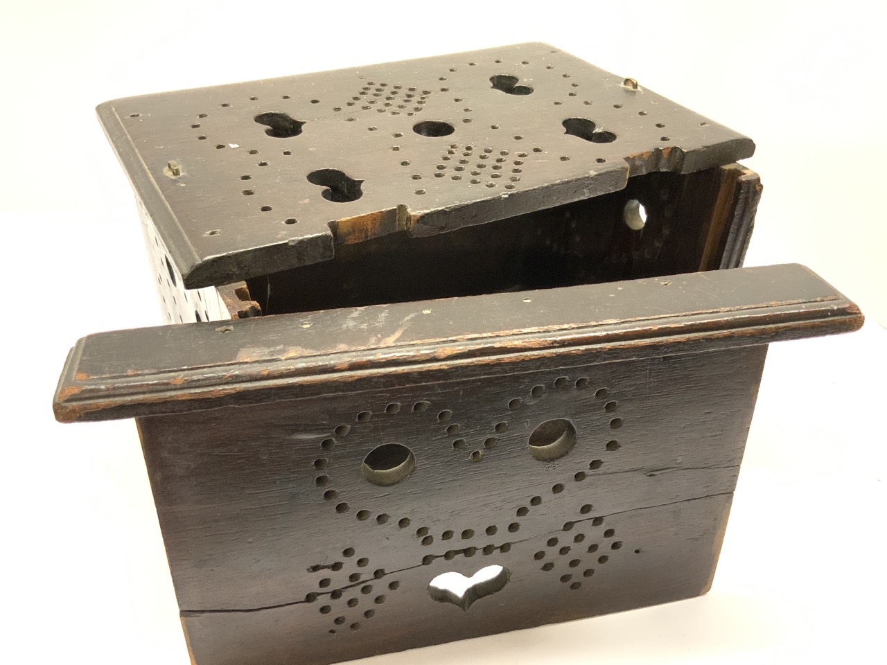 Antique Carriage Foot Warmer. American 19th century. Walnut hardwood. Cut out heart design.