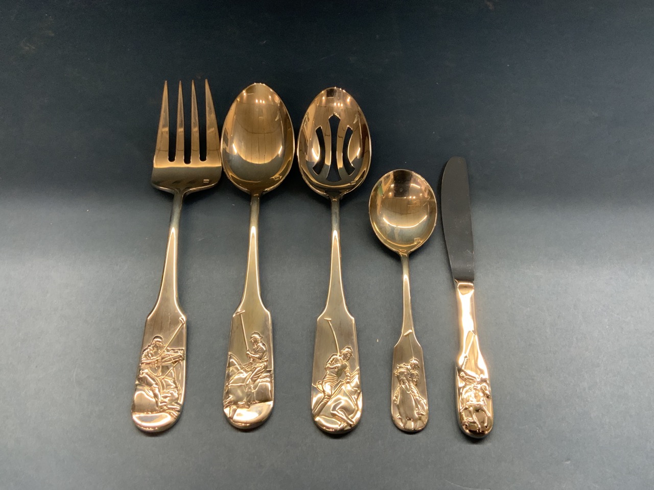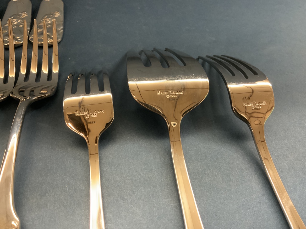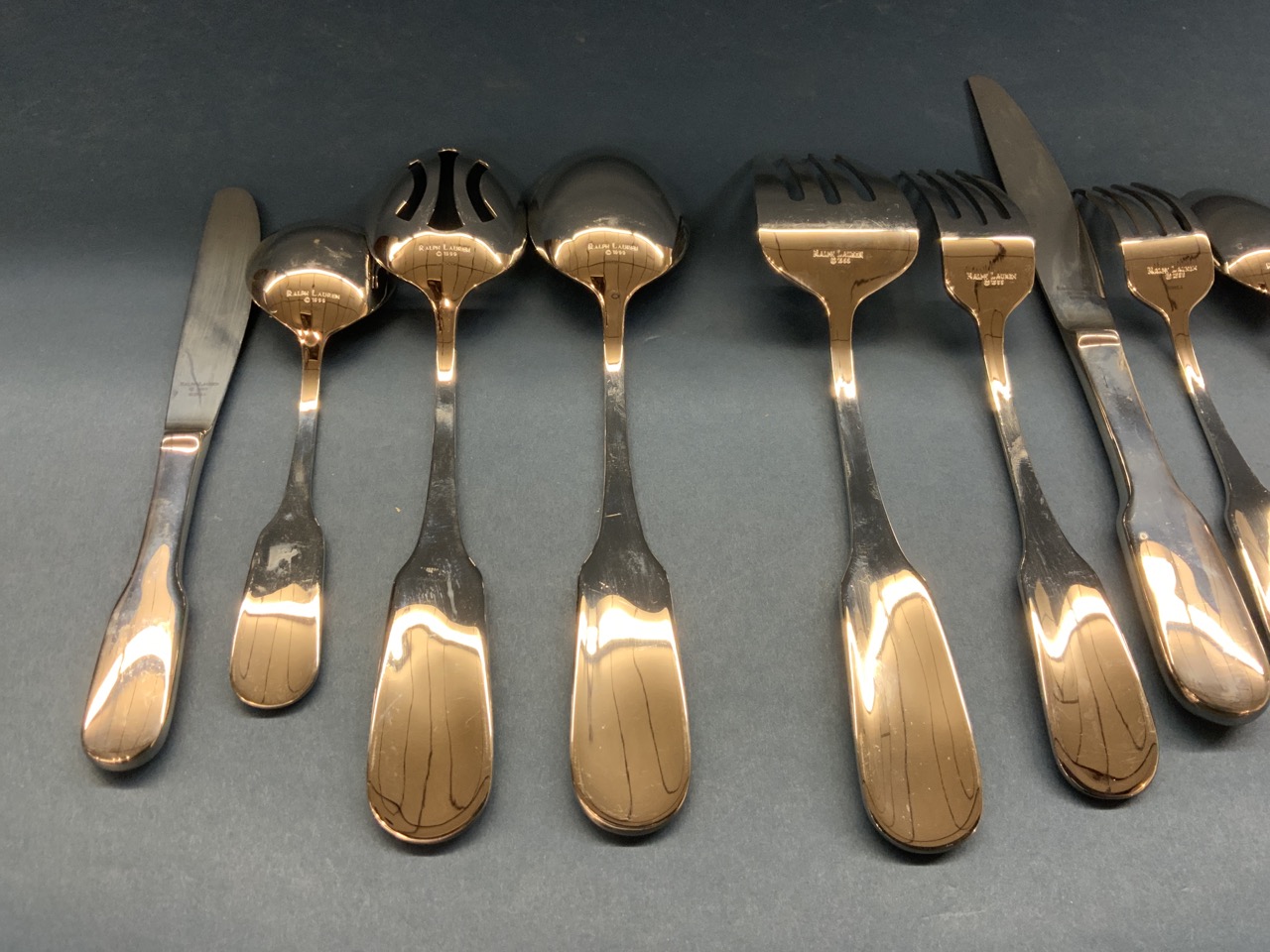 Ralph Lauren stainless flatware in the equestrian style "POLO" pattern. Pre-owned like new showing very minimal if any use. As seen in photograph preview.